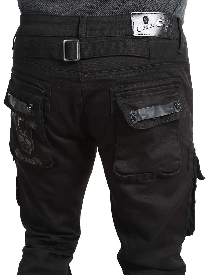 Wyjątkowe jeansy z wieloma kieszeniami. Misternie zdobione nitami w kształcie czaszki, skórzanymi paskami i zamkami na kolanach. Jeansy zapinane są na zamek błyskawiczny i mają szlufki w talii.