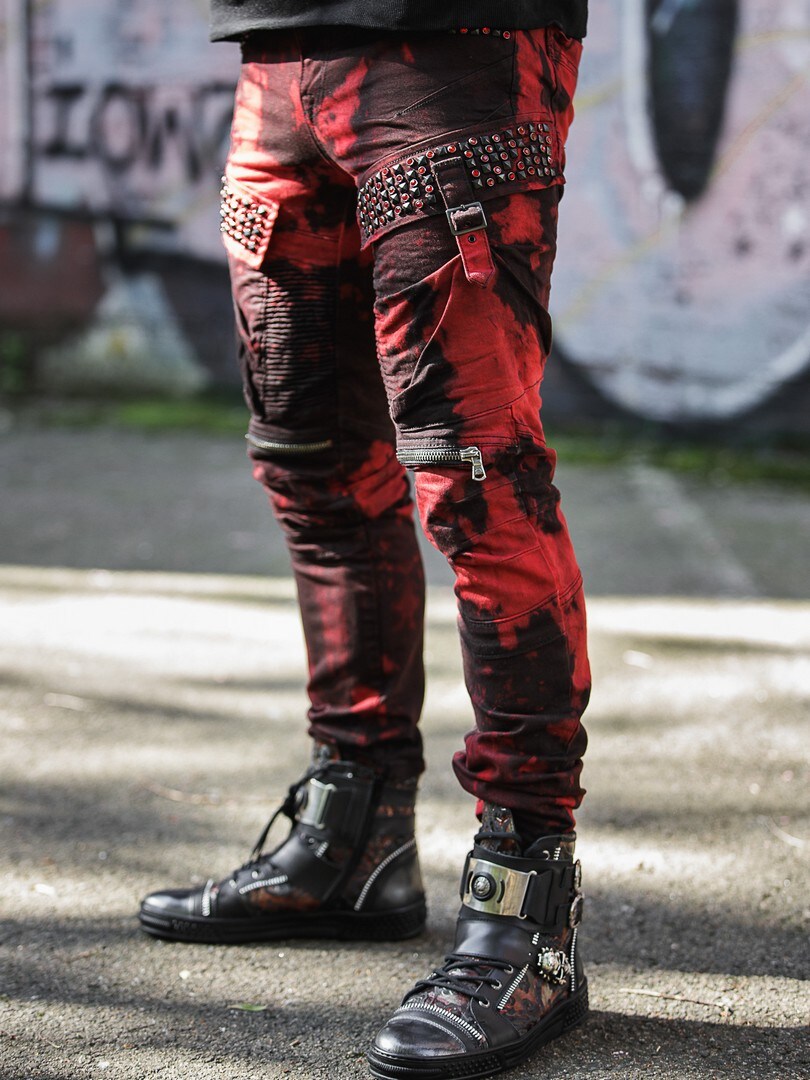 Spodnie inspirowane stylem militarnym, uzupełnione rockowymi detalami jak ćwieki, kamienie i zamki błyskawiczne. Praktyczne kieszenie z tyłu, z przodu i na nogawkach.