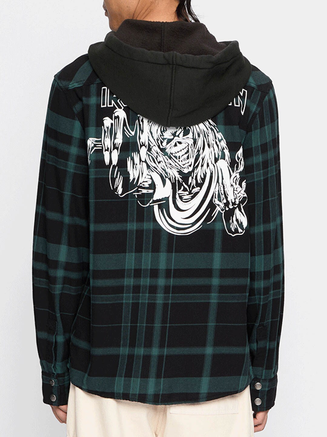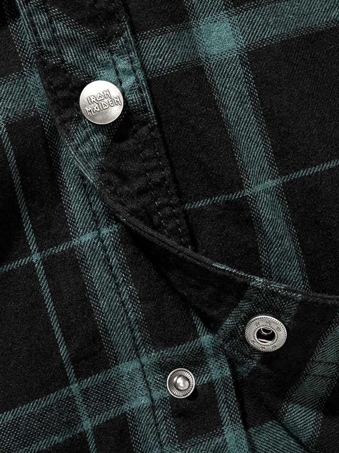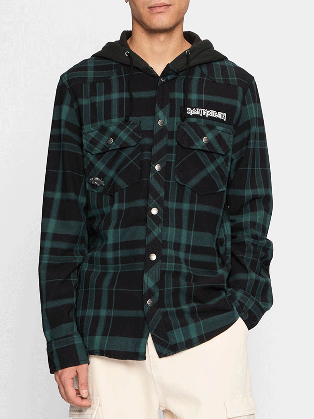 Połączenie klasycznej overshirt i bluzy z kapturem tworzy unikalny, rockowy wygląd. Wyposażona w guziki z logiem, patch Iron Maiden z przodu, duży nadruk Iron Maiden na plecach oraz odpinany metalpin. Posiada pojemny kaptur, regulowane mankiety i zapięcie na guziki.