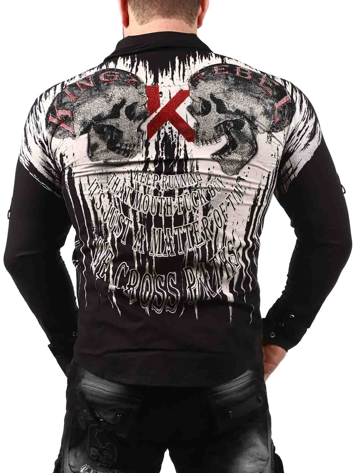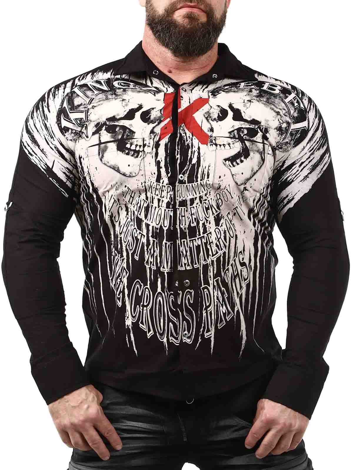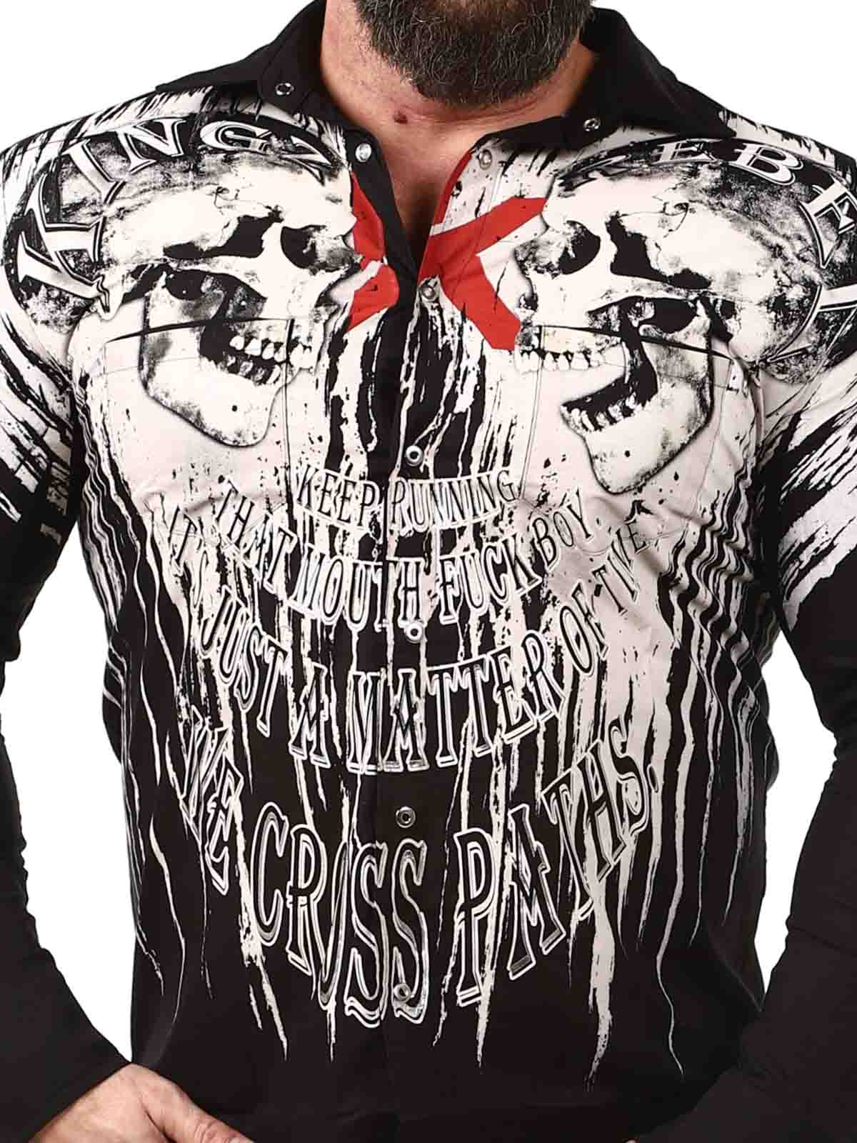 Czarna koszula ze stylowymi nadrukami w kontrastowych kolorach. Zaprojektowana z kołnierzem, grubymi guzikami i dwiema kieszeniami na piersi. Rękawy można podwinąć i zapiąć na pętelki.