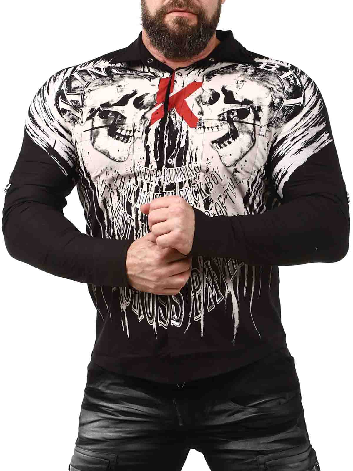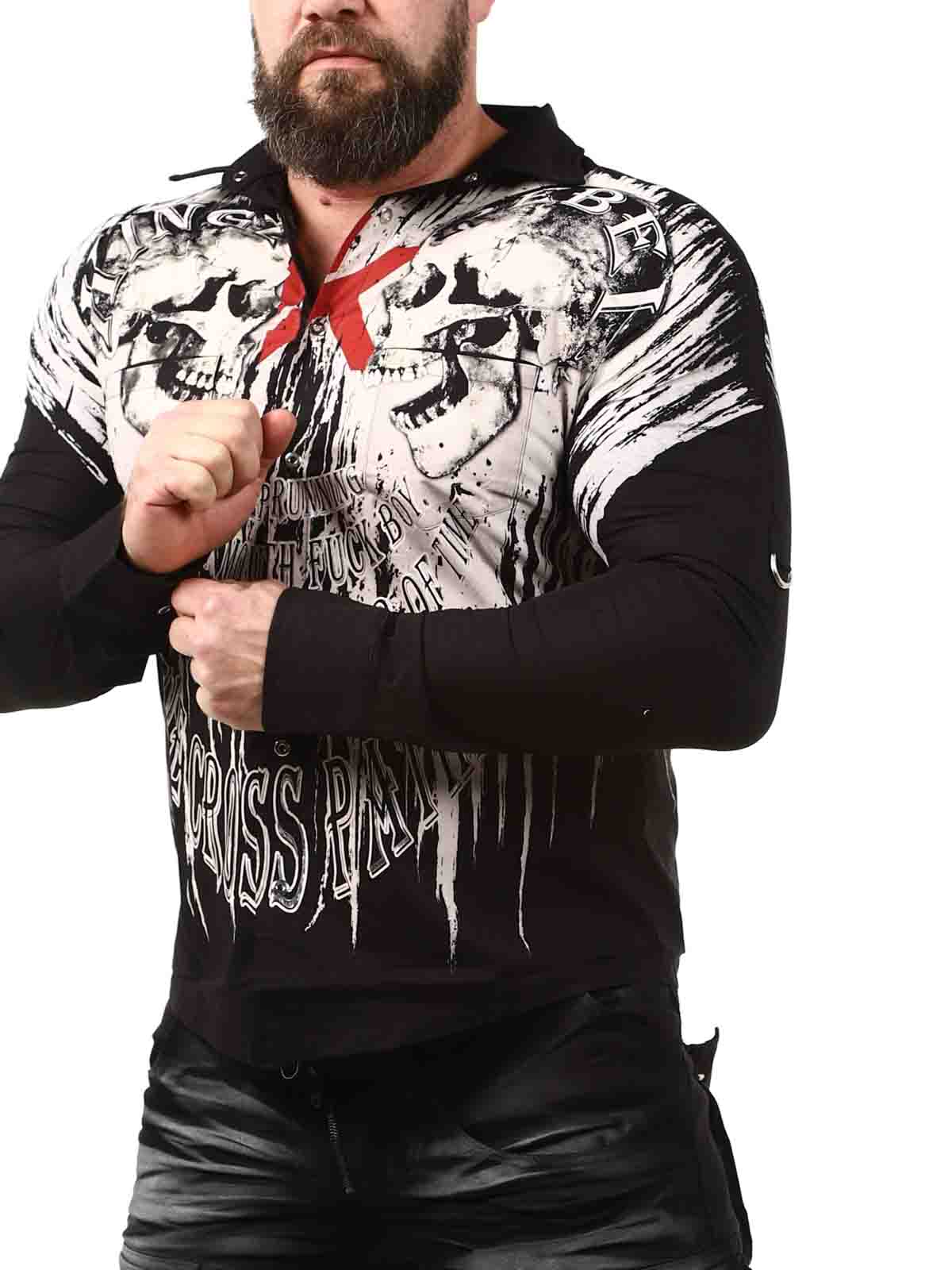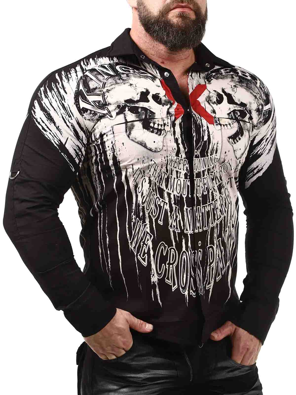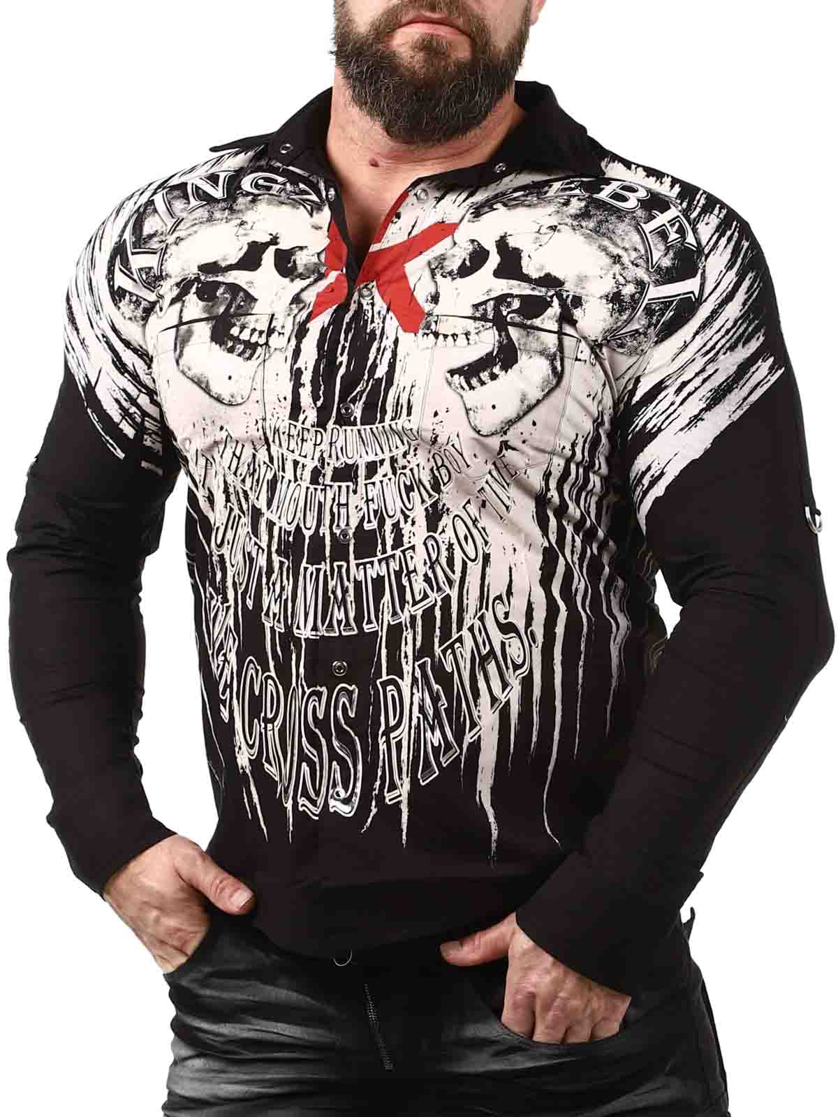 Czarna koszula ze stylowymi nadrukami w kontrastowych kolorach. Zaprojektowana z kołnierzem, grubymi guzikami i dwiema kieszeniami na piersi. Rękawy można podwinąć i zapiąć na pętelki.