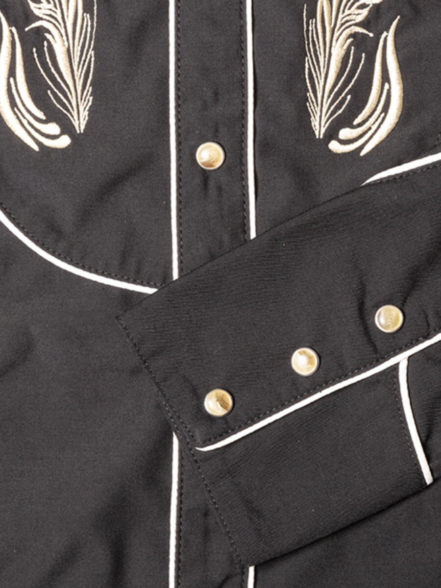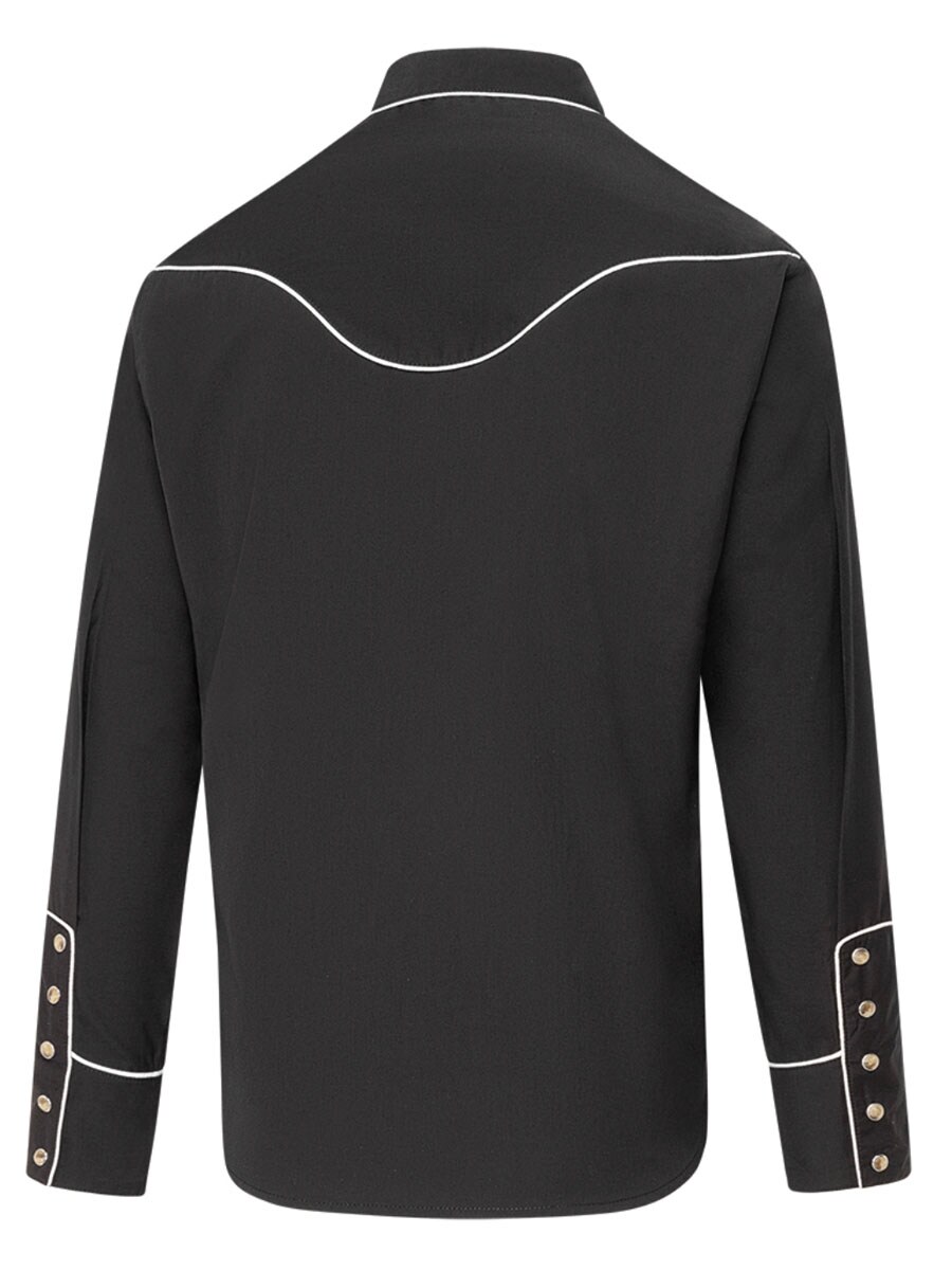 Czarna koszula westernowa o stylowym designie i charakterystycznych detalach. Koszula posiada ozdobny haft na piersi, który nadaje jej autentyczny styl westernowy i wyraźny kowbojski charakter. Kontrastowe lamówki podkreślają linie koszuli i dodają eleganckiego akcentu, który podkreśla design. Mieszanka poliestru i wiskozy sprawia, że koszula jest miękka, wygodna i trwała.