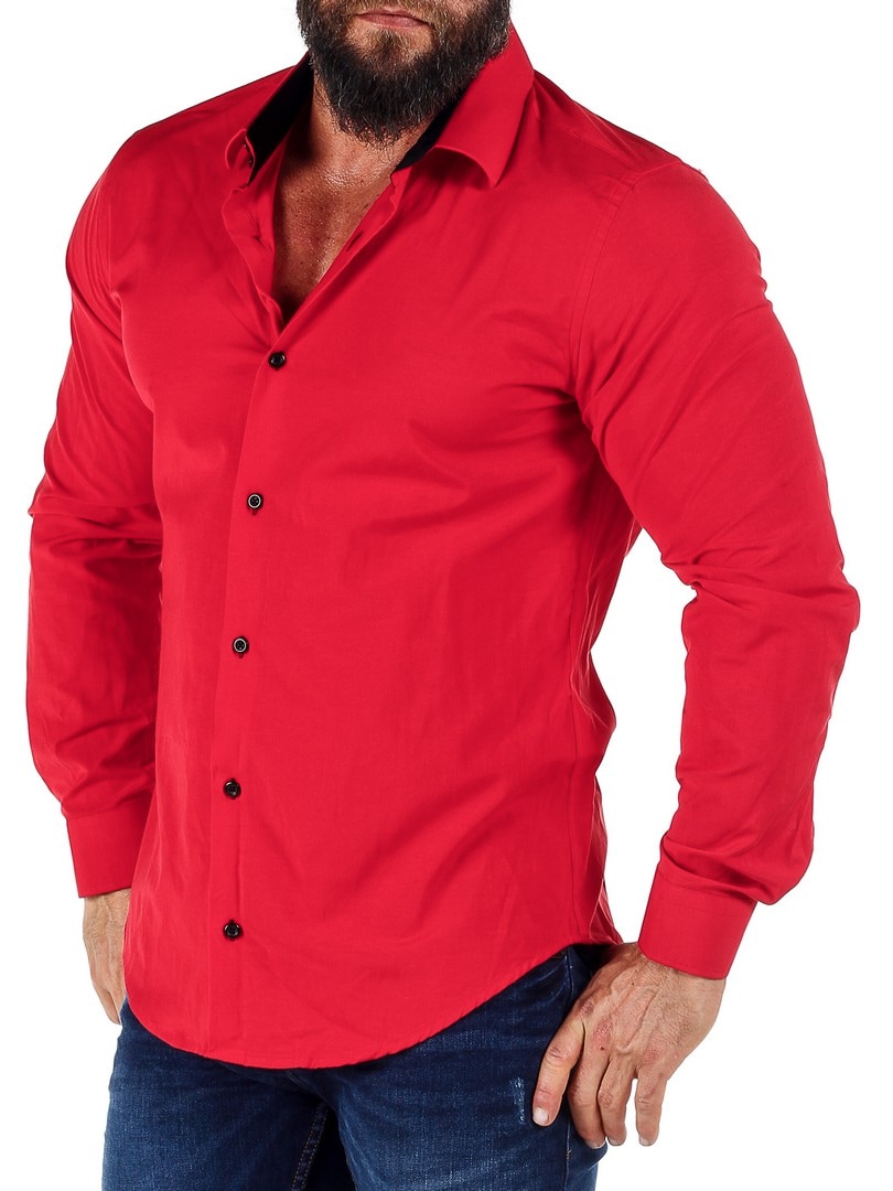Czerwona koszula ze stylowym czarnym kontrastem w wewnętrznej części kołnierza, z czarnymi guzikami na rękawach i wewnątrz rękawów. Wykonana z doskonałej jakości bawełny z domieszką stretchu.