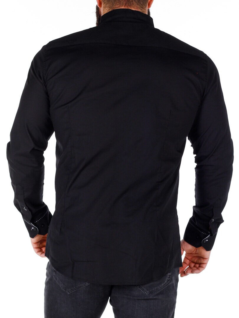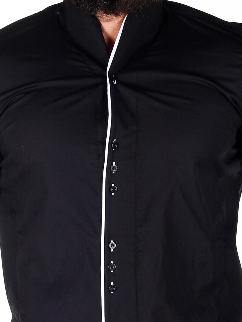 Elegancka czarna koszula, która rzuca wyzwanie klasycznemu stylowi. Wykonany z miękkiej bawełny z domieszką elastanu, ma czarne guziki i dopasowany krój. Posiada kontrastujące białe detale, które nadają ładny efekt czarnej podstawie.