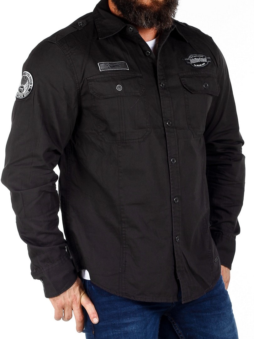 Koszula inspirowana stylem retro, o prostym kroju, z dwiema kieszeniami na piersi zapinanymi na guziki. Naszywki z logo na rękawie i klatce piersiowej. Zaokrąglony dół.