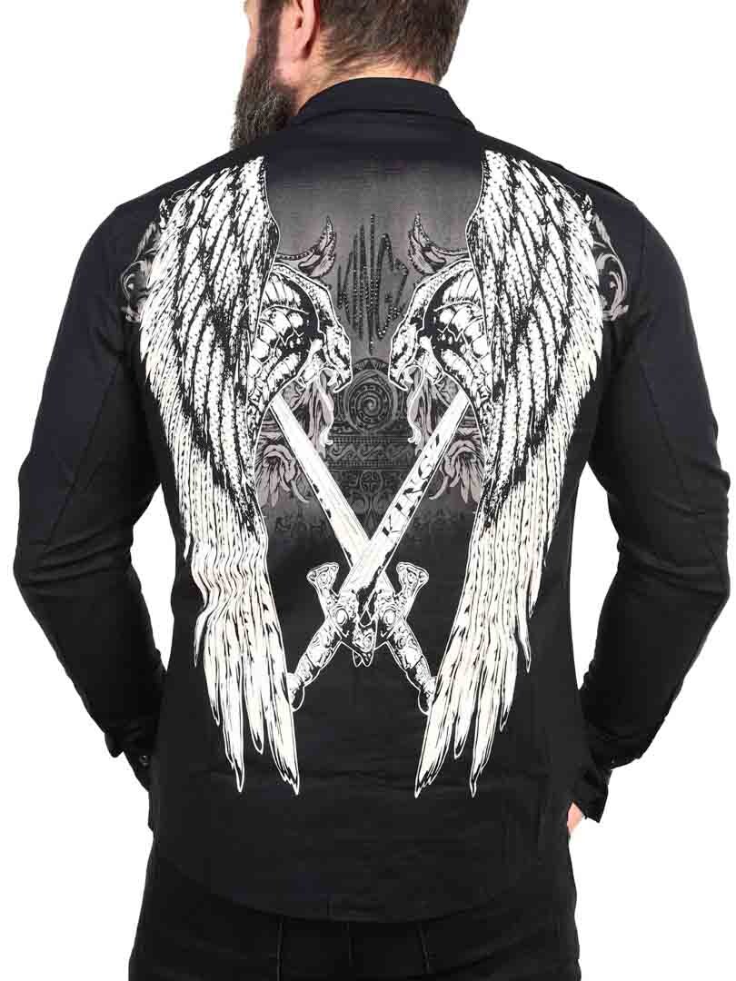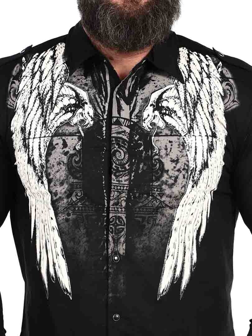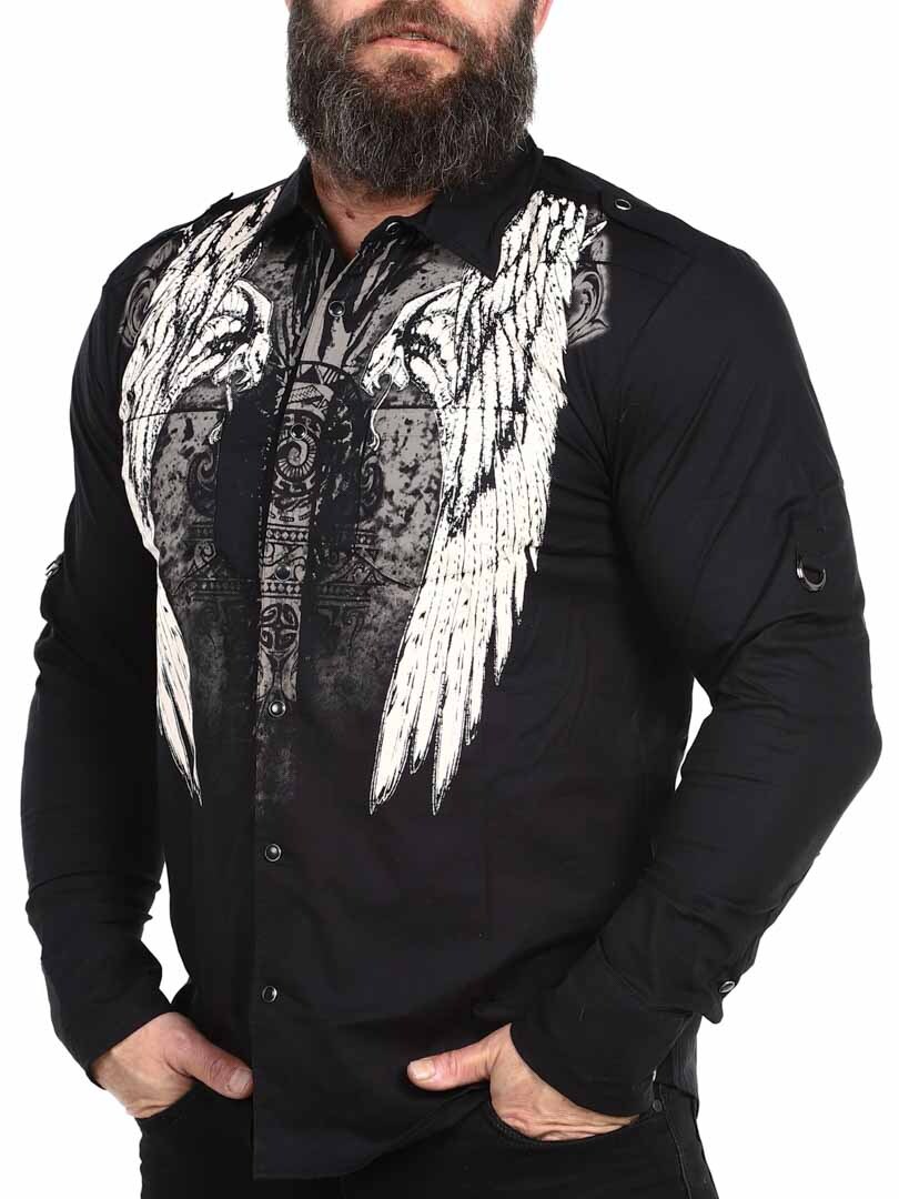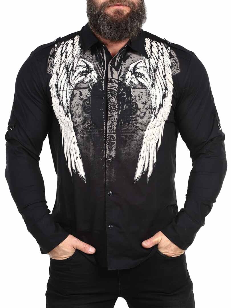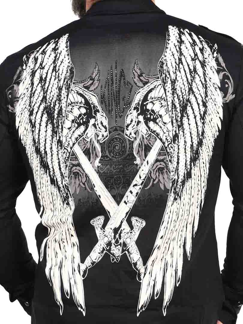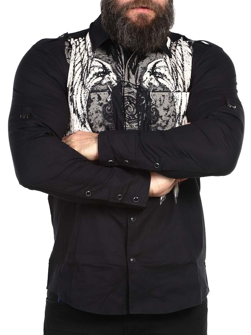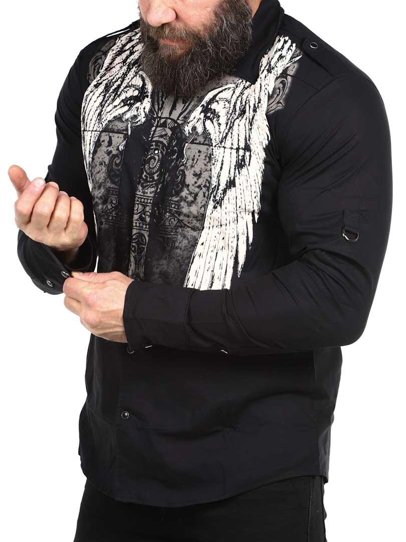 Czarna koszula ze stylowymi nadrukami w kontrastowych kolorach. Zaprojektowana z kołnierzem, grubymi guzikami i dwiema kieszeniami na piersi. Rękawy można podwinąć i zapiąć na pętelki.