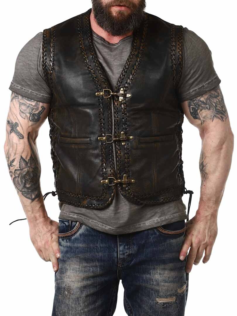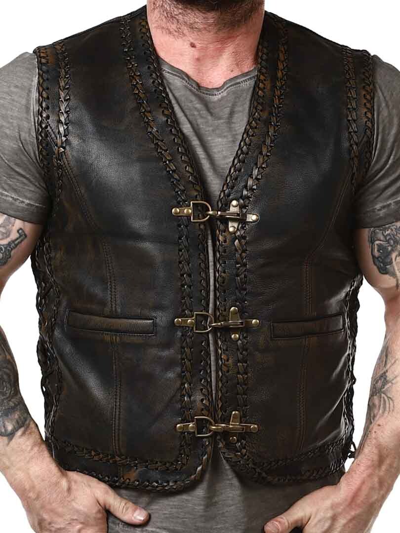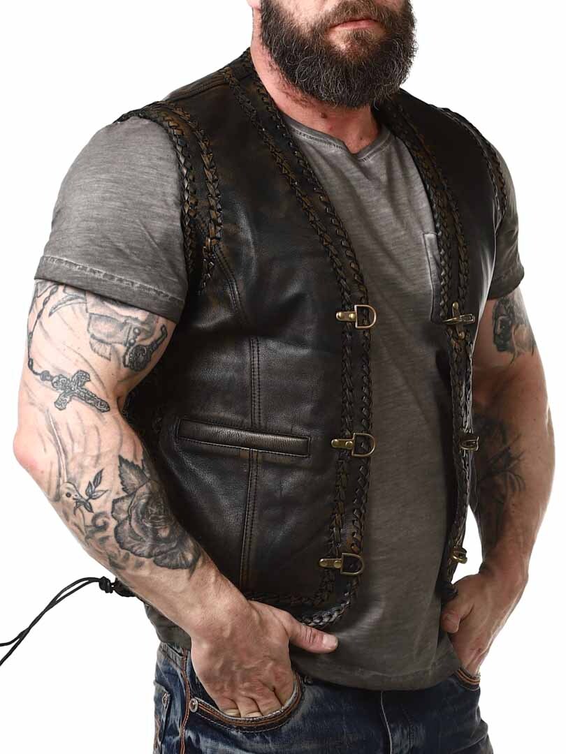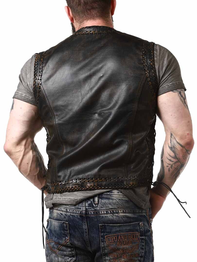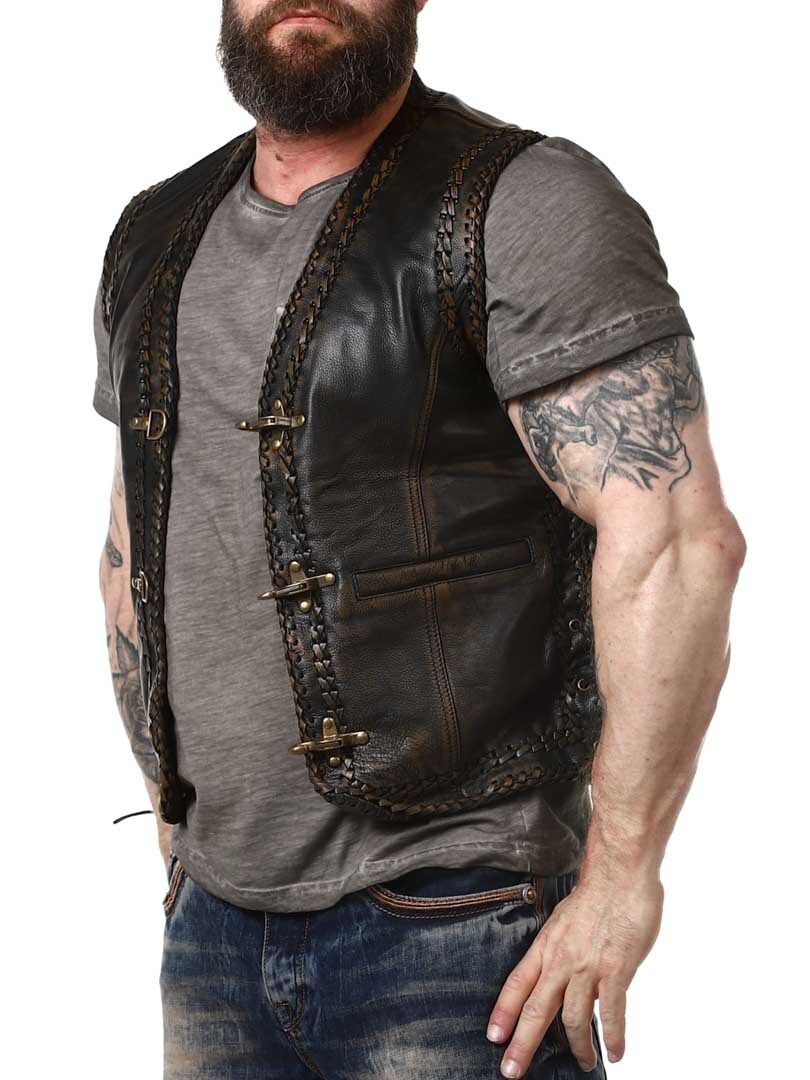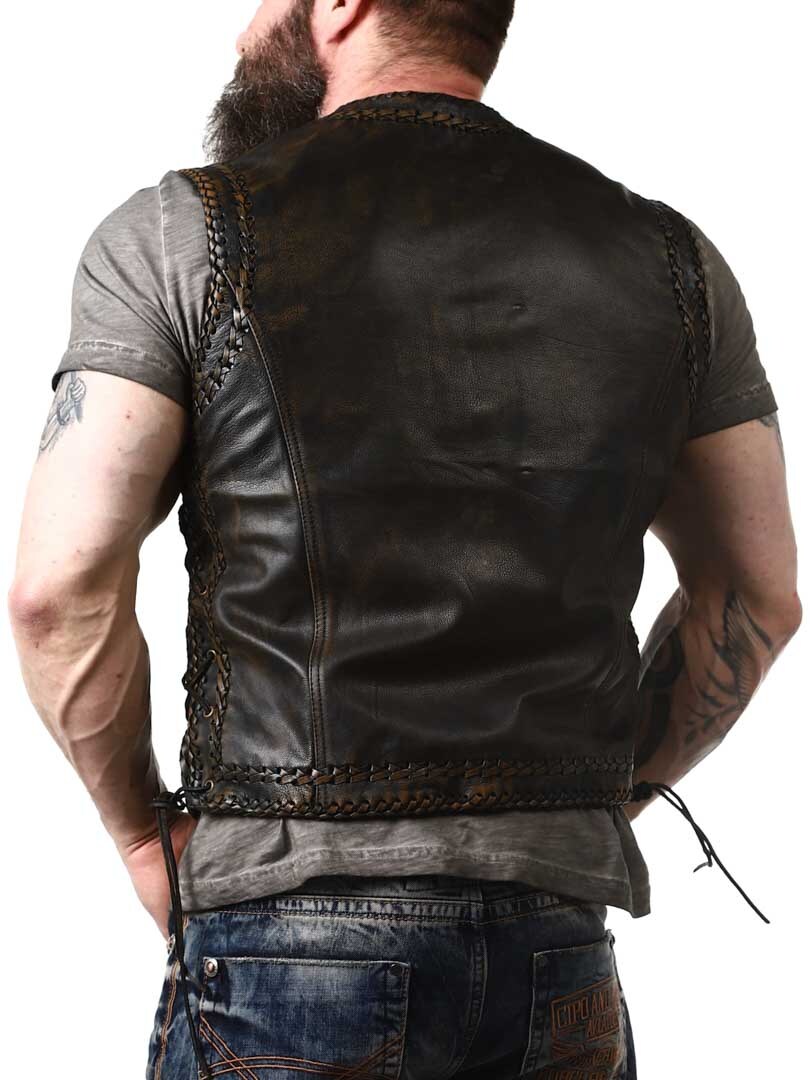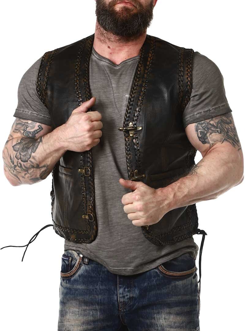 Kamizelka z prawdziwej skóry o stylowym wyglądzie vintage z ozdobą w postaci plecionej skóry. Posiada dwie kieszenie z przodu i dwie wewenętrzne. Regulowana po bokach sznurówkami. Kamizelka zapinana jest za pomocą solidnych, metalowych klamer. Dostępny tylko w RockDenim!