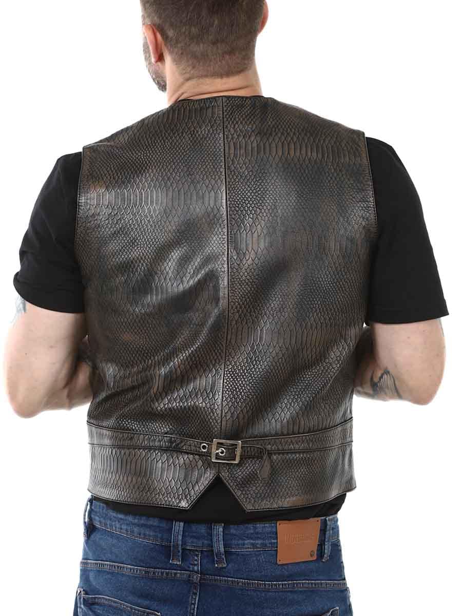 Ta stylowa skórzana kamizelka jest wykonana z prawdziwej skóry bydlęcej, która zapewnia trwałą i solidną jakość. Kamizelka ma klasyczny design z dekoltem w kształcie litery V, srebrnymi zatrzaskami i wieloma kieszeniami. Idealna, aby uzyskać solidny i ponadczasowy wygląd, niezależnie od tego, czy jest noszona na motocyklu, imprezach rockowych czy na co dzień!