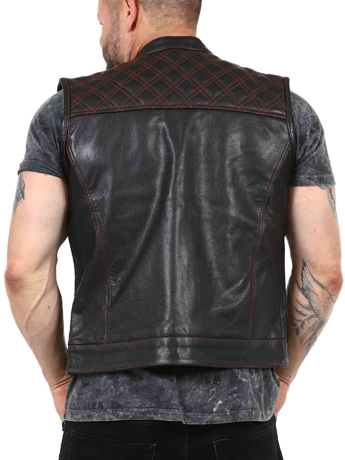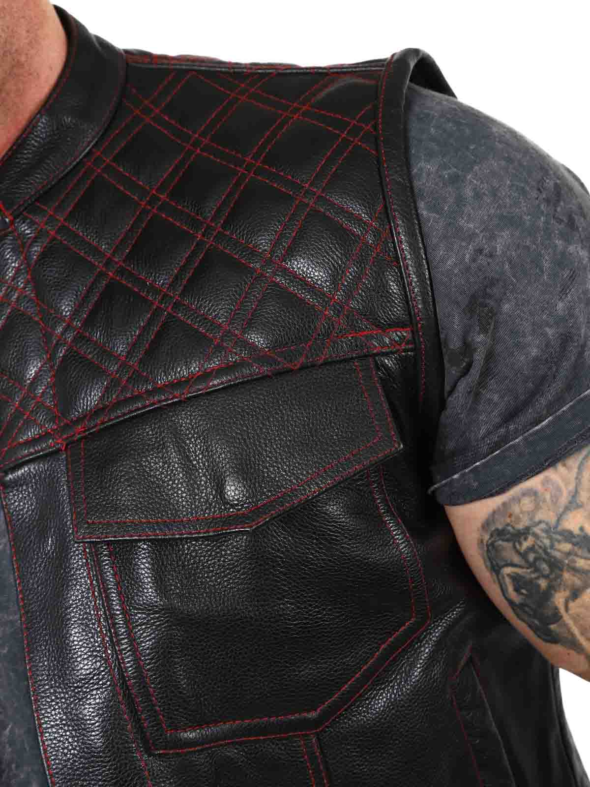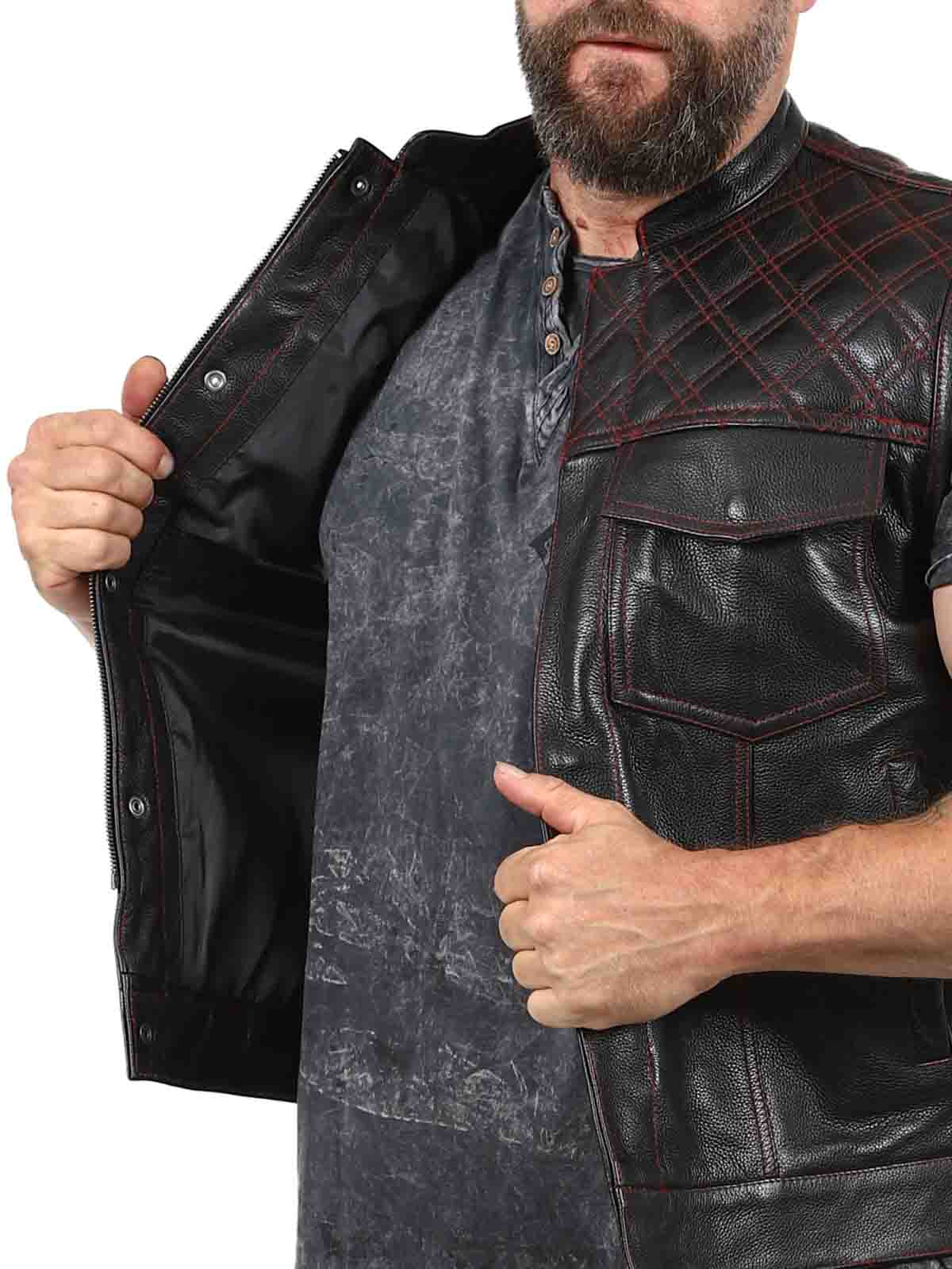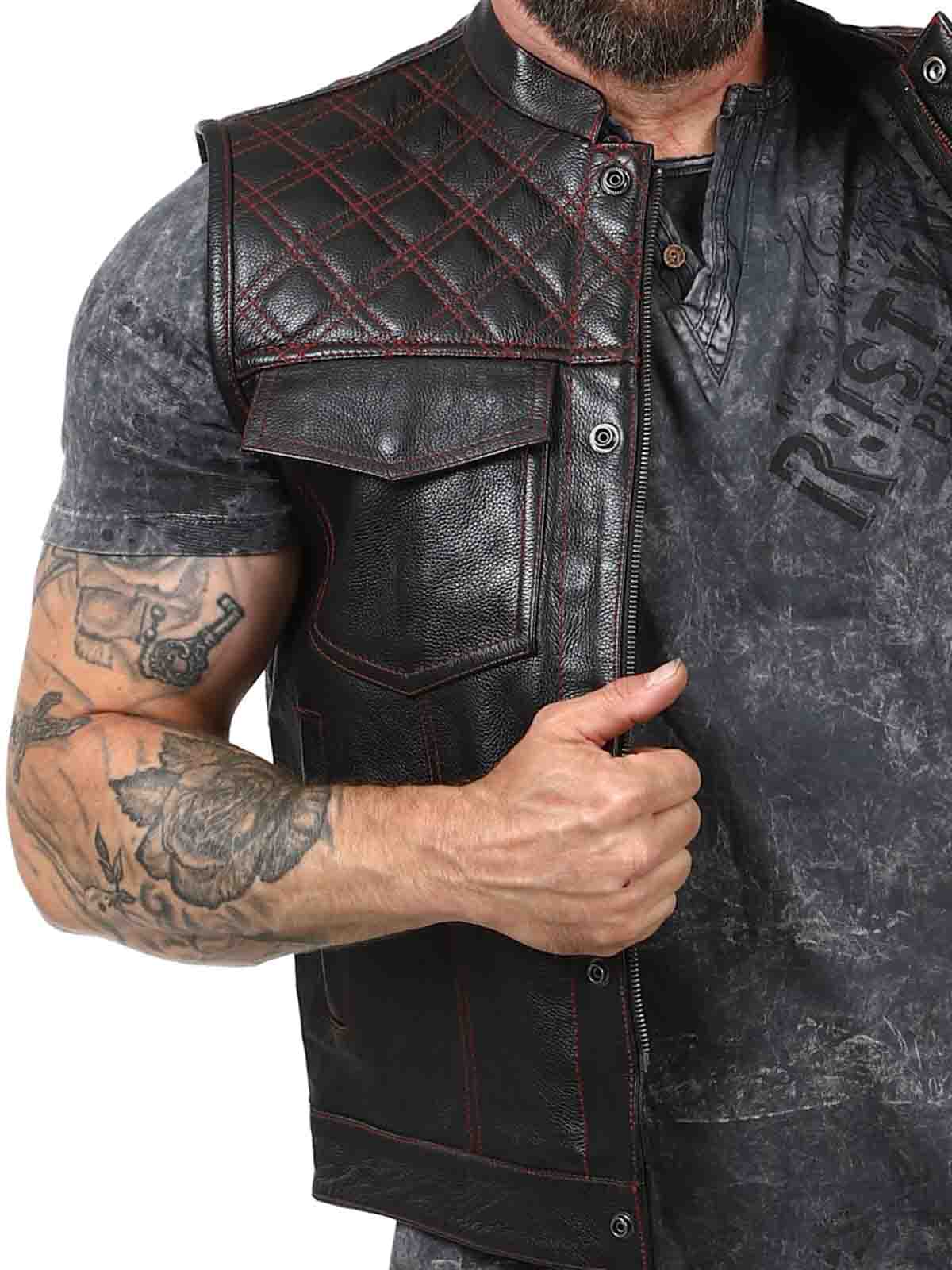 Solidna kamizelka ze skóry naturalnej z niskim kołnierzem. Posiada dwie zapinane kieszenie na piersi, dwie otwarte kieszenie na brzuchu i dwie otwarte kieszenie wewnętrzne. Kamizelka zapinana jest zarówno na zamek błyskawiczny, jak i guziki. Tę kamizelkę można znaleźć tylko w Rockdenim!