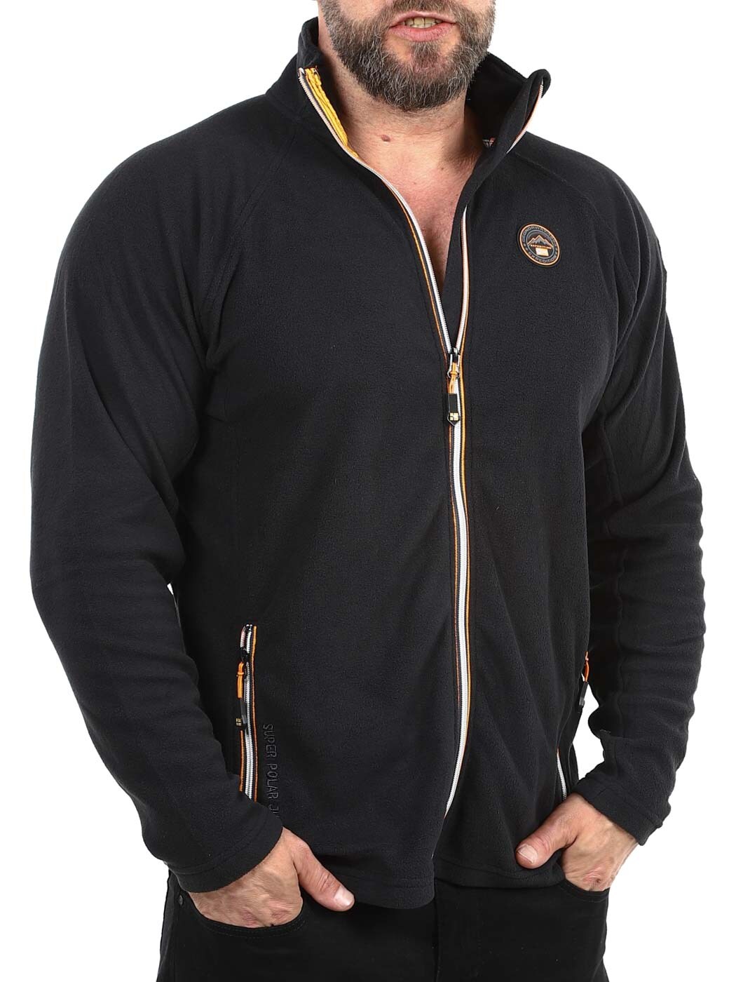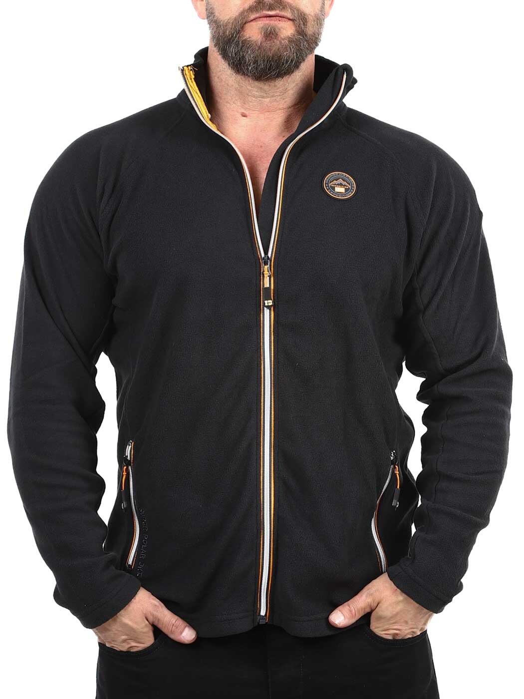 Kurtka zapewniająca zarówno wygodę, jak i funkcjonalność. Wykonana jest z miękkiego i ciepłego polaru, posiada zamek błyskawiczny oraz dwie zapinane kieszenie na brzuchu. Ozdobiona pomarańczowymi szwami oraz naszywką na piersi i rękawie.