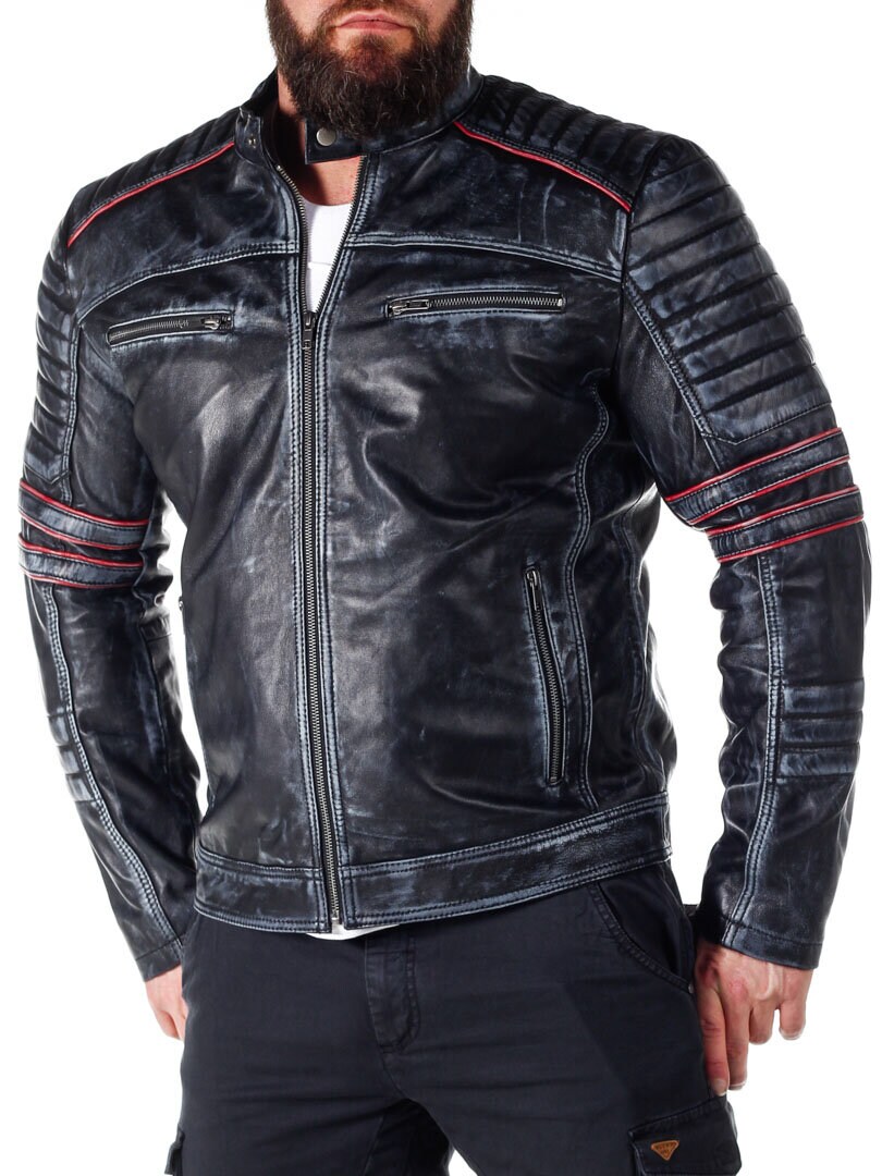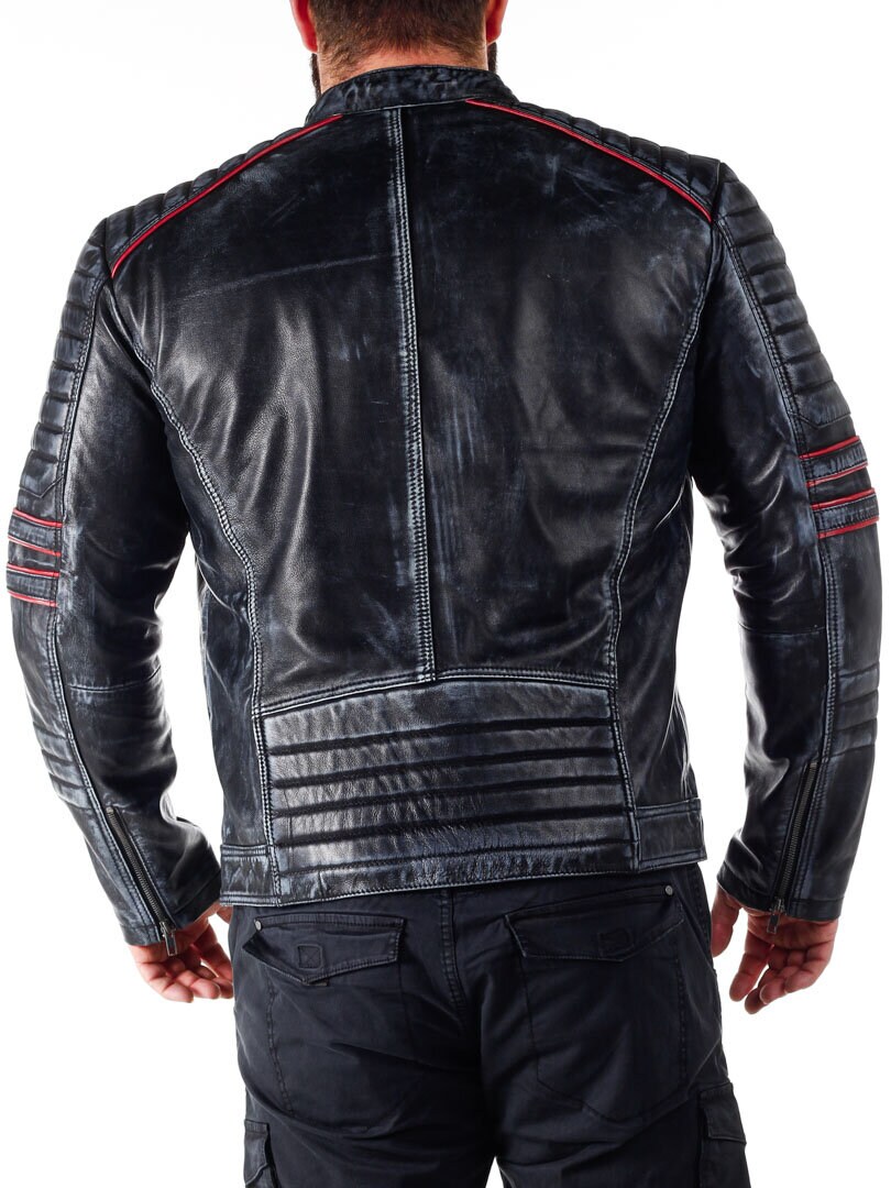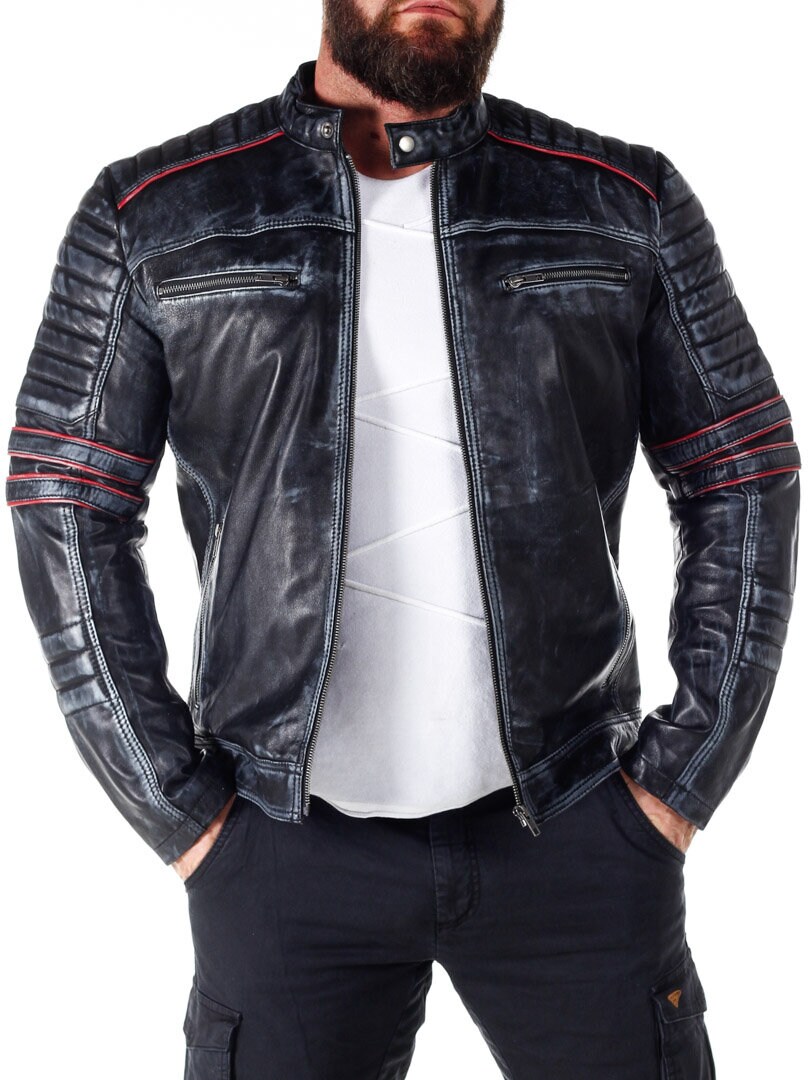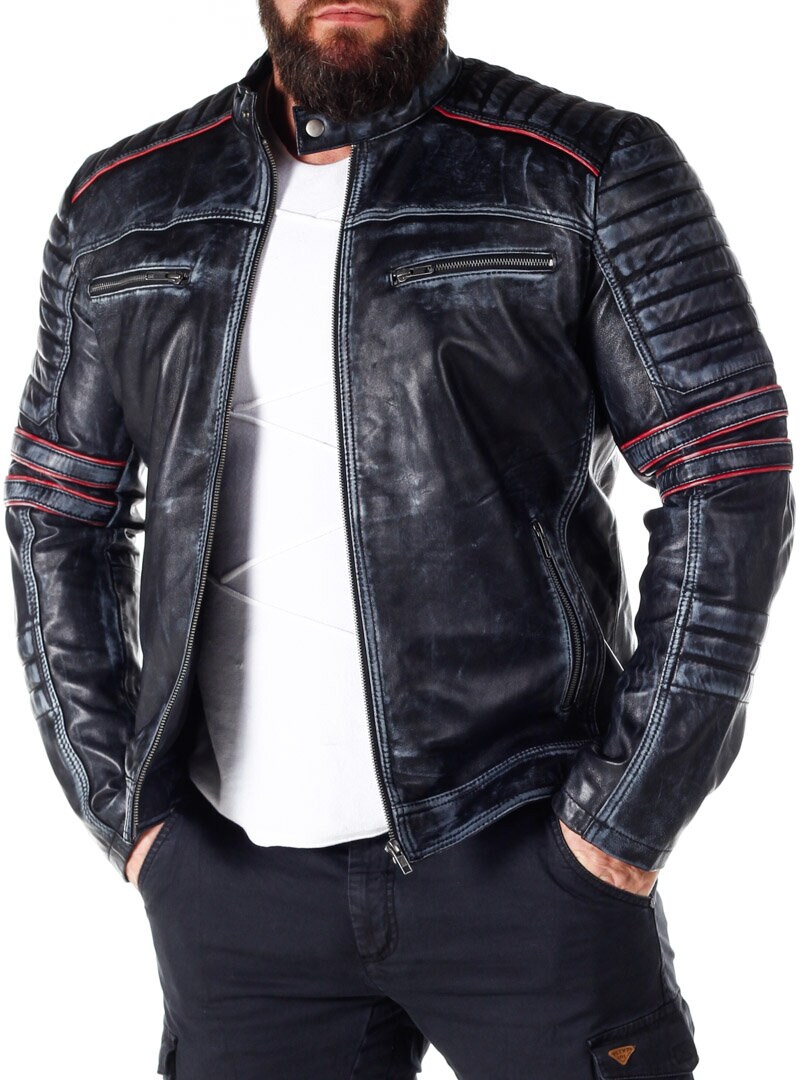 Mocna kurtka z prawdziwej skóry o znoszonym wyglądzie. Posiada niski kołnierz zapinany na guziki, wyściełane części i detale w kontrastowym kolorze. Cztery zamykane kieszenie z przodu i dwie kieszenie wewnętrzne. Tę kurtkę znajdziesz tylko u nas!