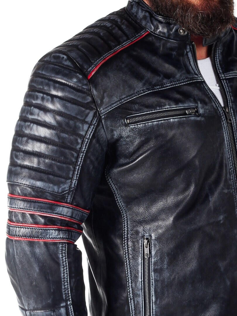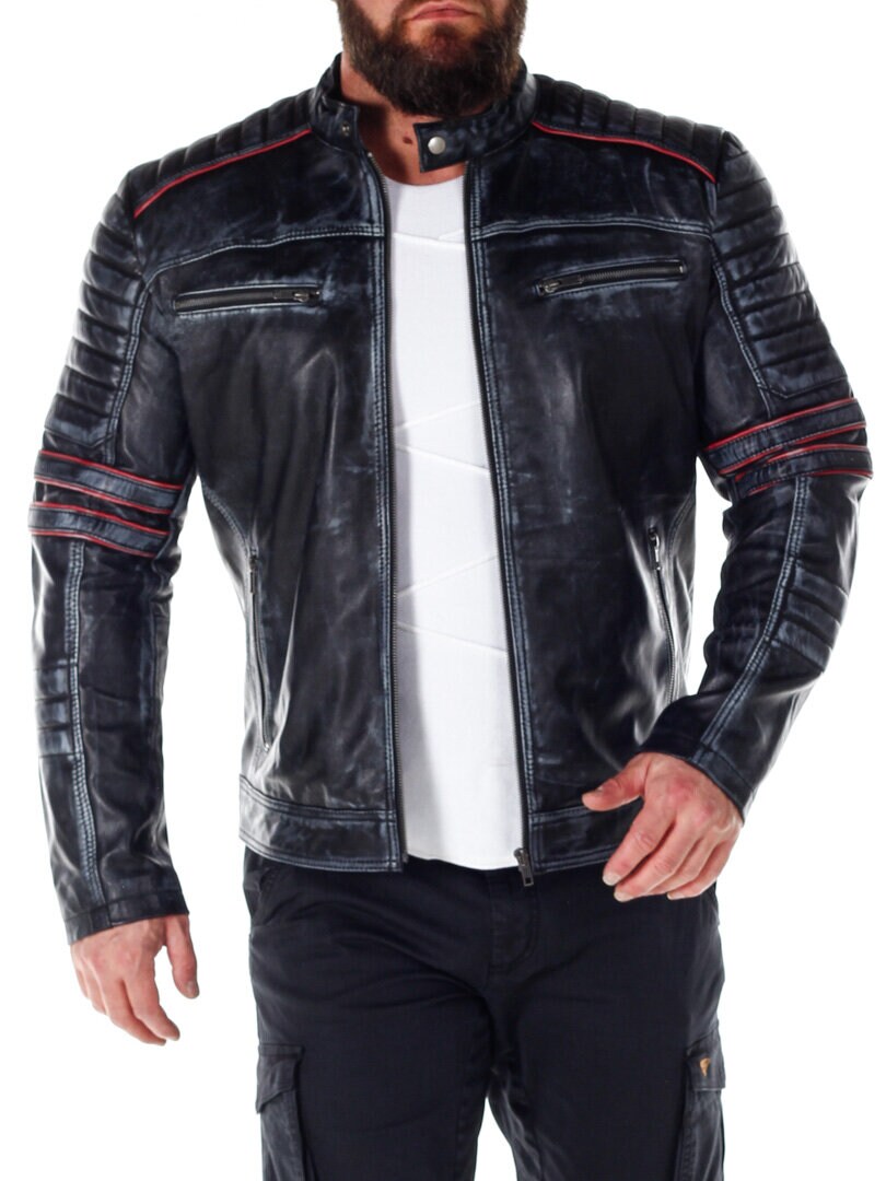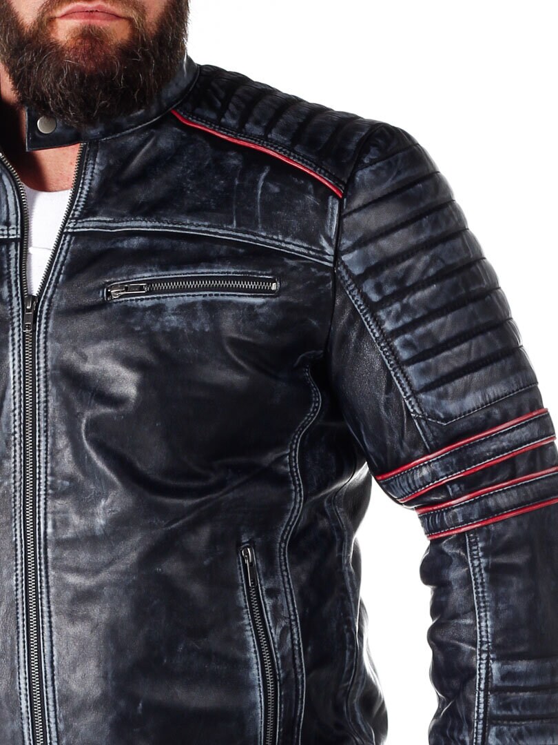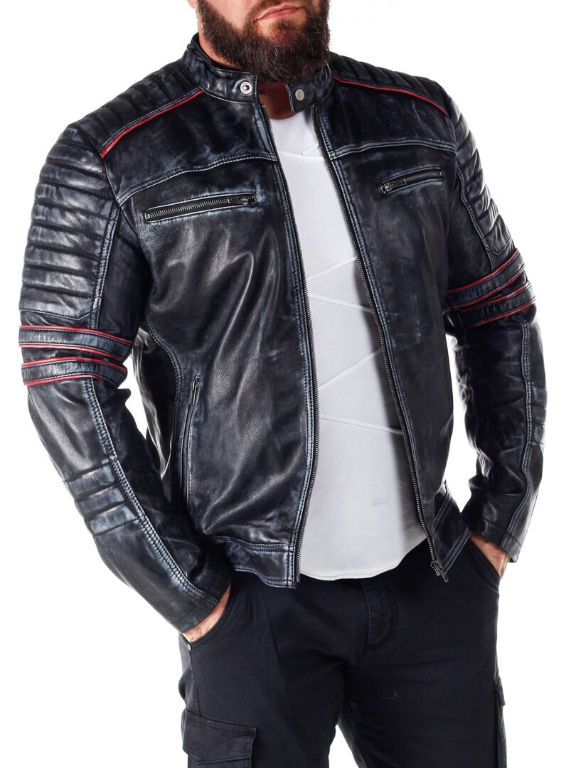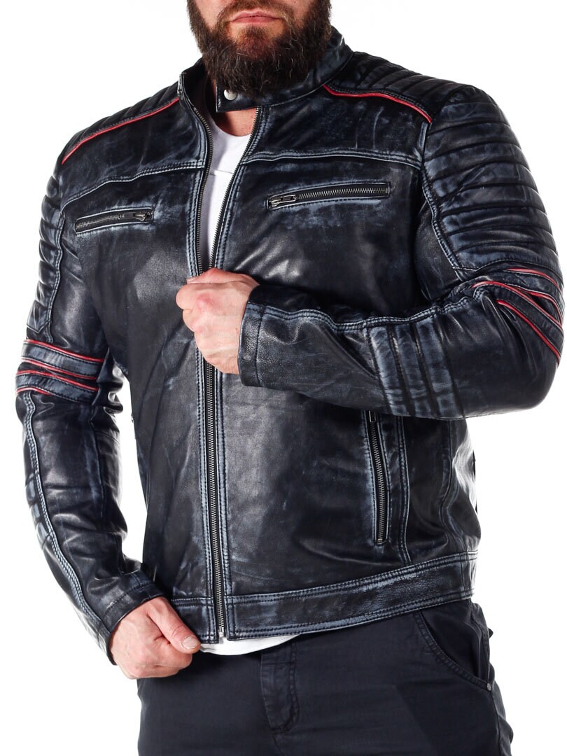 Mocna kurtka z prawdziwej skóry o znoszonym wyglądzie. Posiada niski kołnierz zapinany na guziki, wyściełane części i detale w kontrastowym kolorze. Cztery zamykane kieszenie z przodu i dwie kieszenie wewnętrzne. Tę kurtkę znajdziesz tylko u nas!