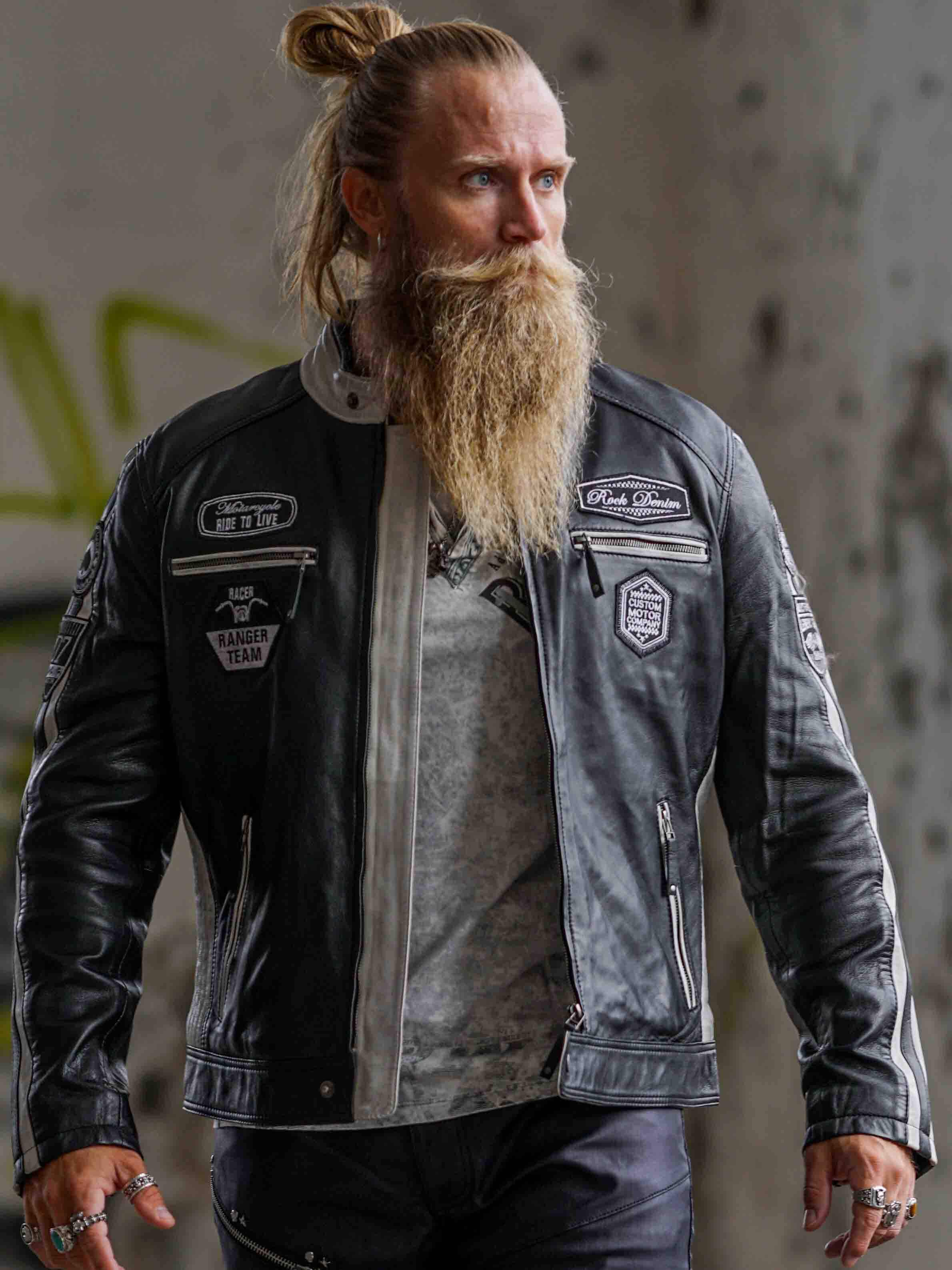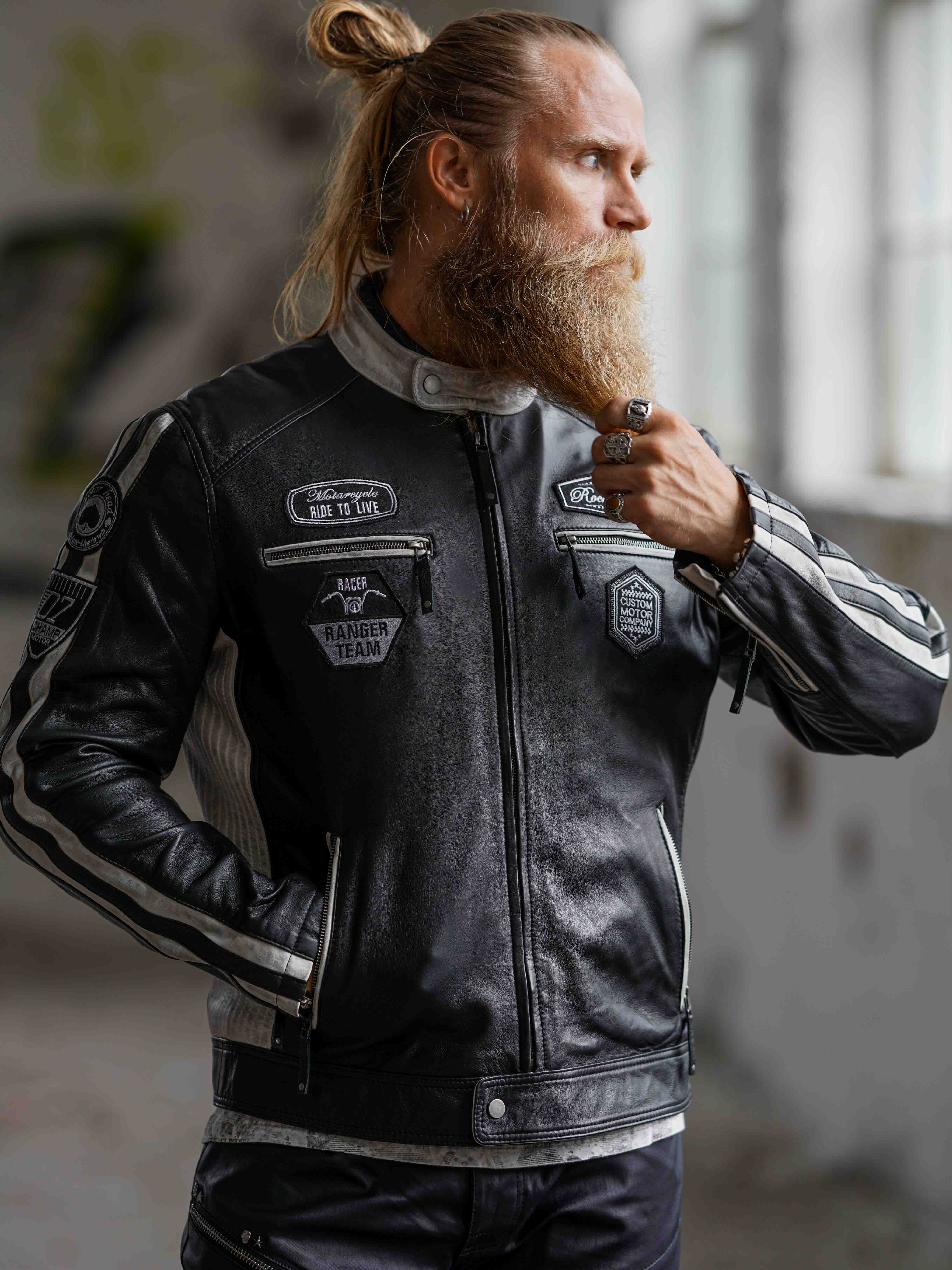 Wygodna skórzana kurtka o mocnym kroju z naszywkami i białymi paskami. Zapinana jest na solidny zamek błyskawiczny. Posiada zatrzask przy szyi i w talii. Na przodzie kurtki znajdują się cztery kieszenie zapinane na suwak oraz dwie kieszenie w pikowanej podszewce. Mankiety można poszerzyć!