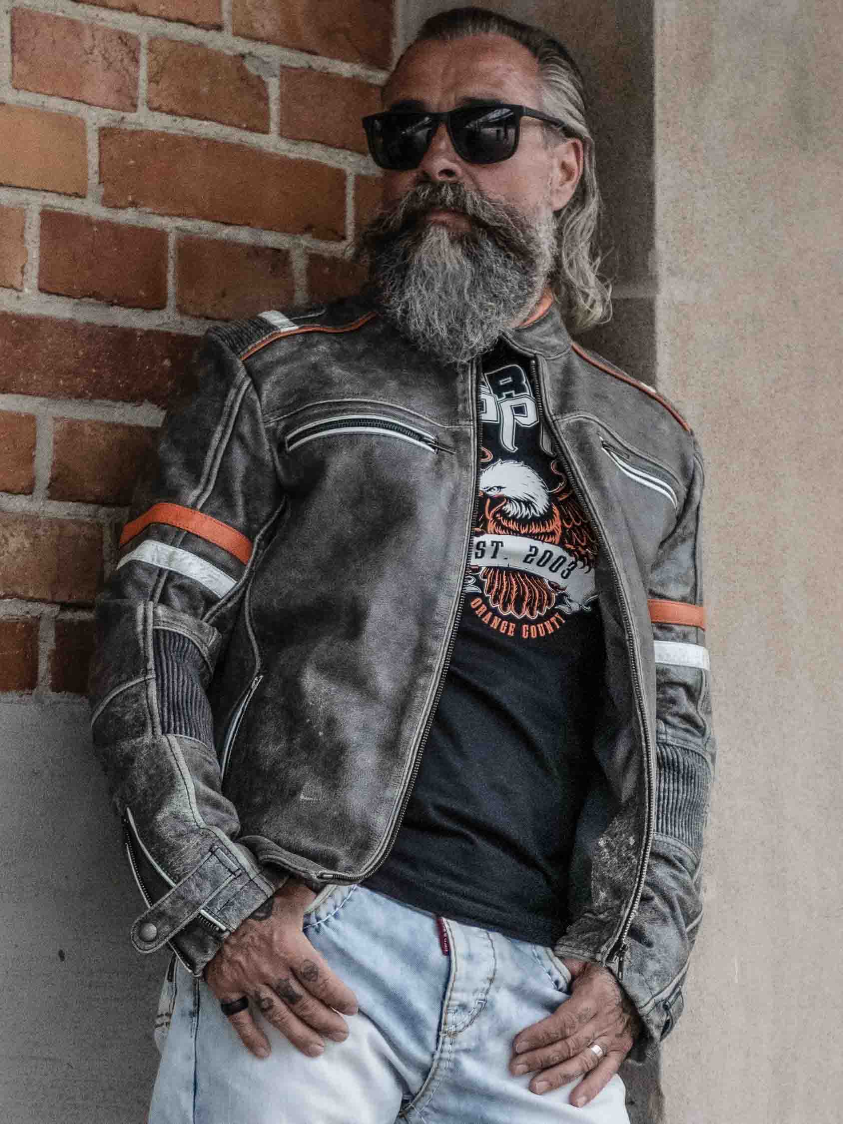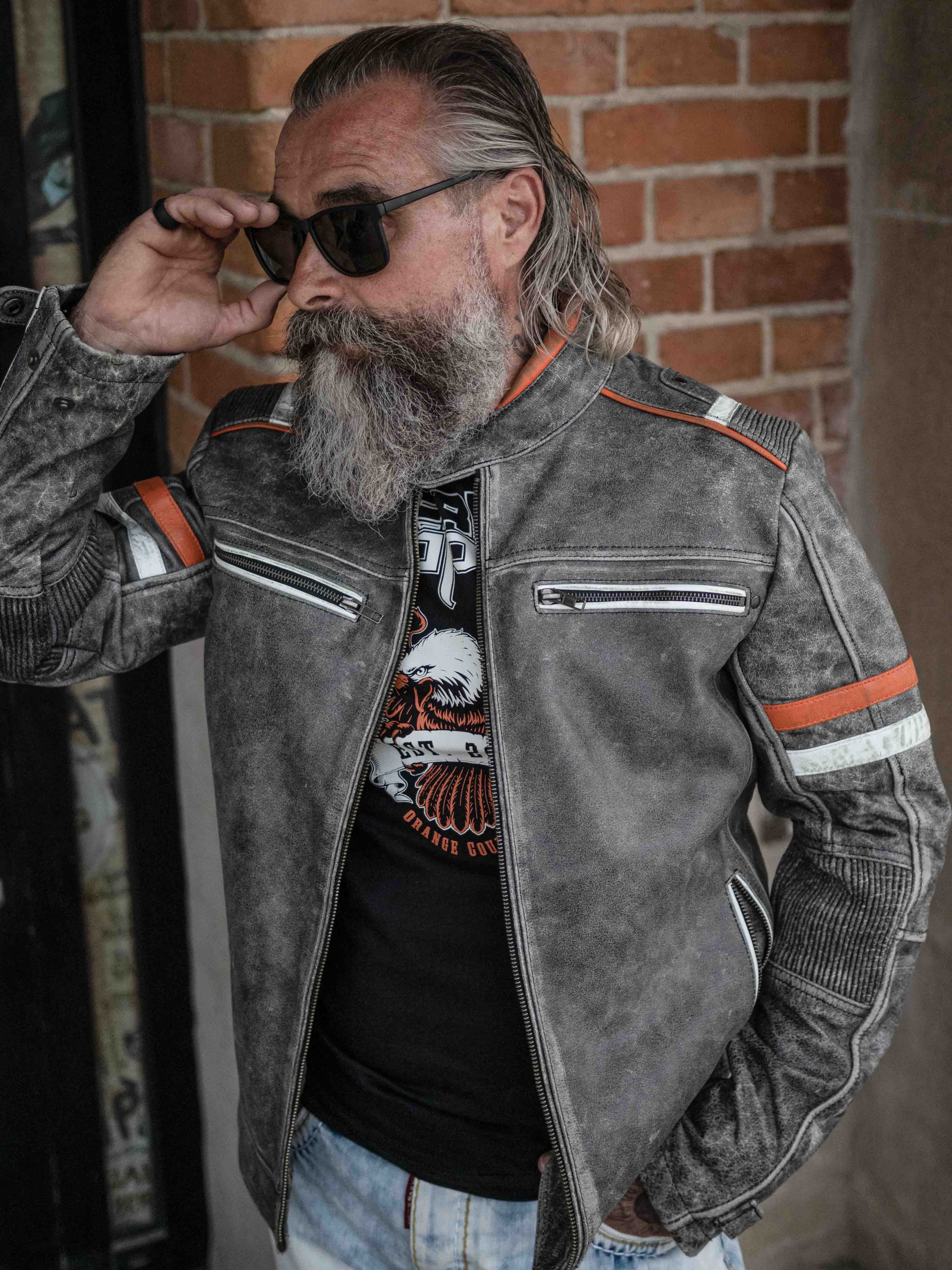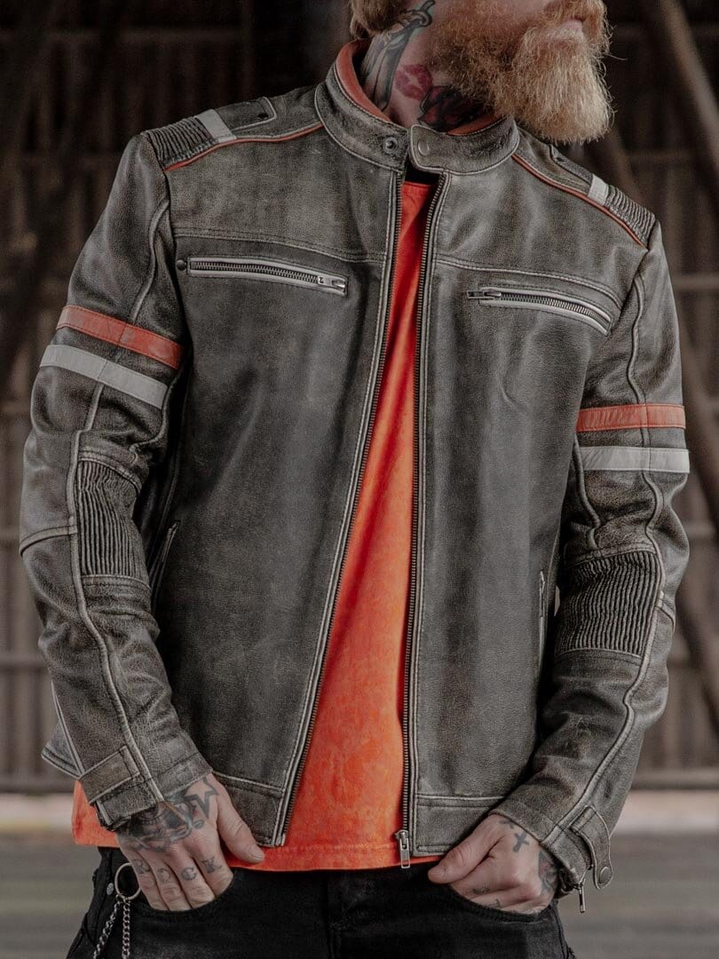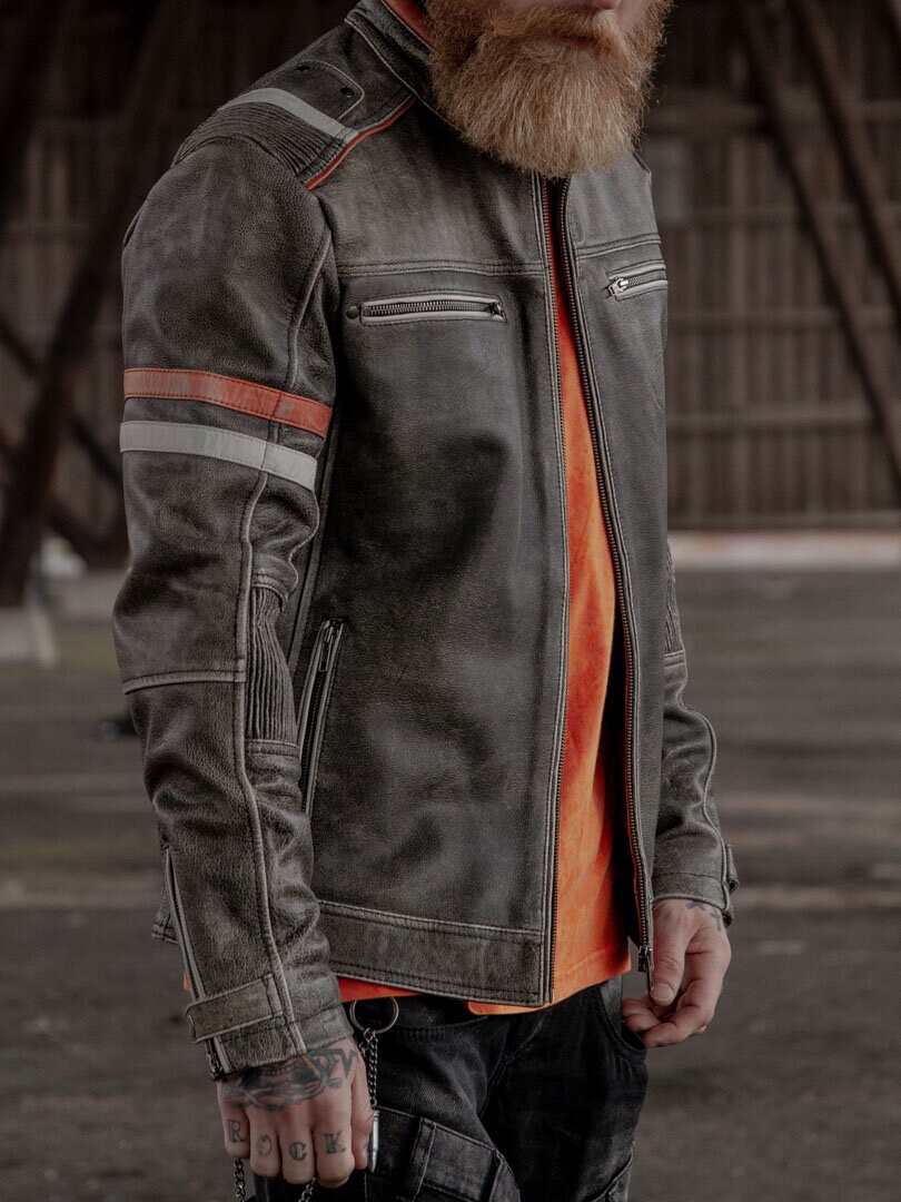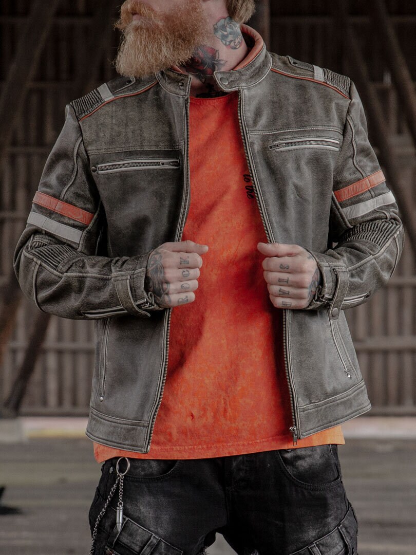 Kurtka w stylu vintage z ciekawymi detalami w kolorze jasnoszarym i pomarańczowym oraz stylowymi marszczeniami. Przeszycia na dole z tyłu, regulowane mankiety, cztery zamykane kieszenie z przodu i dwie otwarte kieszenie wewnętrzne. Ta wyjątkowa skórzana kurtka jest wykonana z wysokiej jakości skóry i zaprojektowana przez Rockdenim, w stylu zainspirowanym sportami motorowymi.