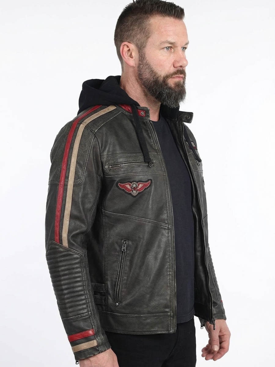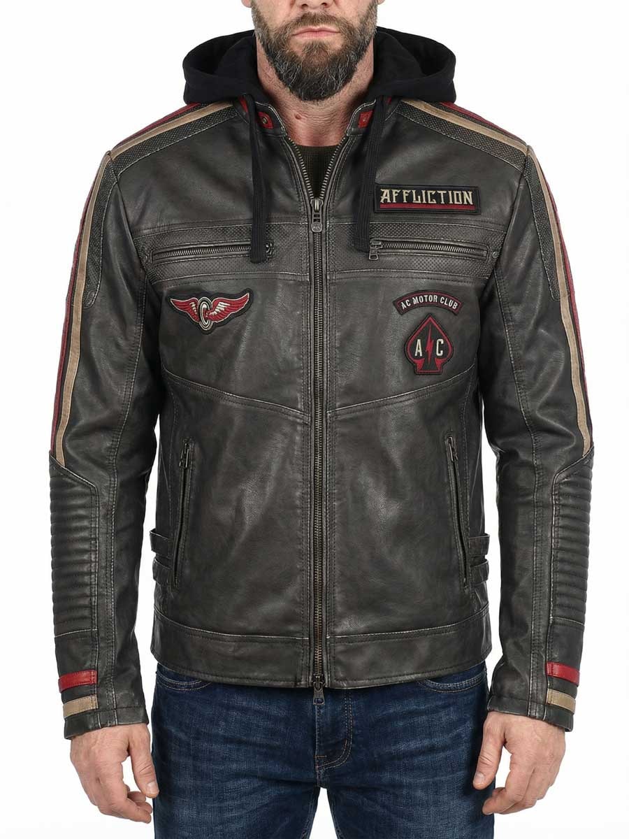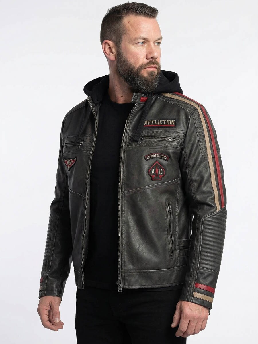Rockowa, inspirowana motocykalami kurtka o mocnym charakterze i wyróżniających się detalach. Wykonana z wytrzymałej skóry PU, z pikowanymi panelami, dekoracyjnymi wstawkami i haftowanymi naszywkami. Tył zdobi duży, ikoniczny motyw Affliction, który nadaje kurtce wyjątkowy charakter. Kurtka ma lekką podszewkę zapewniającą komfort i ciepło, a miękki kaptur można odpiąć, gdy chcesz zmienić styl. Idealna dla osób, które chcą na co dzień nosić coś mocnego, wygodnego i wyrazistego!