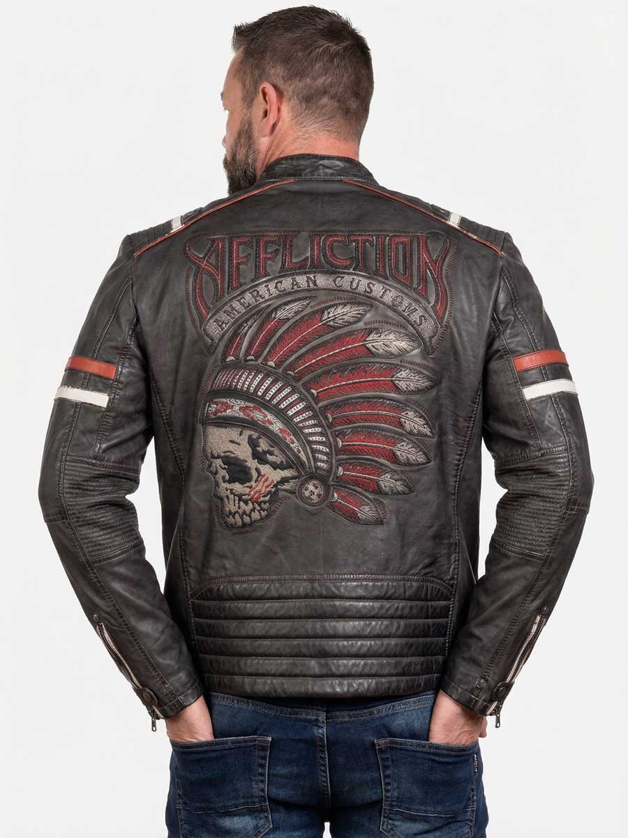 Solidna i szczegółowo wykonana kurtka z prawdziwej skóry, która z czasem wygląda tylko lepiej. Posiada wyrazisty design z kontrastowymi przeszyciami, haftowanymi naszywkami oraz kilkoma kieszeniami na suwak z przodu. Na plecach znajduje się duży, imponujący haftowany motyw, nadający kurtce kultowy wygląd Affliction. Idealna dla osób ceniących jakość i mocny styl – niezależnie od tego, czy jeżdżą na motocyklu, czy po prostu lubią ten klimat!