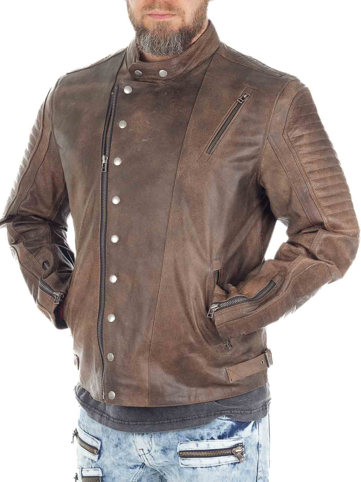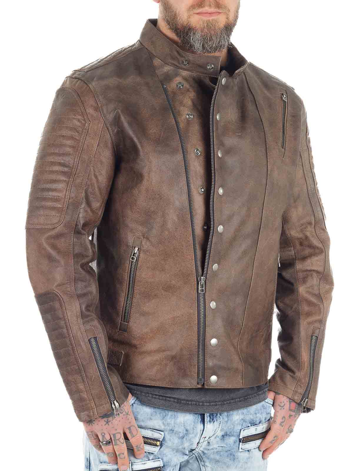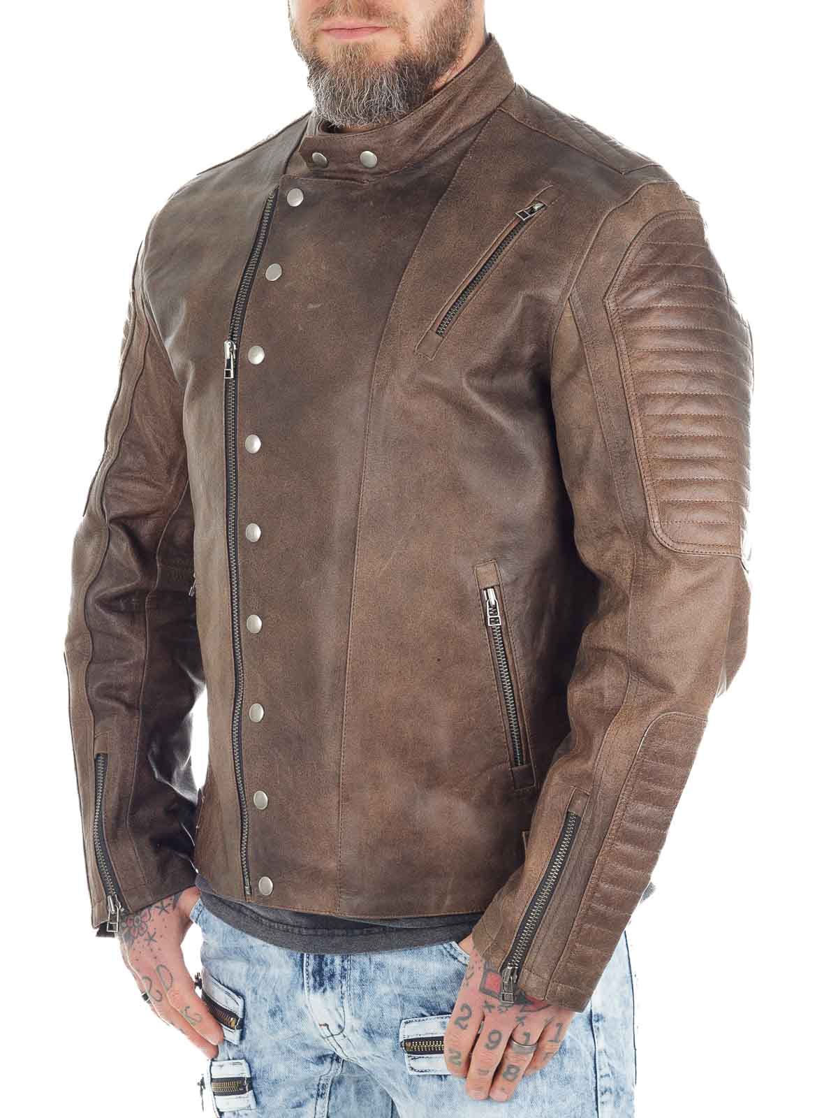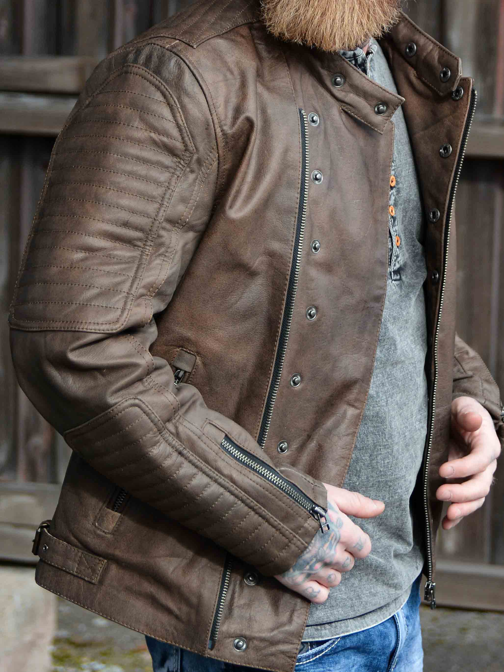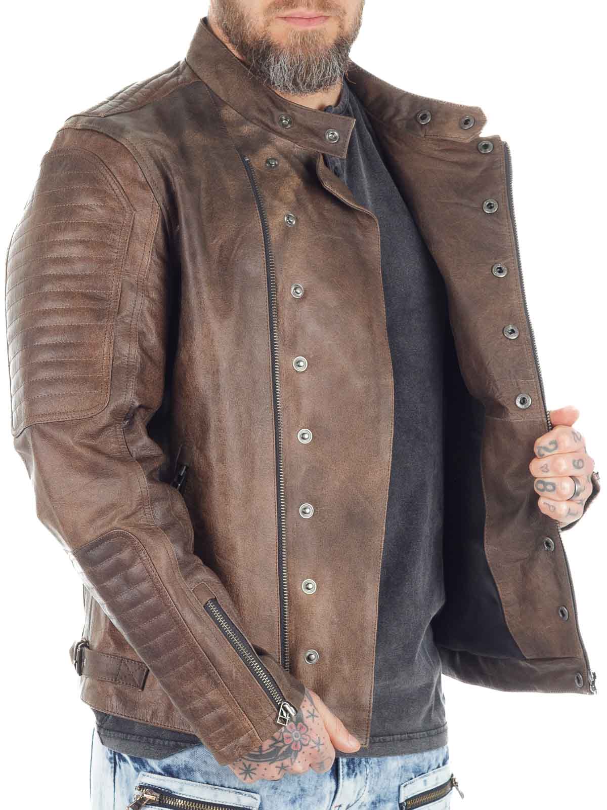 Wyrazista kurtka wykonana z prawdziwej skóry bawolej o wyglądzie vintage. Zaprojektowana z zamkiem błyskawicznym i ozdobnym zapięciem na guziki, które podkreślają jej solidny charakter. Trzy kieszenie zewnętrzne i dwie kieszenie wewnętrzne zapewniają praktyczne miejsce na najważniejsze drobiazgi. Mocna kurtka skórzana, idealna dla mężczyzn, którzy chcą podkreślić swój męski styl!