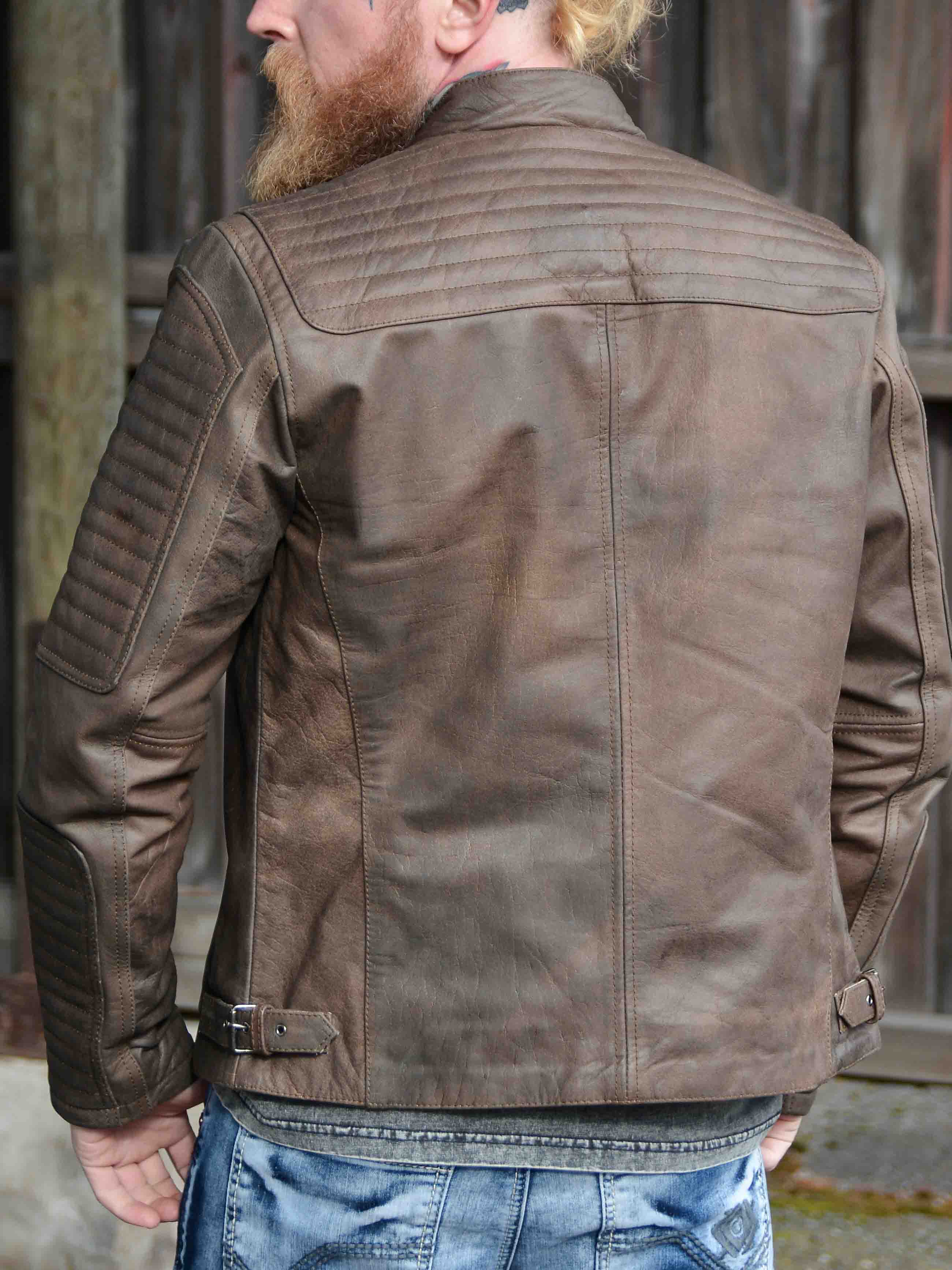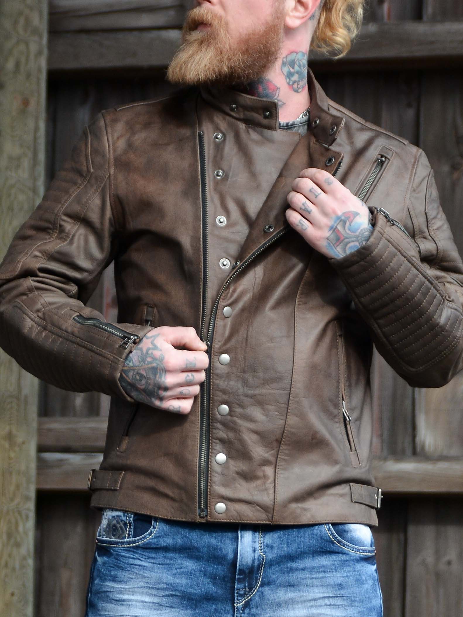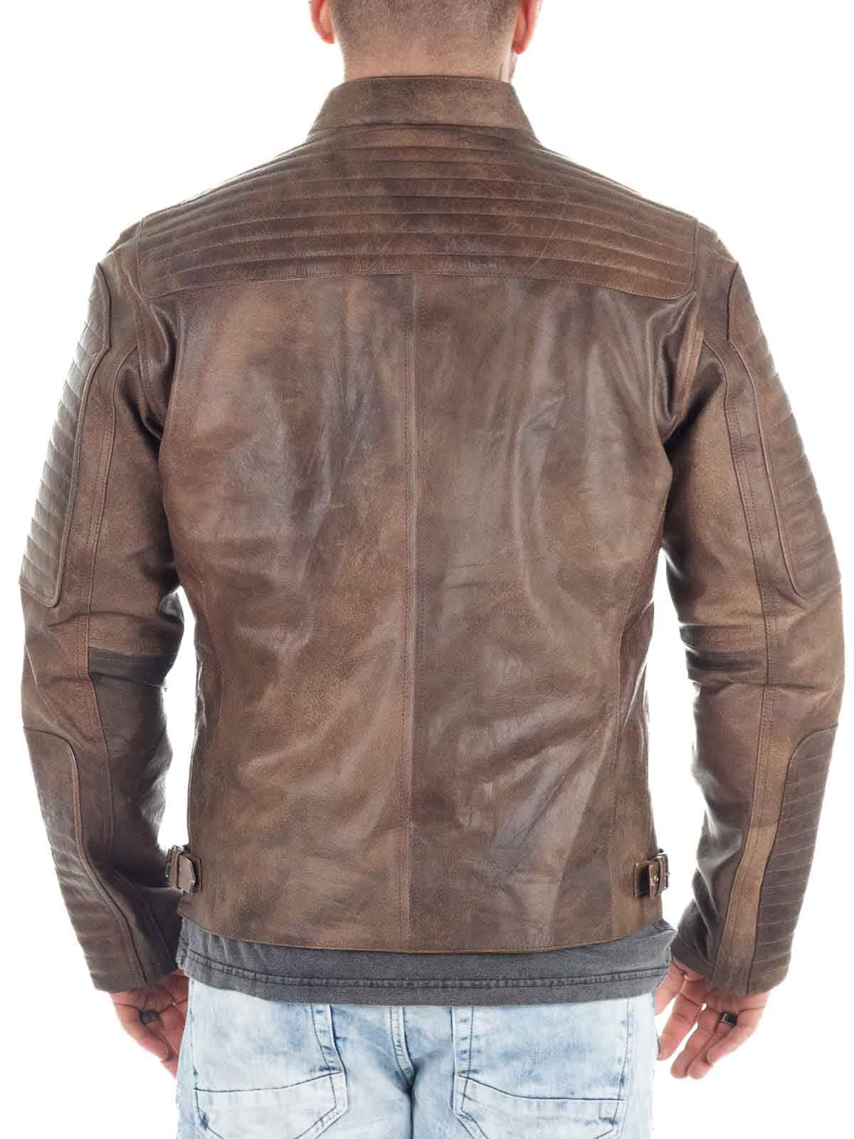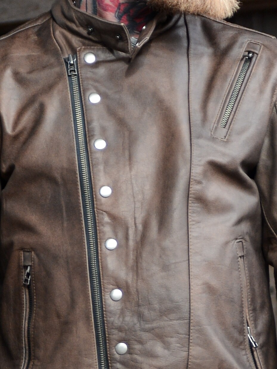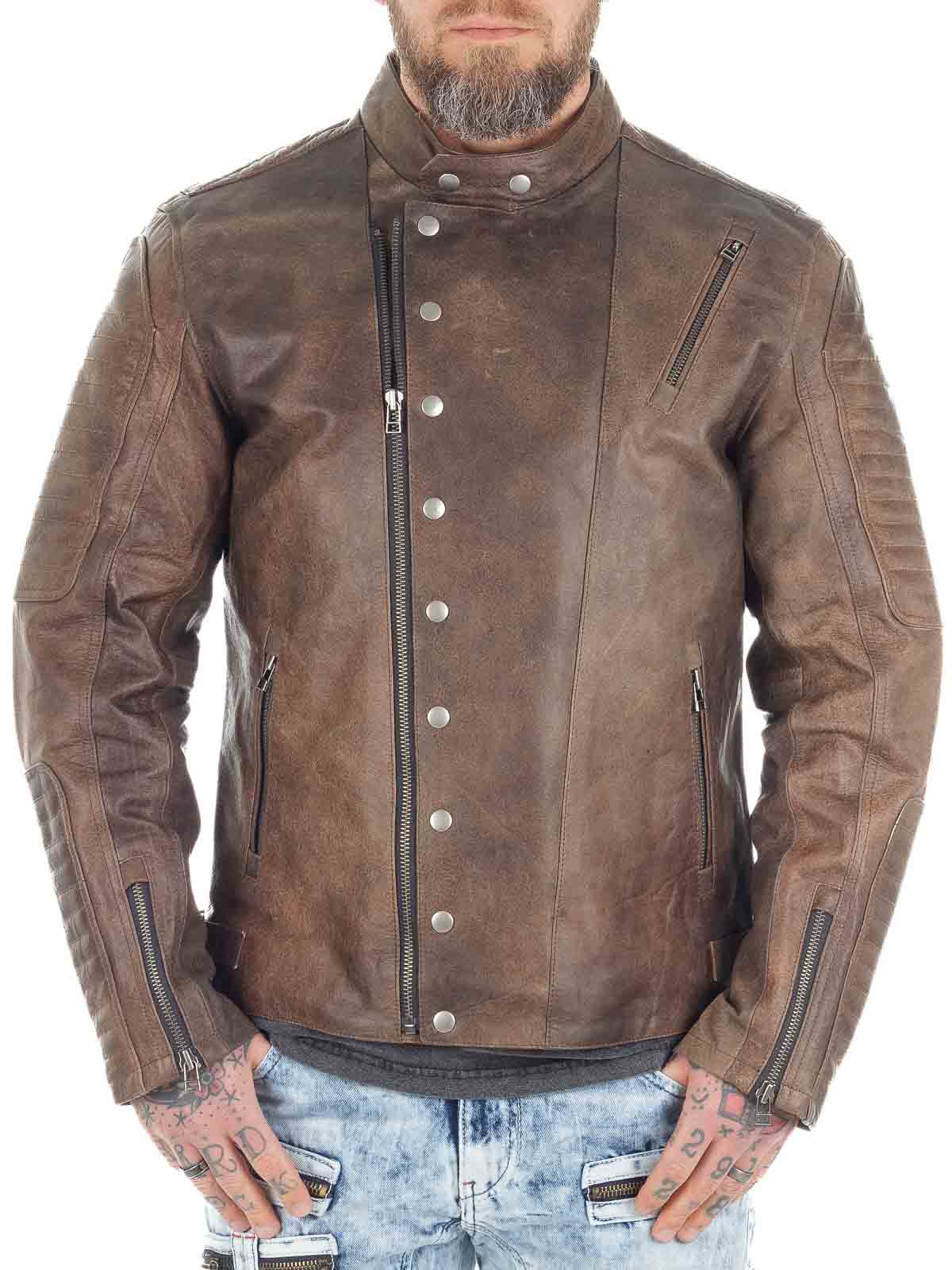 Wyrazista kurtka wykonana z prawdziwej skóry bawolej o wyglądzie vintage. Zaprojektowana z zamkiem błyskawicznym i ozdobnym zapięciem na guziki, które podkreślają jej solidny charakter. Trzy kieszenie zewnętrzne i dwie kieszenie wewnętrzne zapewniają praktyczne miejsce na najważniejsze drobiazgi. Mocna kurtka skórzana, idealna dla mężczyzn, którzy chcą podkreślić swój męski styl!