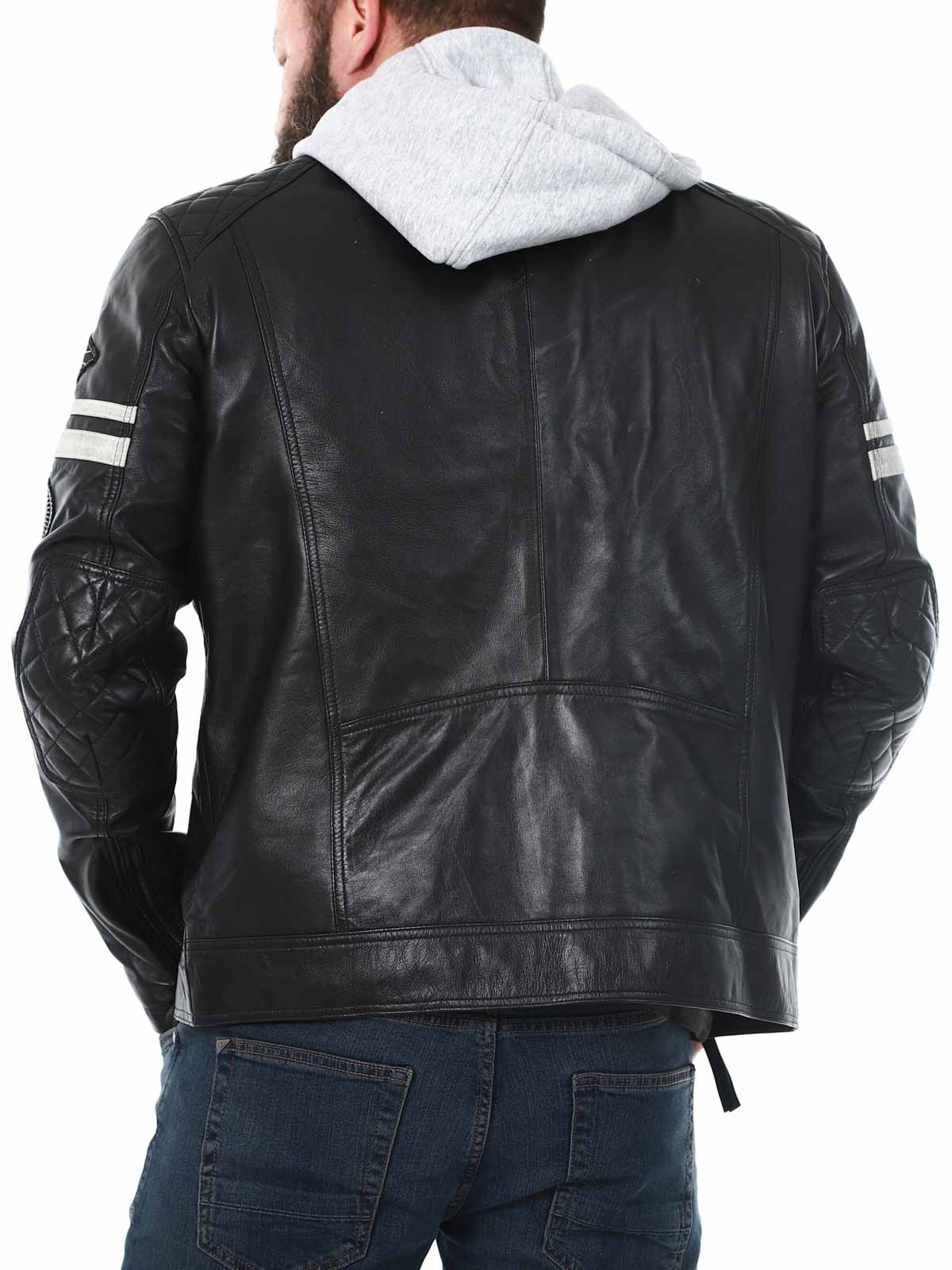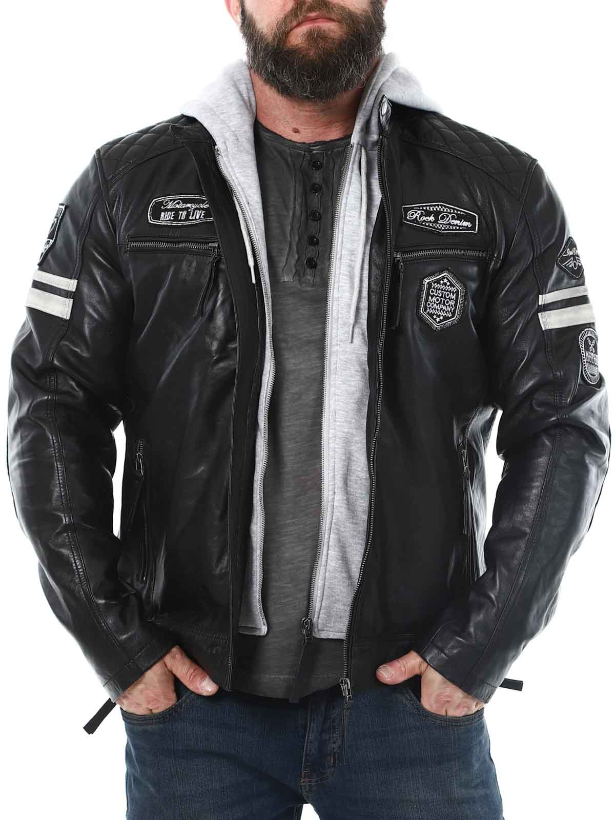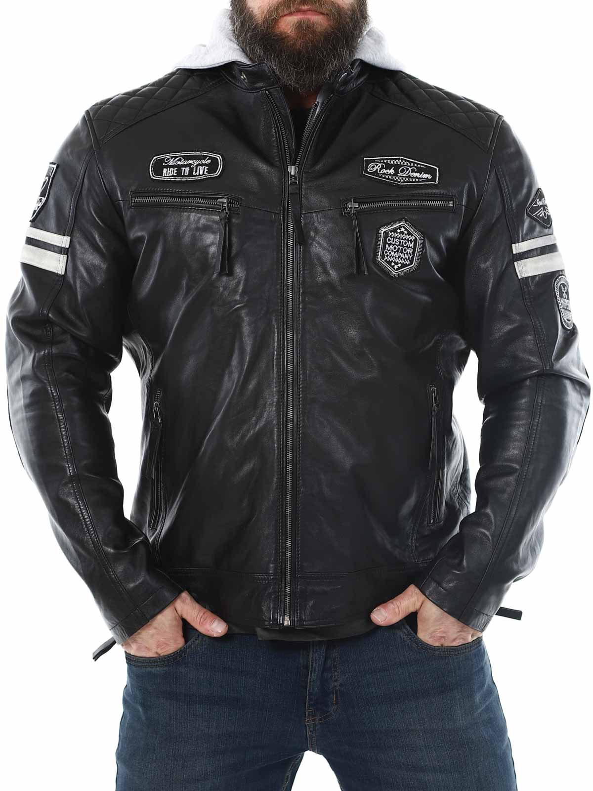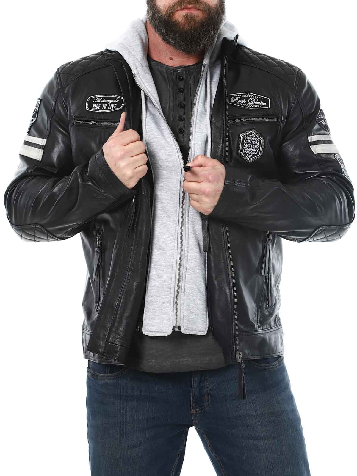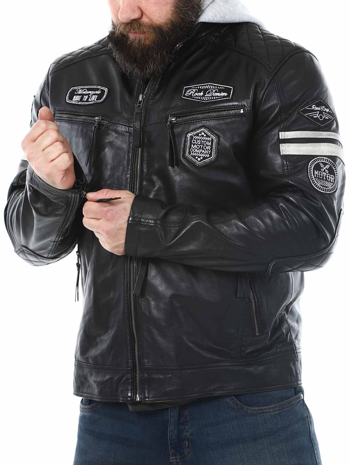 Kurtka inspirowana wyścigami, wykonana z miękkiej i elastycznej skóry. Projekt tej kurtki obejmuje naszywki z materiału oraz odpinany kaptur z materiału. Z przodu znajdują się cztery kieszenie, zamykane na zamek błyskawiczny, dwie kieszenie wewnętrzne oraz regulowane mankiety. To elegancka kurtka, dostępna wyłącznie w RockDenim!