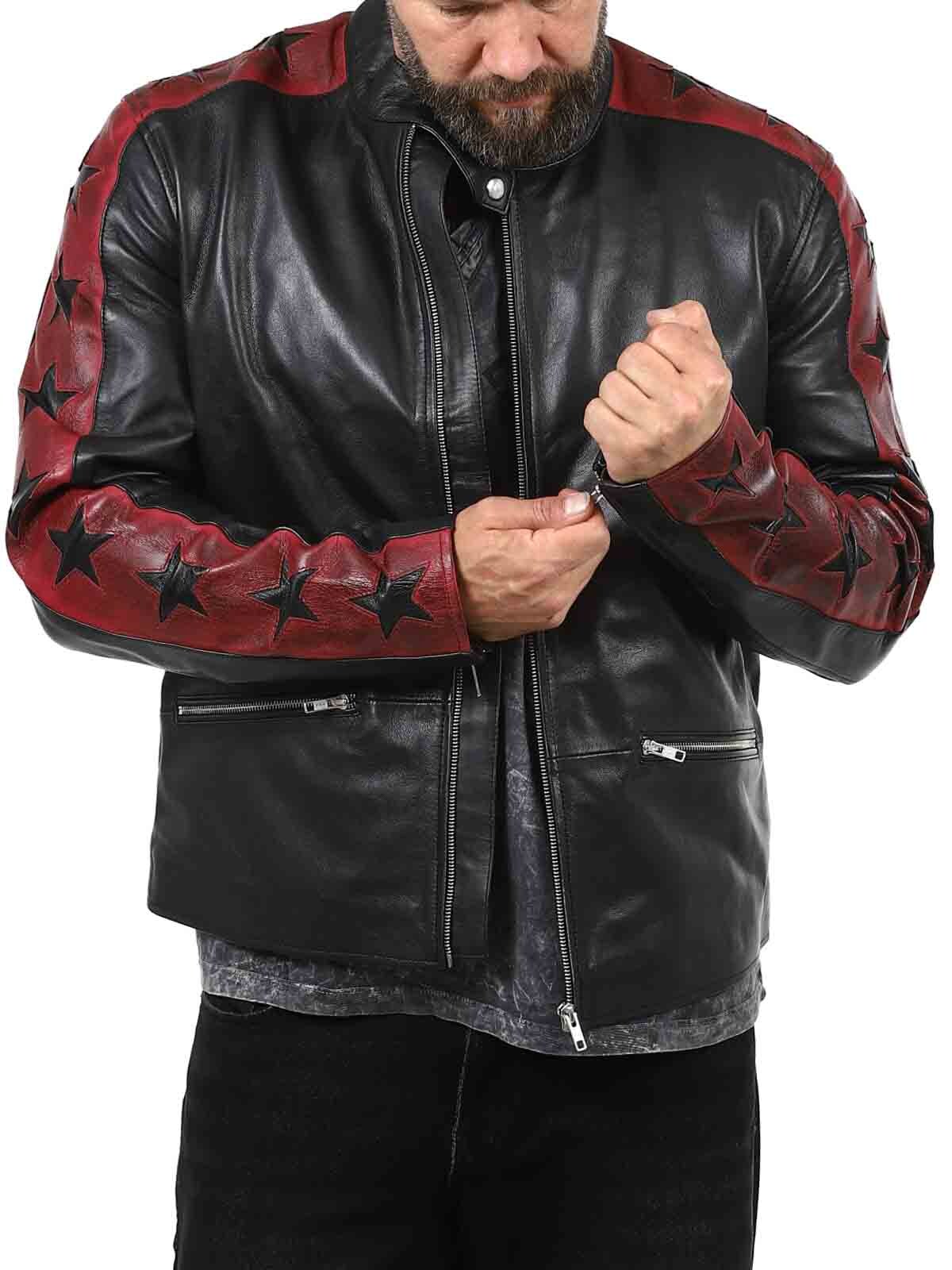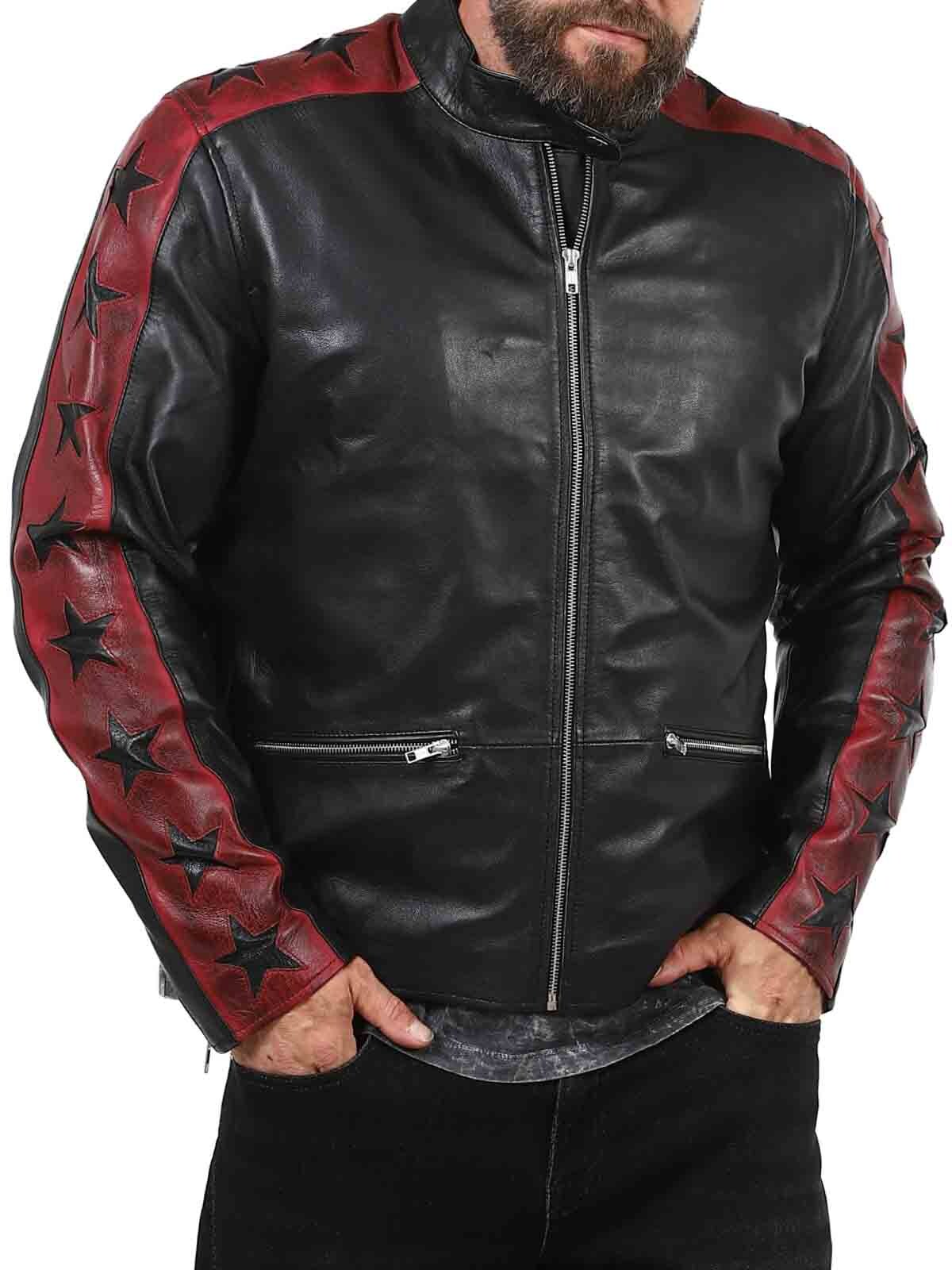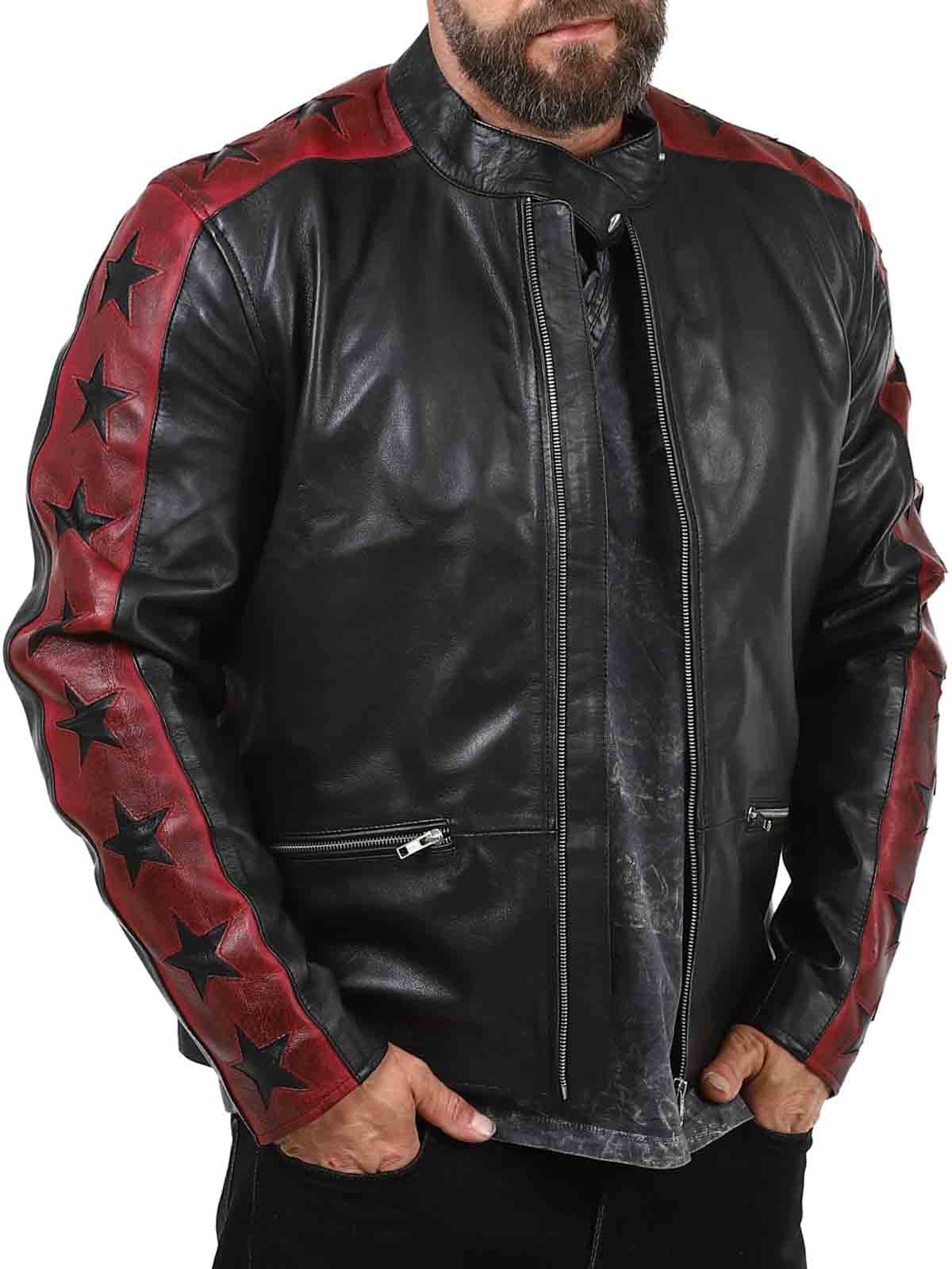 Kurtka wykonana z prawdziwej, elastycznej skóry owczej z buntowniczym akcentem. Kontrastujące rękawy z ciemnoczerwonej skóry są ozdobione czarnymi gwiazdami, nadając kurtce wyrazistego charakteru. Posiada zapinane na zamek kieszenie i mankiety, a także wzmocnioną dolną część pleców. Elegancka stójka i dopasowany krój sprawiają, że jest to idealny wybór dla tych, którzy chcą wyróżniać się stylem!