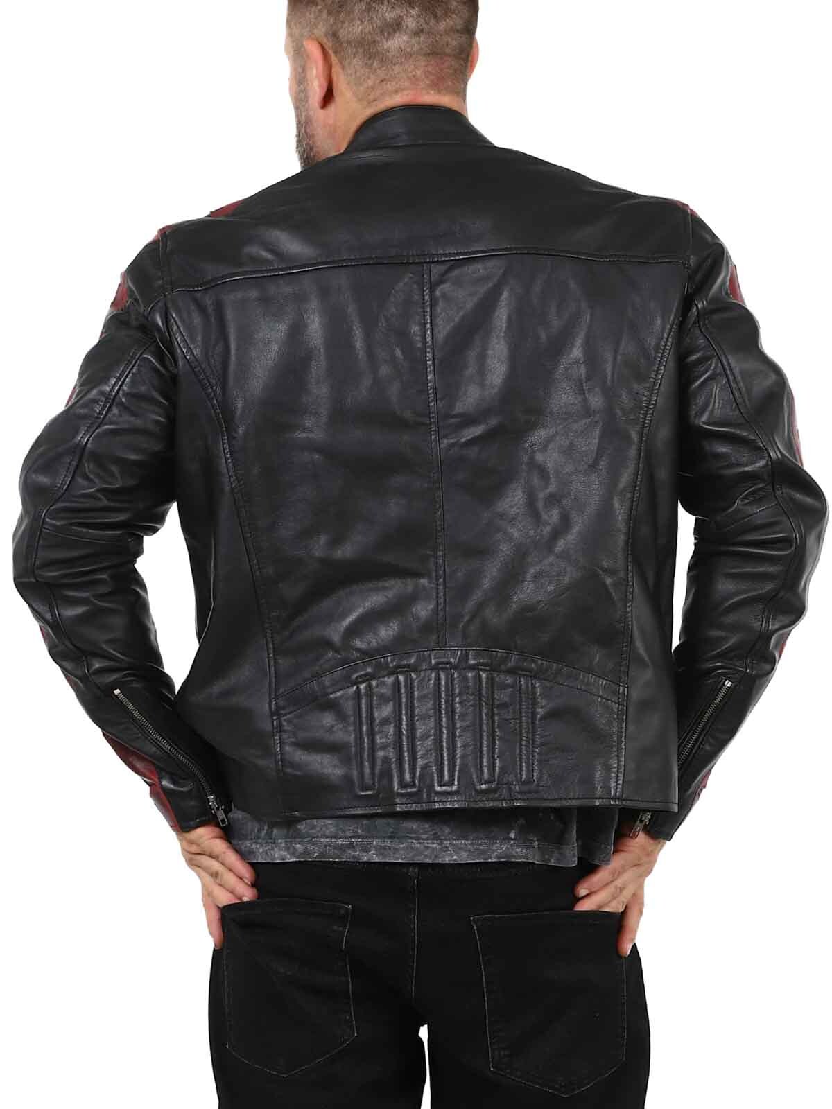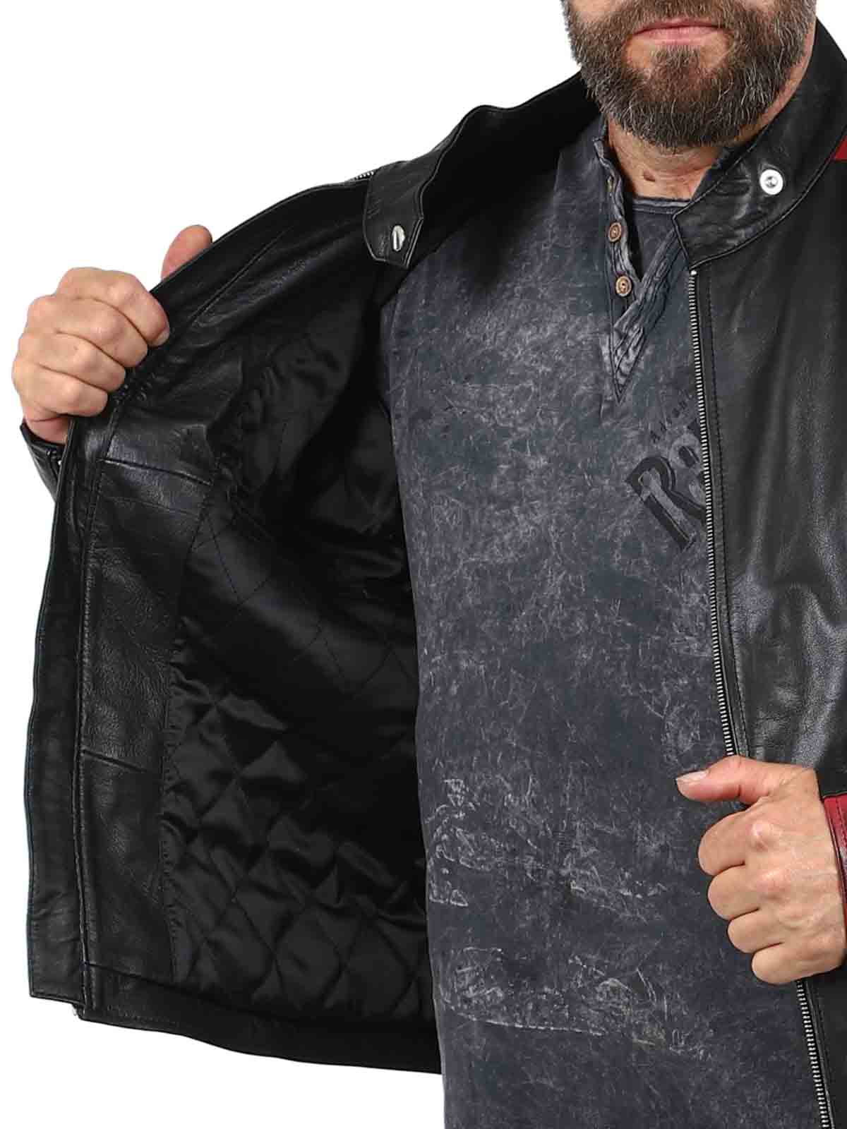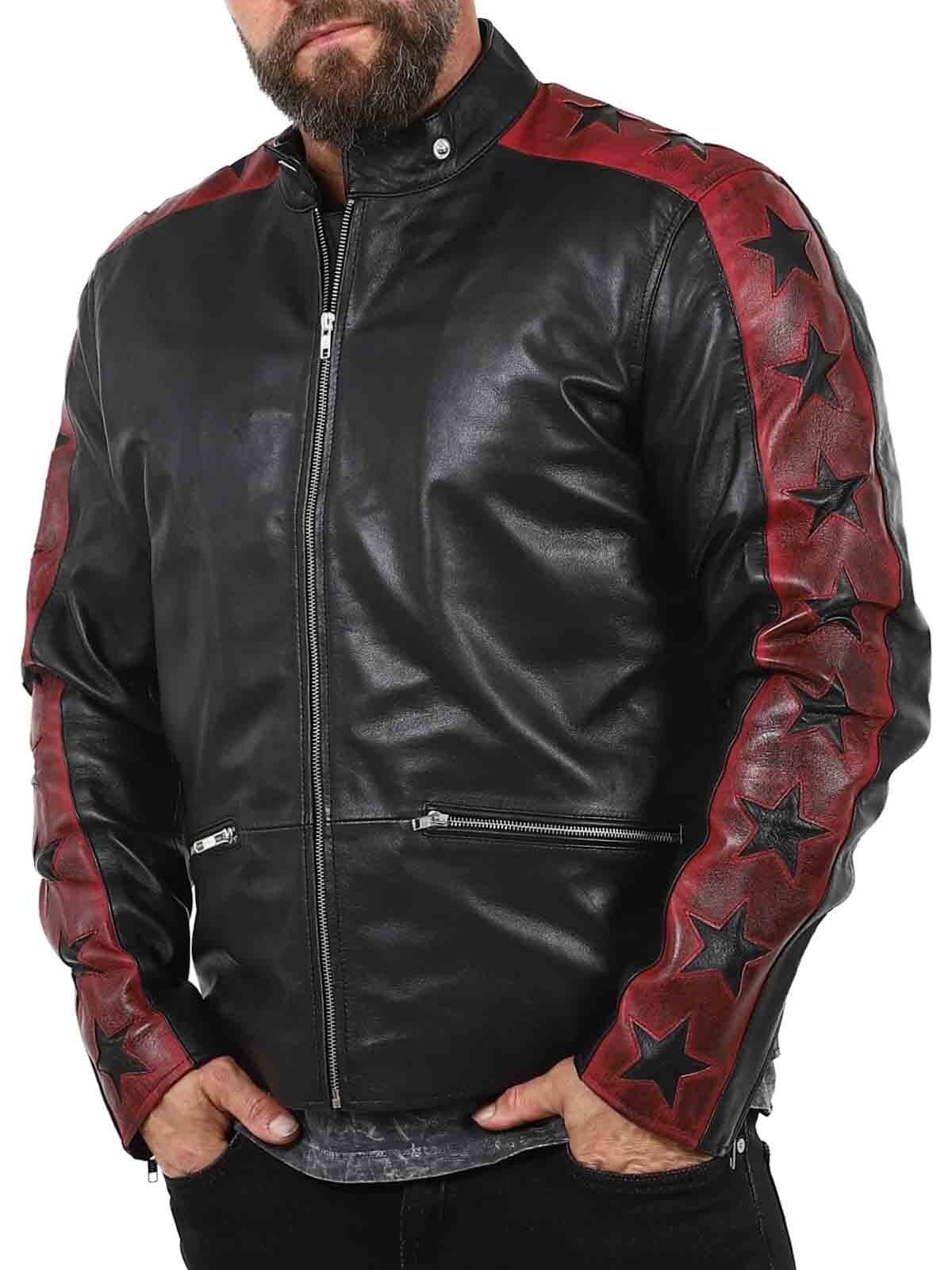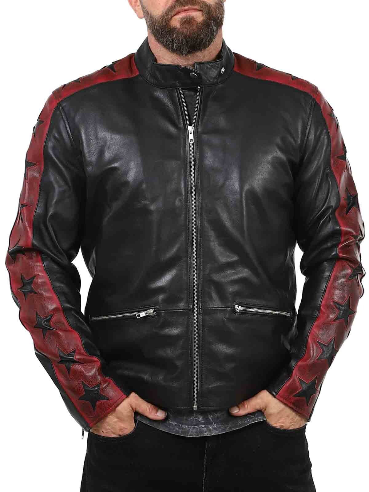 Kurtka wykonana z prawdziwej, elastycznej skóry owczej z buntowniczym akcentem. Kontrastujące rękawy z ciemnoczerwonej skóry są ozdobione czarnymi gwiazdami, nadając kurtce wyrazistego charakteru. Posiada zapinane na zamek kieszenie i mankiety, a także wzmocnioną dolną część pleców. Elegancka stójka i dopasowany krój sprawiają, że jest to idealny wybór dla tych, którzy chcą wyróżniać się stylem!
