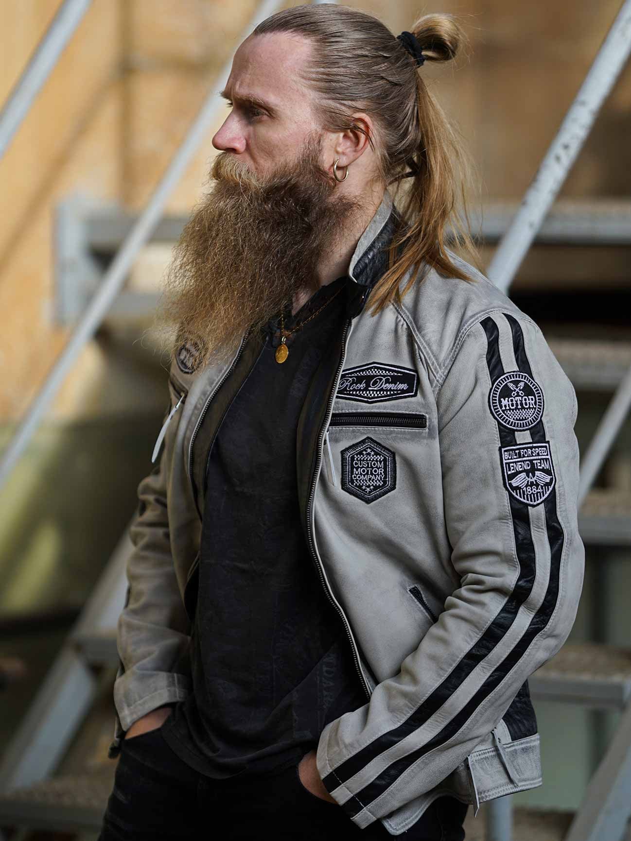 Wygodna skórzana kurtka o klasycznym kroju z naszywkami i czarnymi paskami. Zapinana jest na solidny zamek błyskawiczny. Posiada zatrzask przy szyi i w talii. Na przodzie kurtki znajdują się cztery kieszenie zapinane na suwak oraz dwie kieszenie w pikowanej podszewce. Mankiety można poszerzyć!