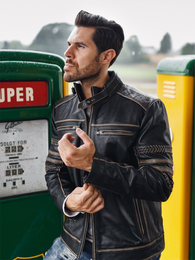 Solidna i wytrzymała skórzana kurtka w kolorze czarnym z wyraźnymi beżowymi detalami. Ręcznie szyty wzór warkocza na rękawach i wzdłuż kręgosłupa nadaje mu styl retro. Kurtka ma dwie kieszenie na piersi i dwie kieszenie na brzuchu wszystkie z zamkami. Jedna kieszeń wewnętrzna. Ta kurtka należy do ekskluzywnej marki RockDenim i możesz ją znaleźć tylko u nas!