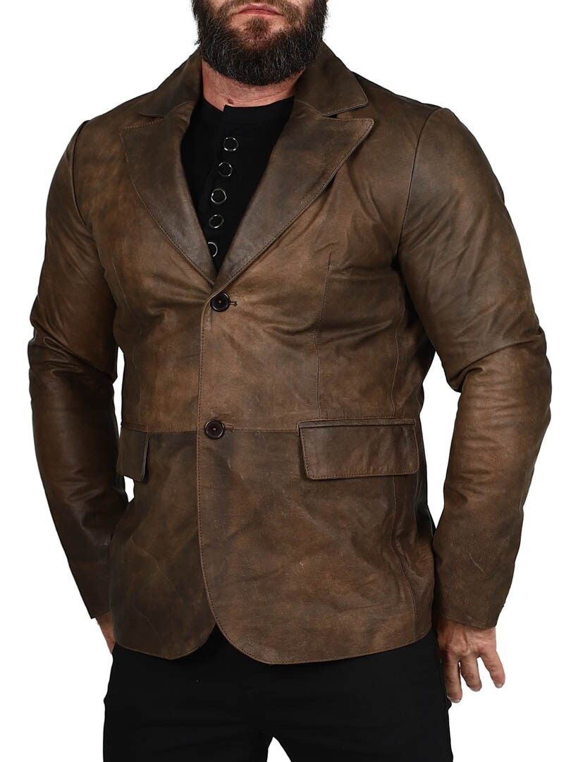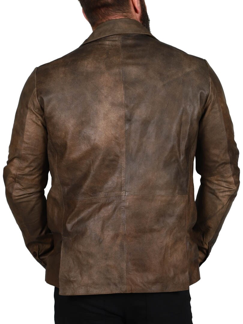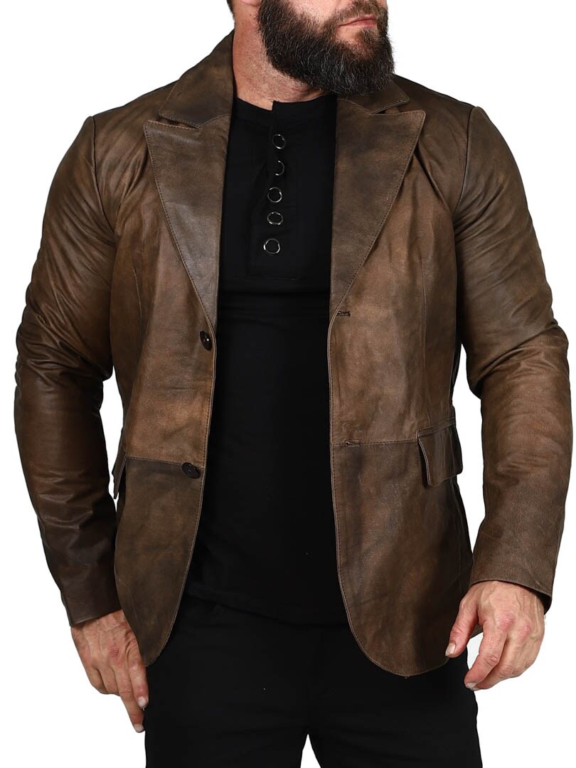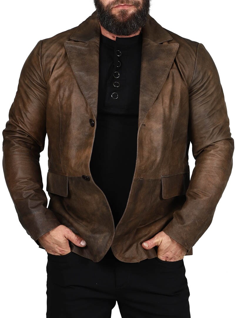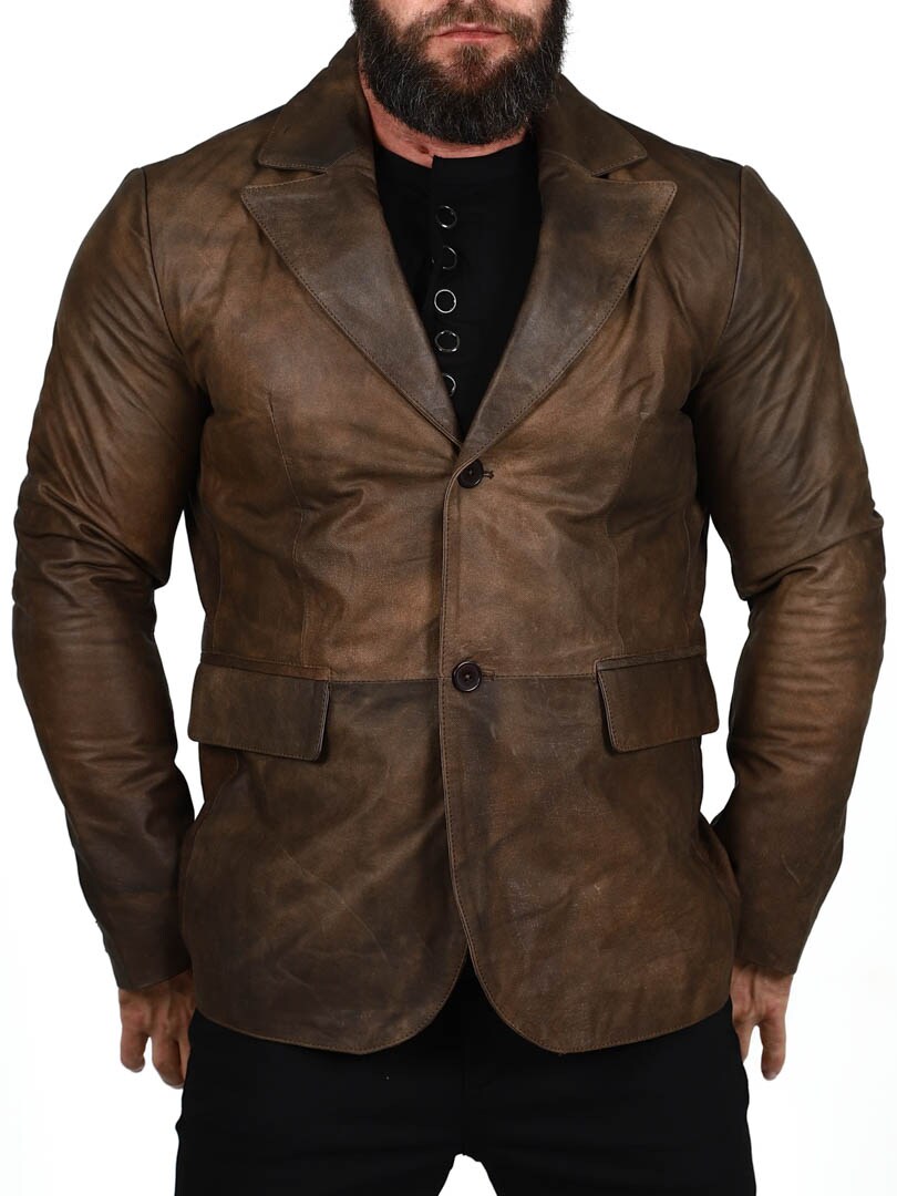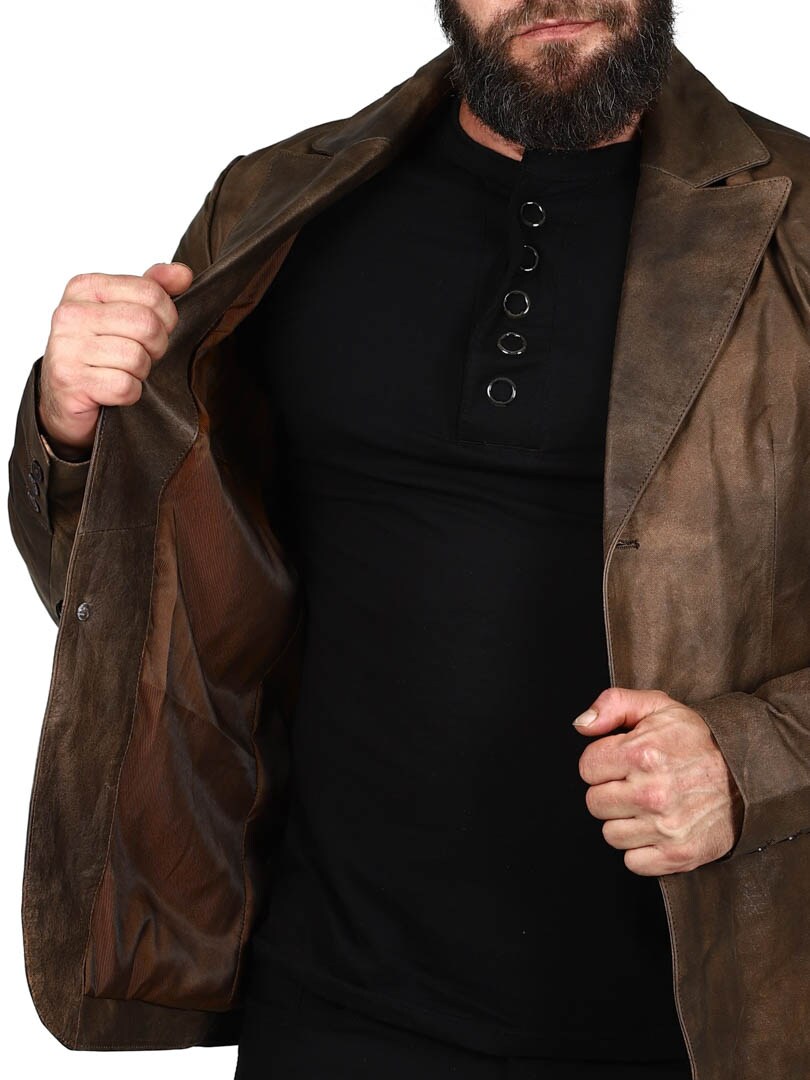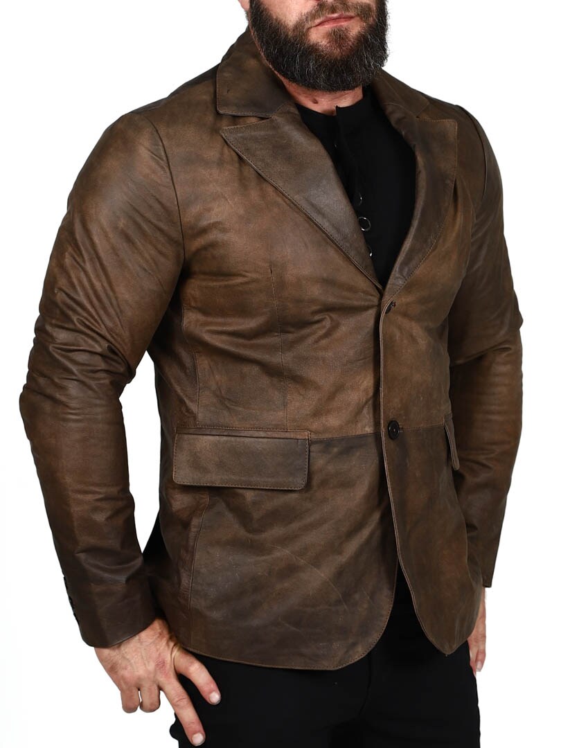 Marynarka wykonana w 100% ze skóry owczej w mocnym, klasycznym brązowym kolorze. Dwie kieszenie na zewnątrz i dwie kieszenie wewnątrz. Zapinana na dwa guziki. Dostępny również w kolorze czarnym