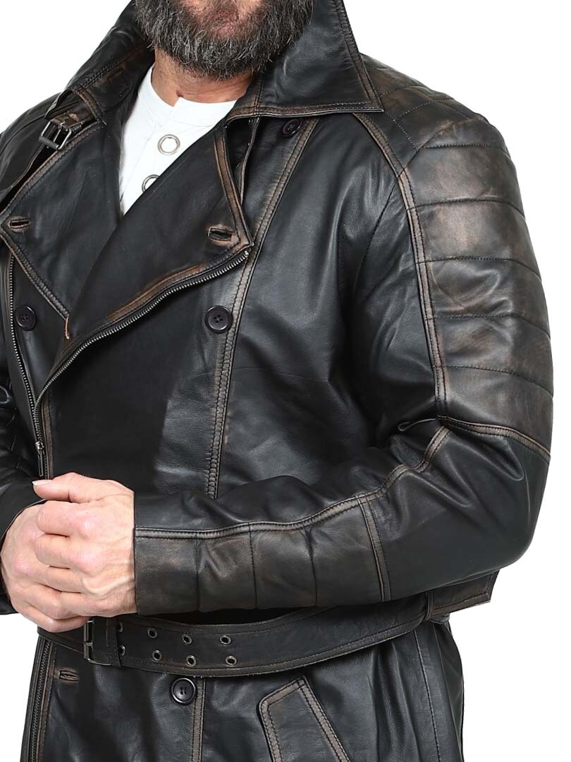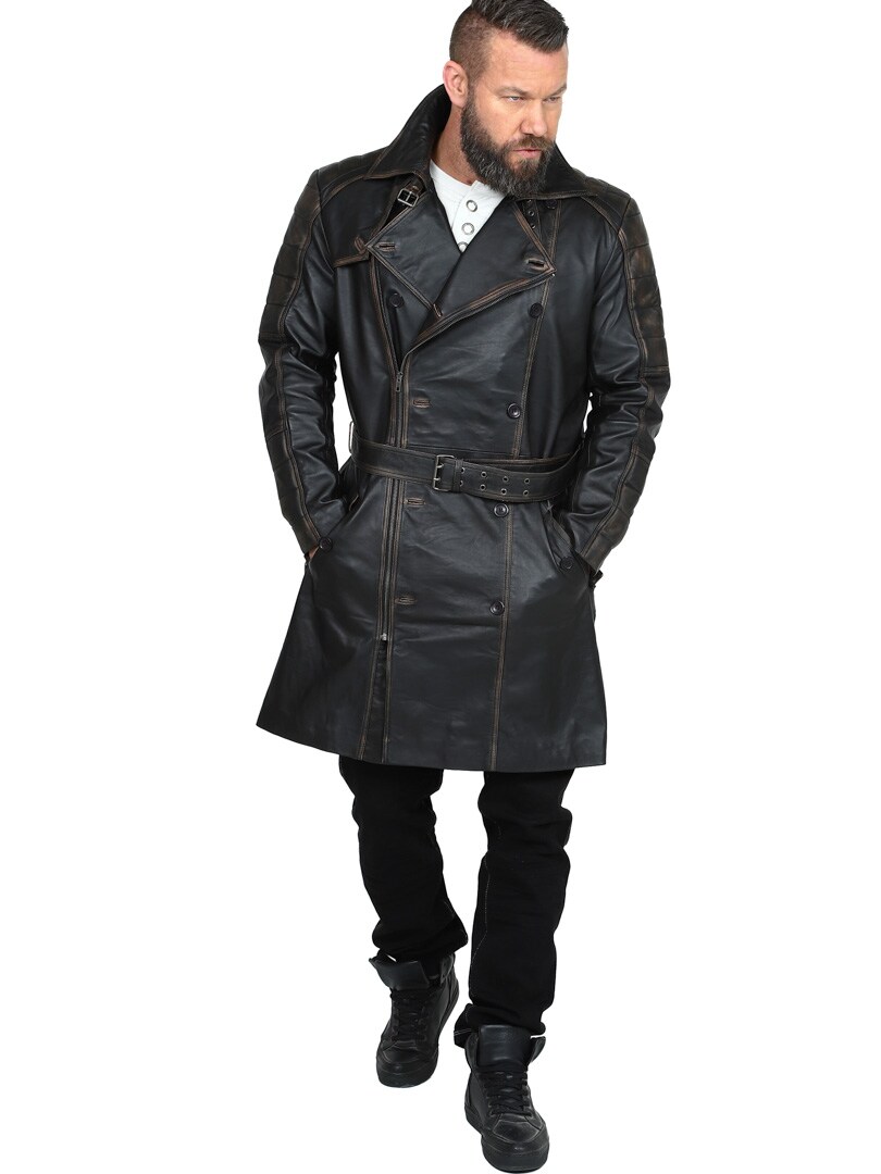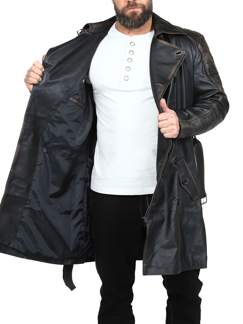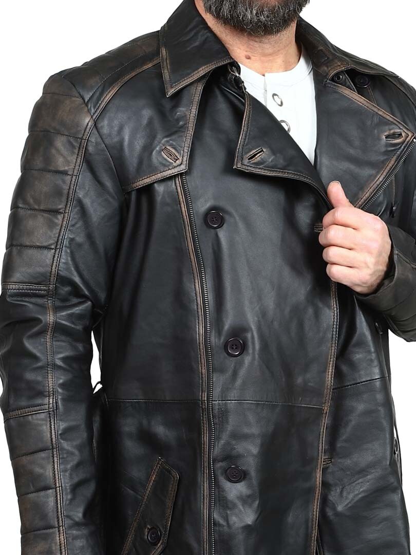 Dwurzędowy płaszcz o klasycznym, długim kroju i wyglądzie vintage. Wykonany z wysokiej jakości elastycznej skóry zapewniającej trwałość i ekskluzywny wygląd. Zamykane kieszenie boczne i kieszenie wewnętrzne do bezpiecznego przechowywania. Ta stylowa kurtka to idealny wybór dla tych, którzy szukają czegoś wyjątkowego i stylowego!