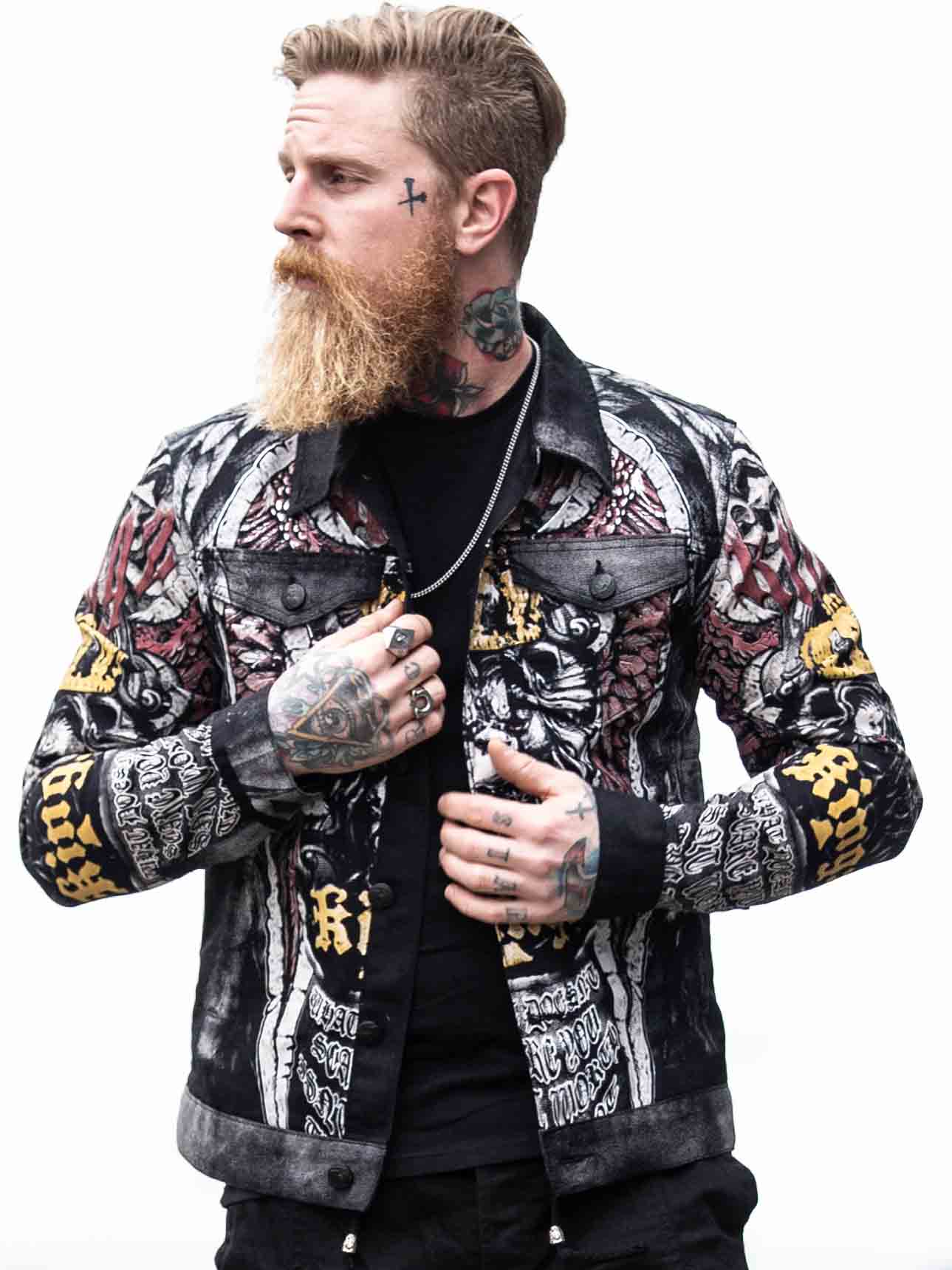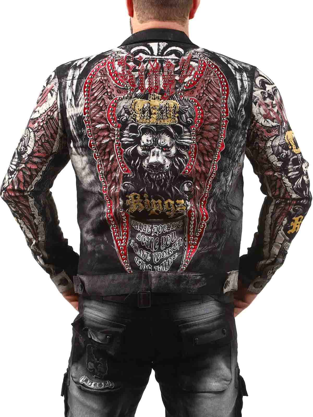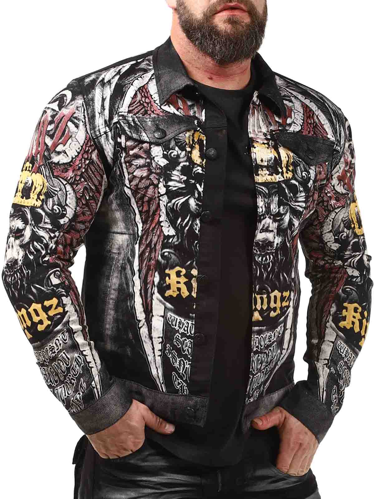 Wytrzymała kurtka z metalowymi nitami i nadrukami w kilku kolorach. Posiada kołnierz, dwie zamykane kieszenie na piersi oraz dwie otwarte kieszenie z przodu. Kurtka zapinana jest na guziki i ma regulowane mankiety również za pomocą guzików.