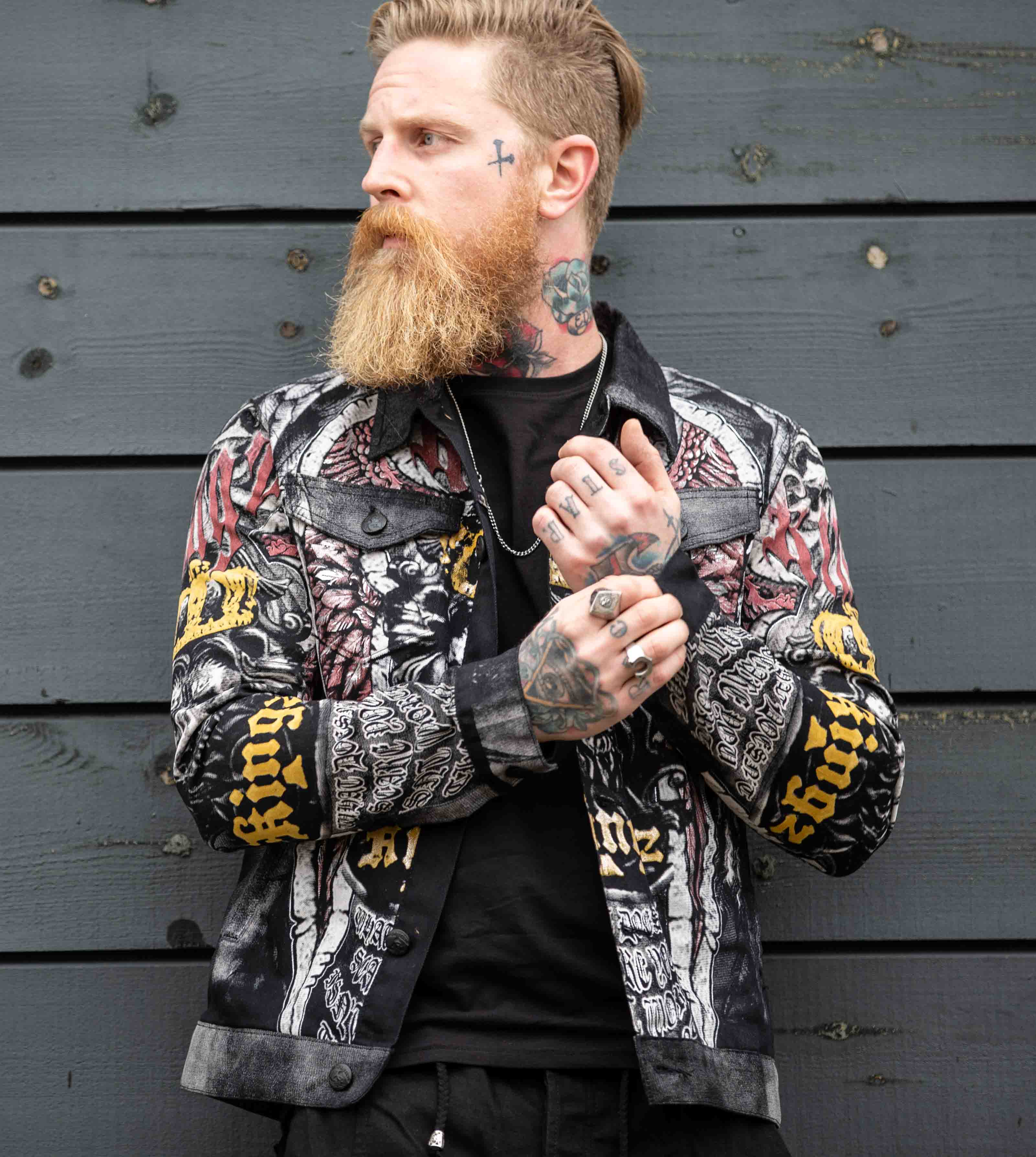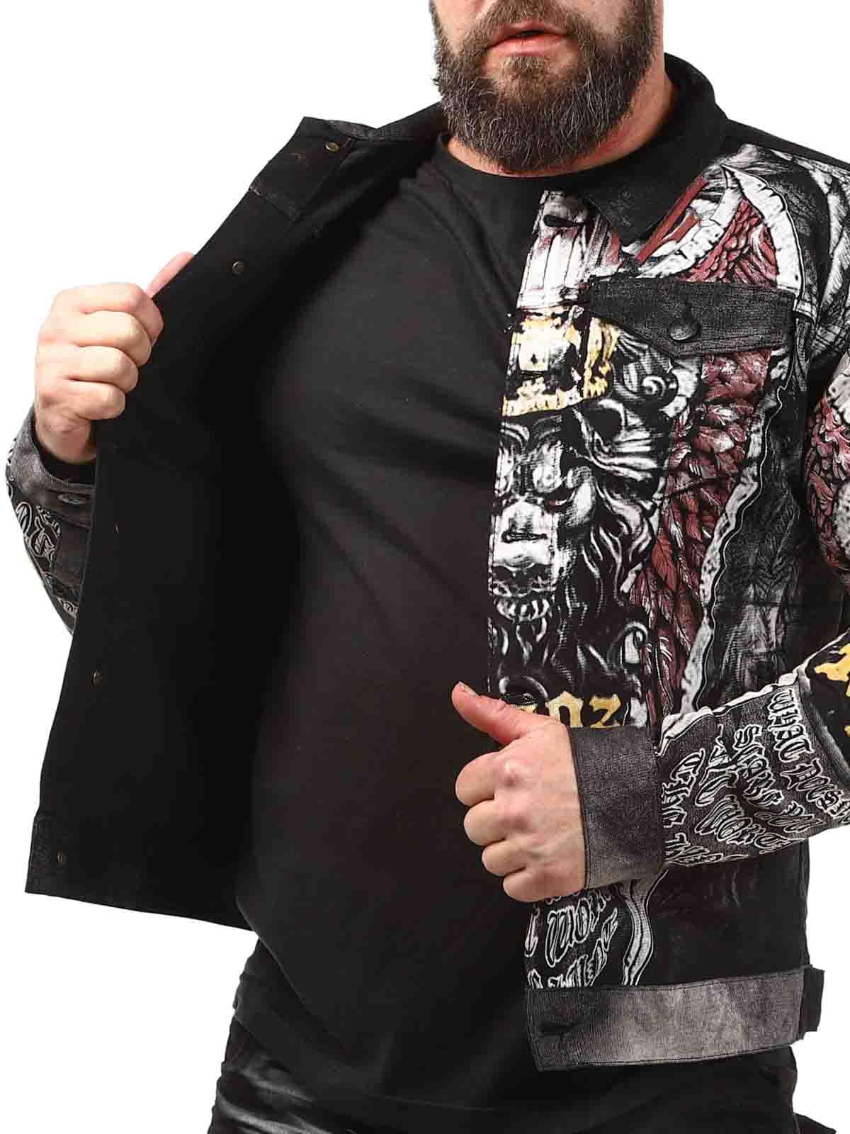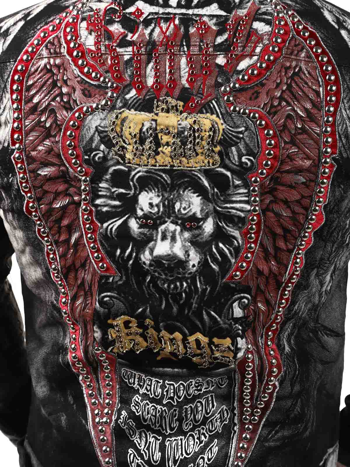 Wytrzymała kurtka z metalowymi nitami i nadrukami w kilku kolorach. Posiada kołnierz, dwie zamykane kieszenie na piersi oraz dwie otwarte kieszenie z przodu. Kurtka zapinana jest na guziki i ma regulowane mankiety również za pomocą guzików.