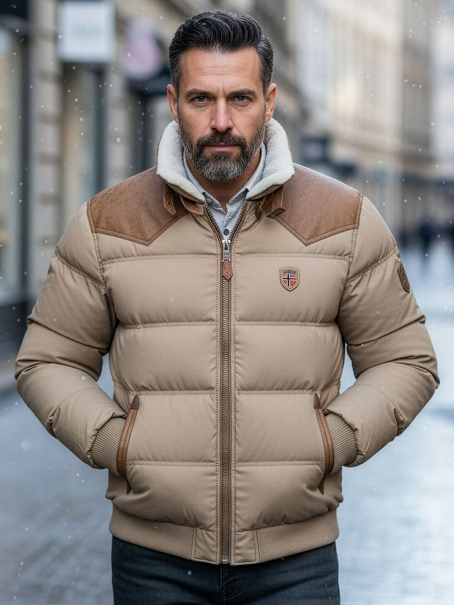 Kurtka posiada męski krój, stylowy szary kolor oraz dopełniające całości skórzane detale na piersi, ramionach i łokciach. Wyposażona w dwie ciepłe kieszenie w talii i dwie kieszenie wewnętrzne. Dzięki tej kurtce zagwarantujesz sobie zarówno skandynawski styl jak i ciepło na zimę!