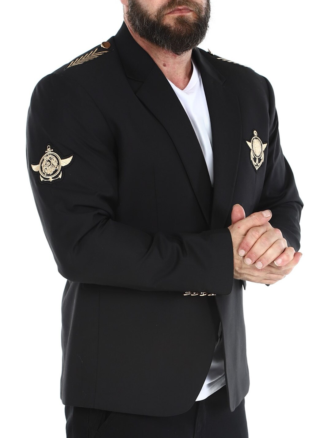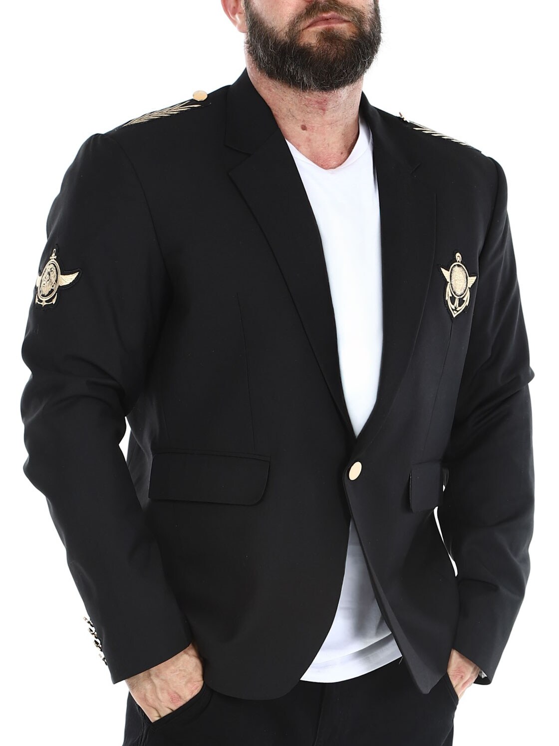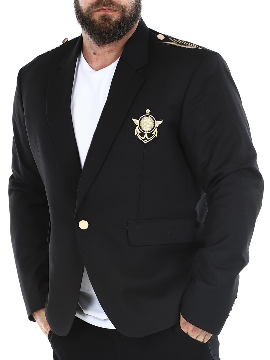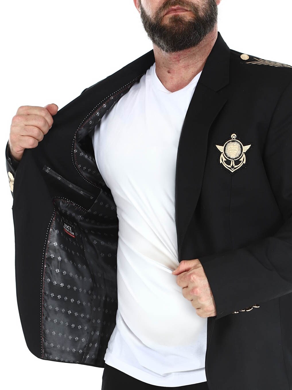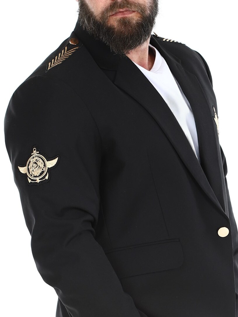 Czarna marynarka ze złotymi naszywkami z materiału. Model zapinany na jeden guzik, z kołnierzykiem i dwiema kieszeniami z przodu oraz trzema kieszeniami wewnętrznymi. Ta kurtka jest wykonana z miękkiej bawełny zapewniającej najwyższy komfort i jest dostępna tylko w RockDenim!