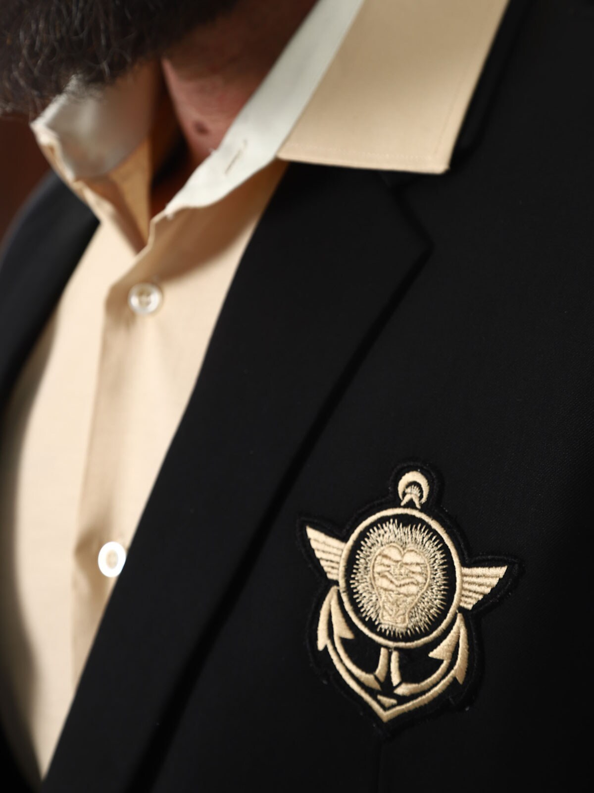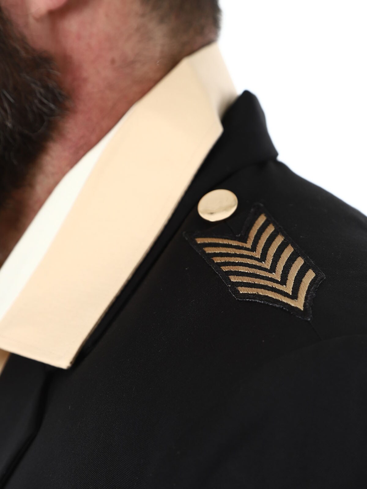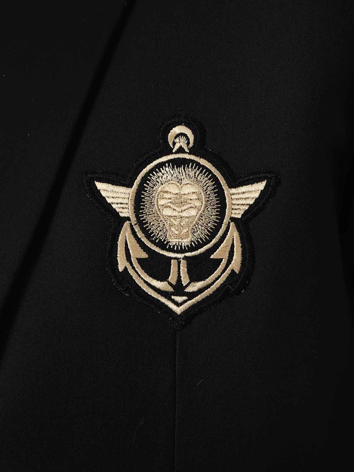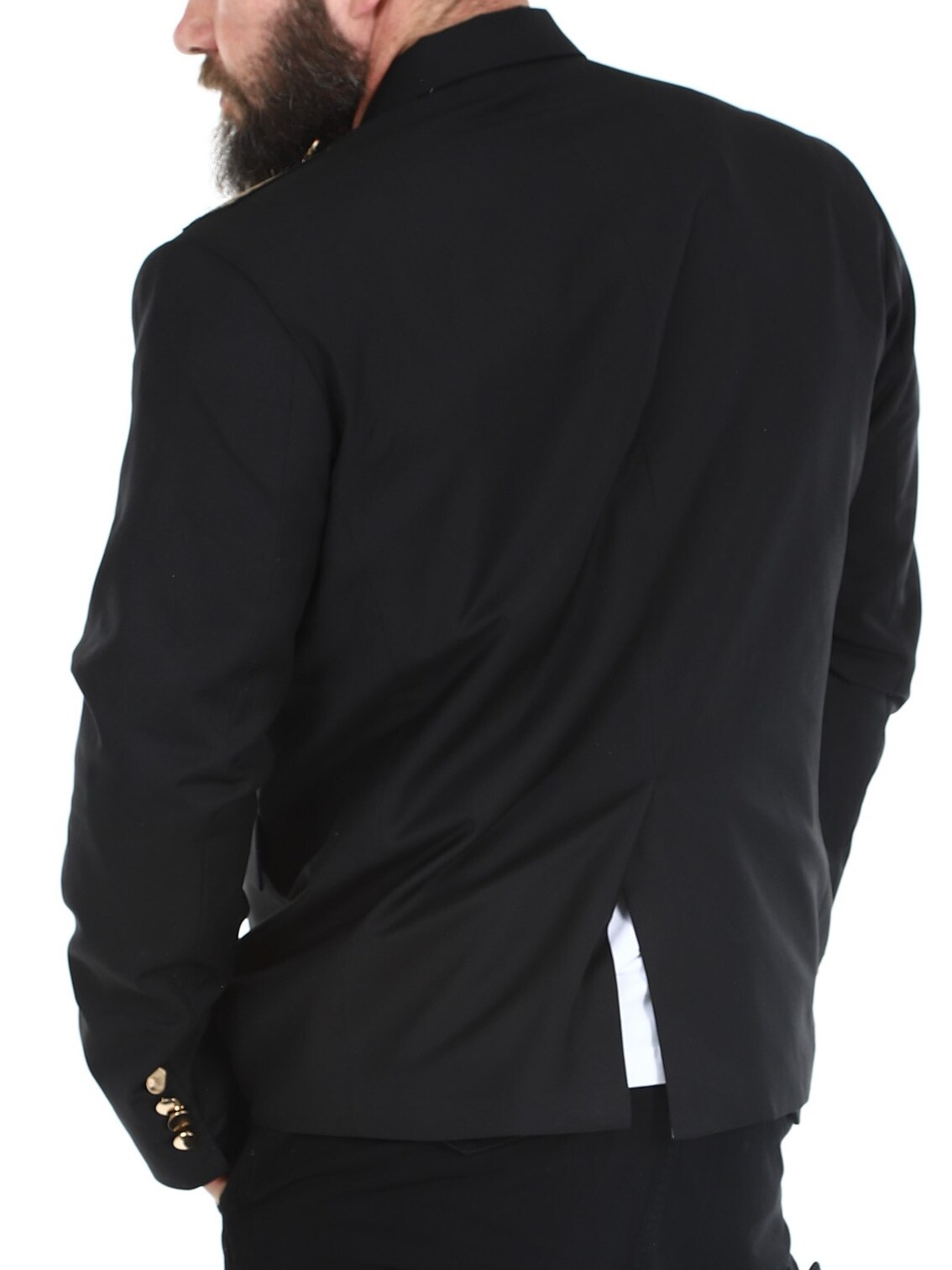 Czarna marynarka ze złotymi naszywkami z materiału. Model zapinany na jeden guzik, z kołnierzykiem i dwiema kieszeniami z przodu oraz trzema kieszeniami wewnętrznymi. Ta kurtka jest wykonana z miękkiej bawełny zapewniającej najwyższy komfort i jest dostępna tylko w RockDenim!
