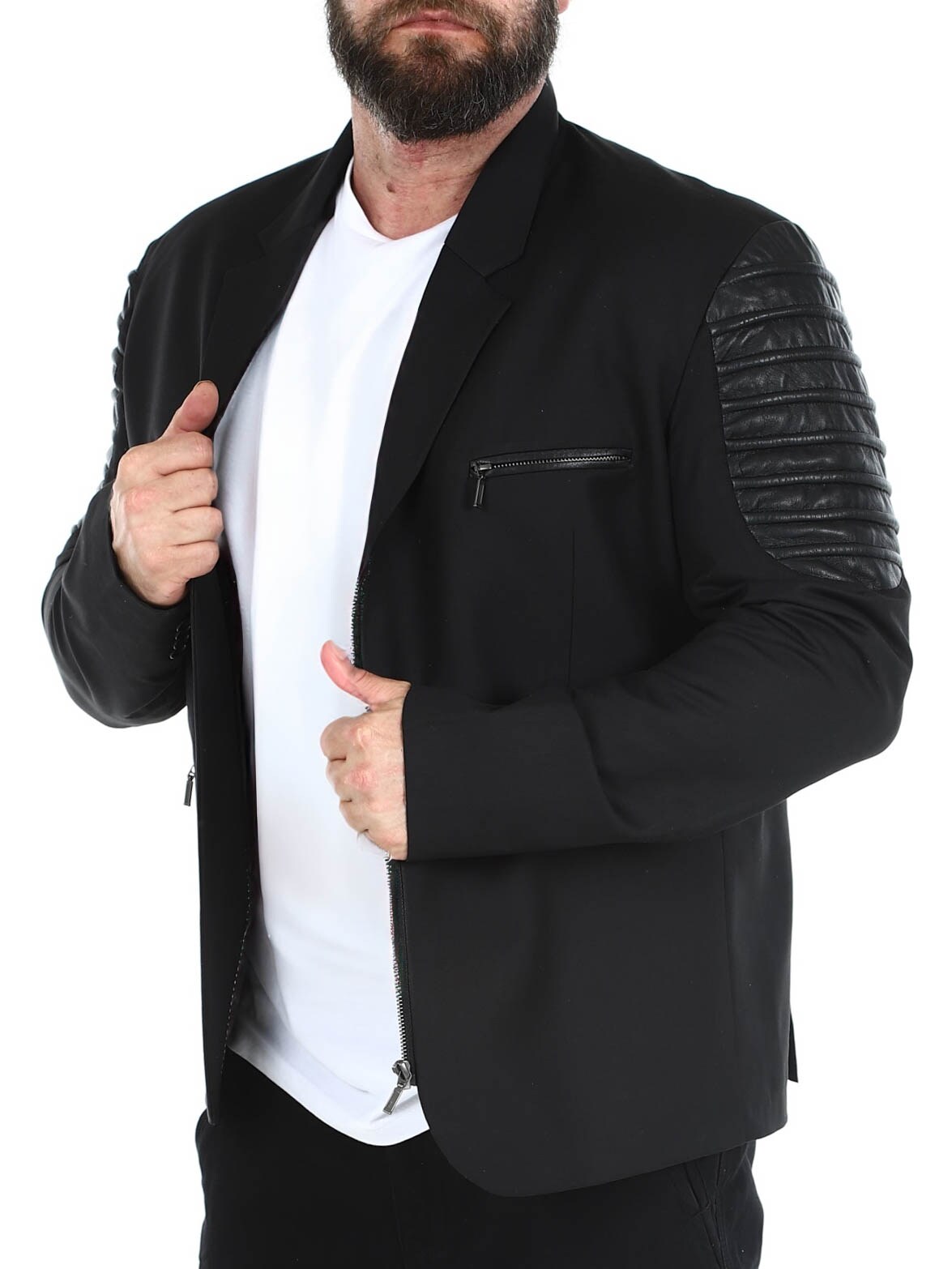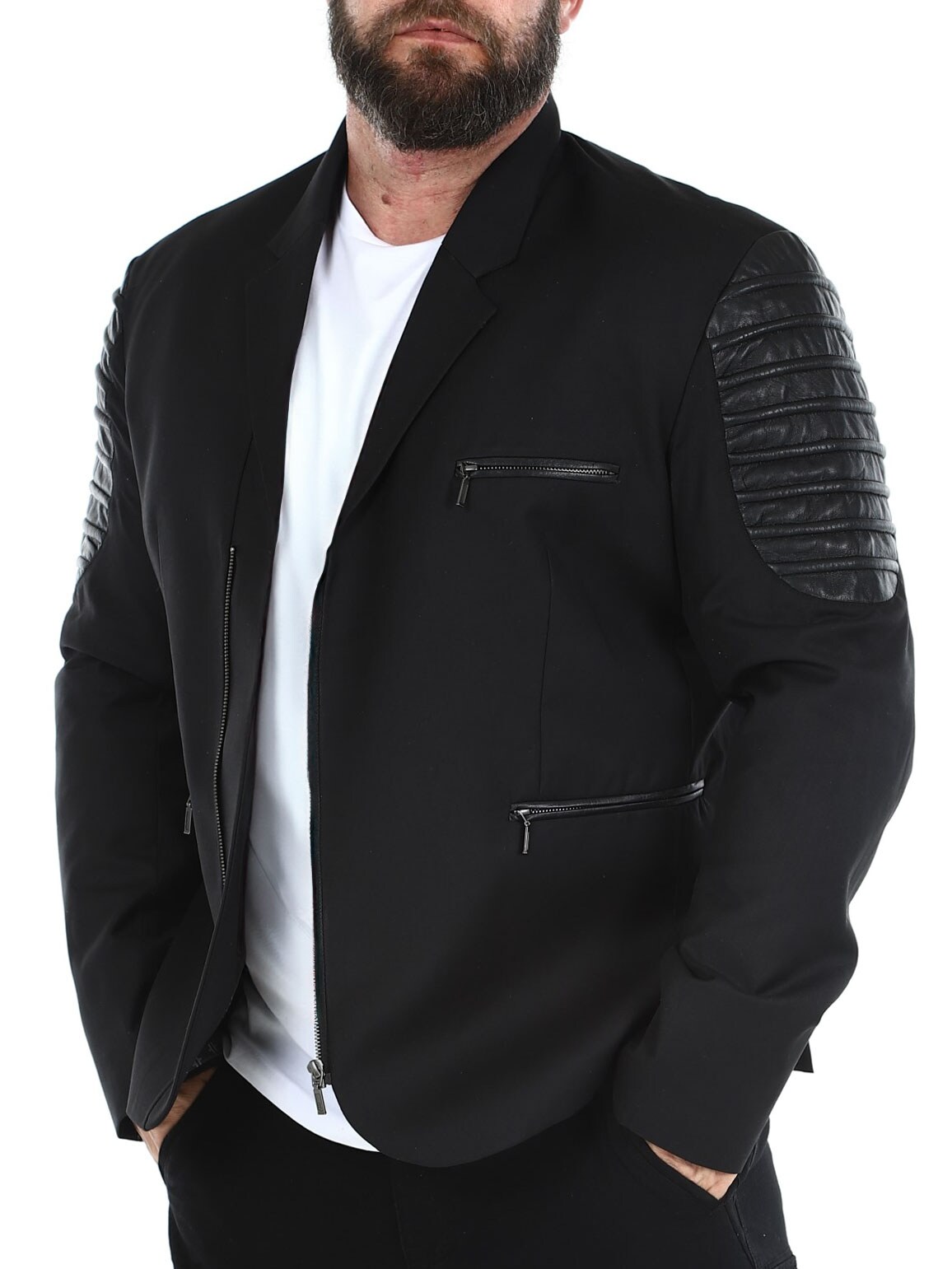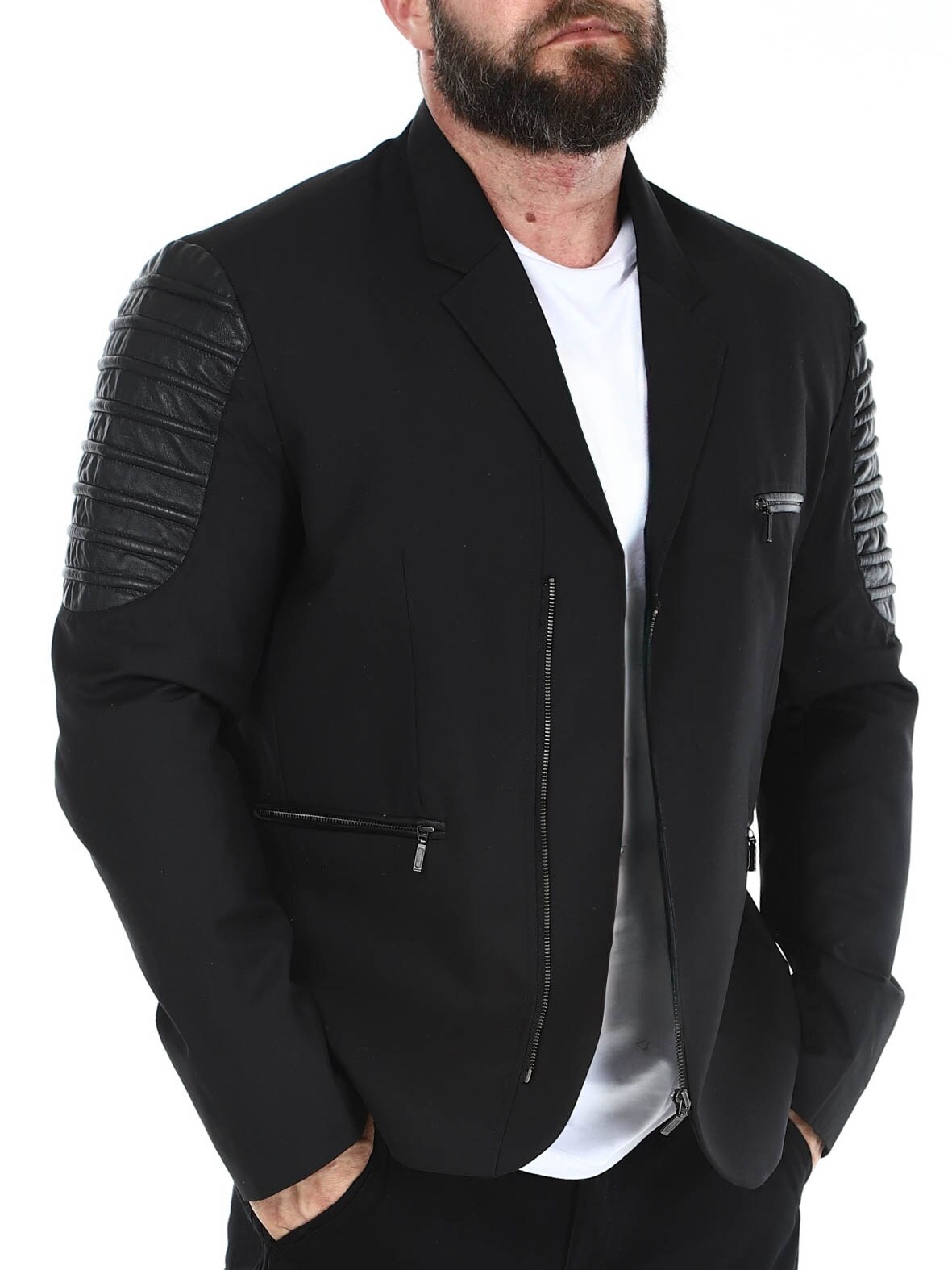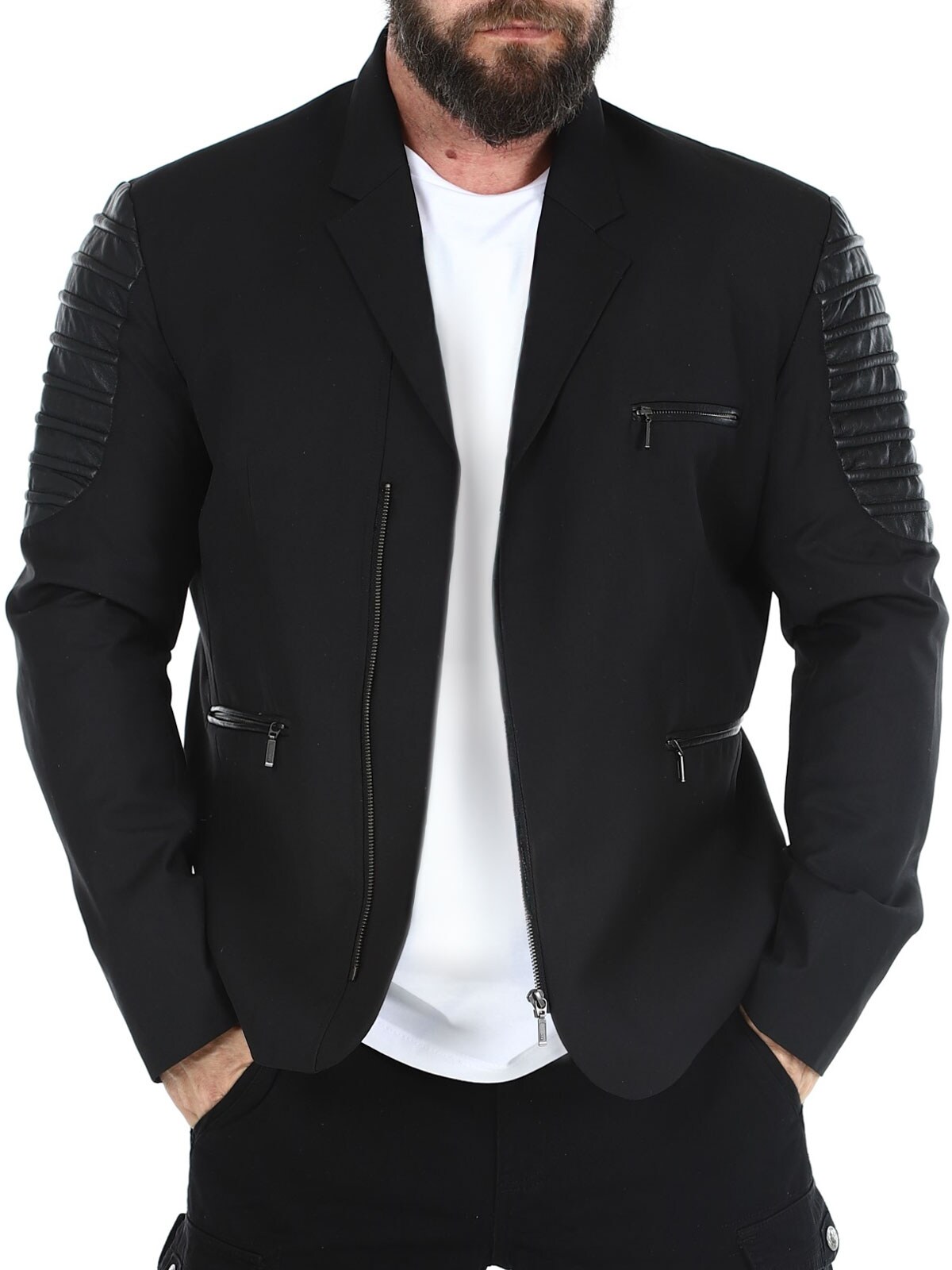 Bawełniana marynarka zapinana na zamek błyskawiczny i detalami z imitacji skóry. Posiada trzy przednie kieszenie zapinane na zamek oraz trzy otwarte kieszenie wewnętrzne. Marynarka dostępna tylko w RockDenim!