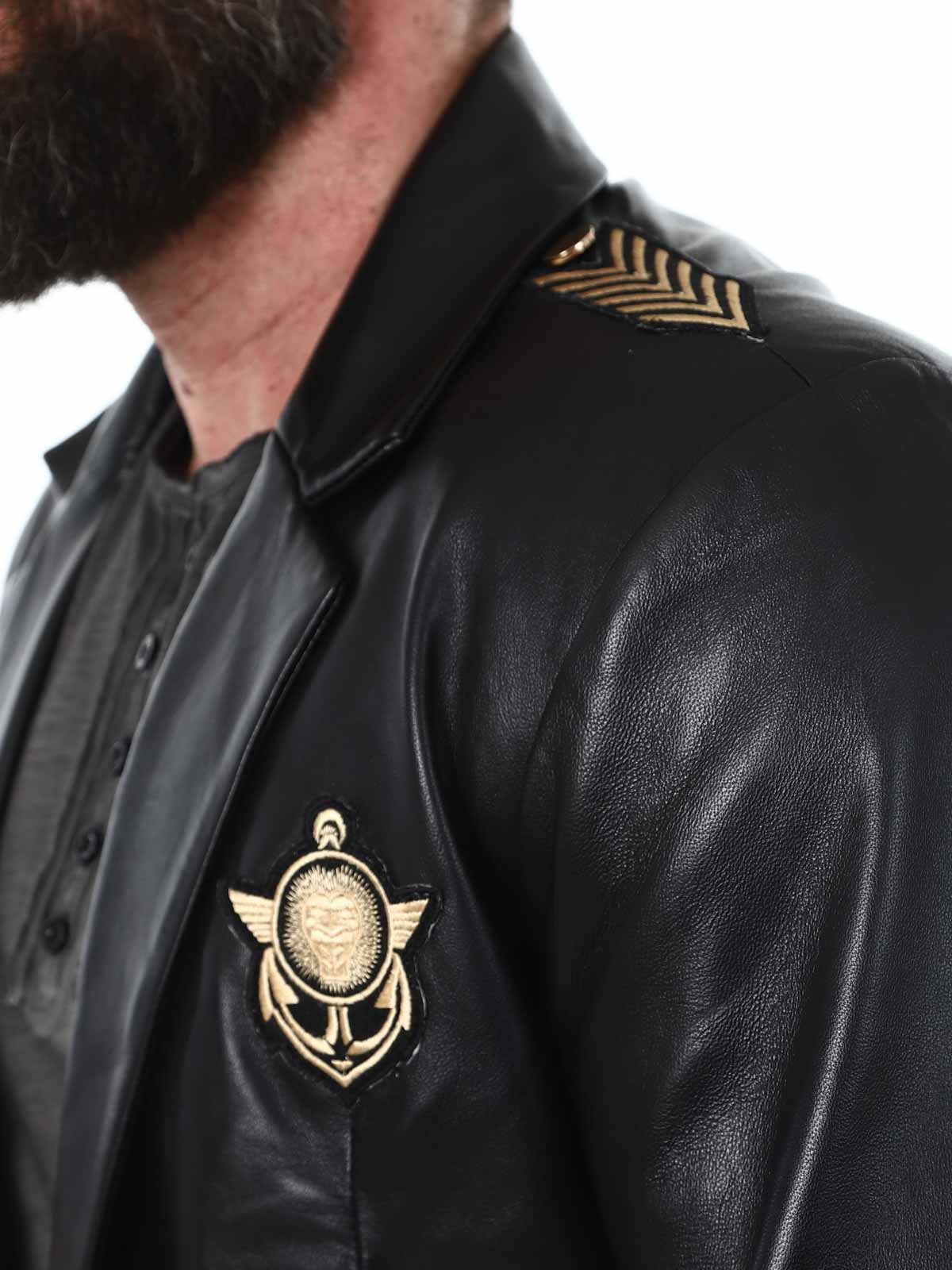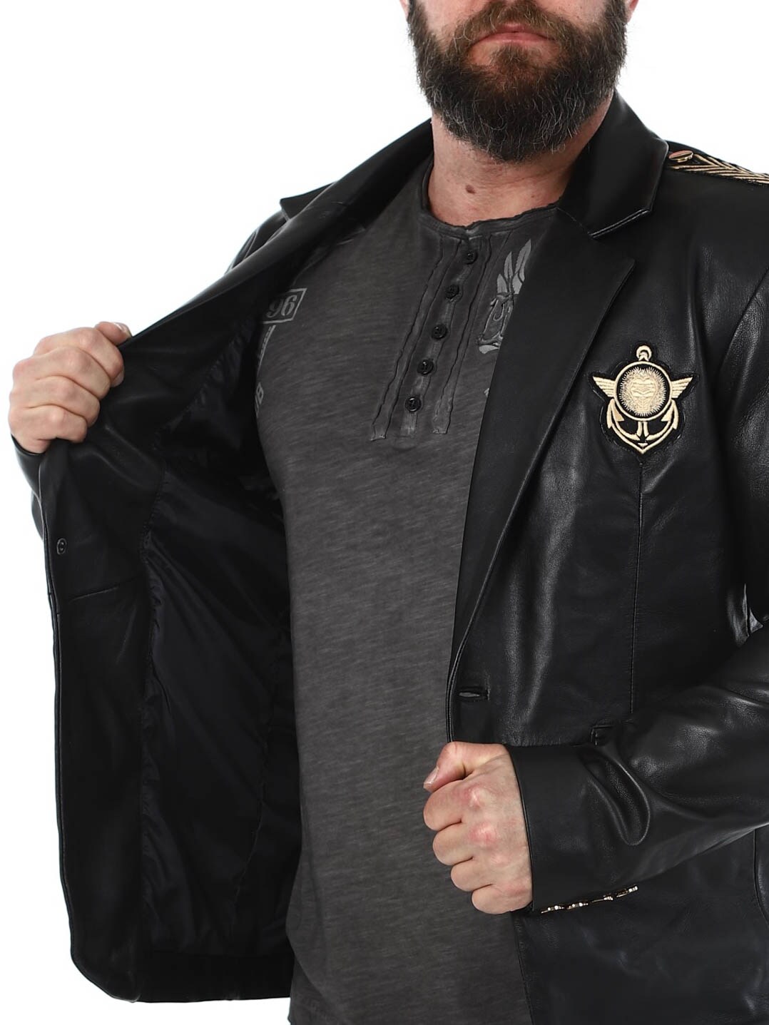 Czarna marynarka z naszywkami, wykonanymi z materiału w kolorze złotym. Jest to model zapinany na jeden guzik, z kołnierzykiem i dwiema kieszeniami z przodu oraz dwiema kieszeniami wewnątrz. Ta kurtka jest wykonana z miękkiej skóry zapewniającej najwyższy komfort i jest dostępna tylko w RockDenim!