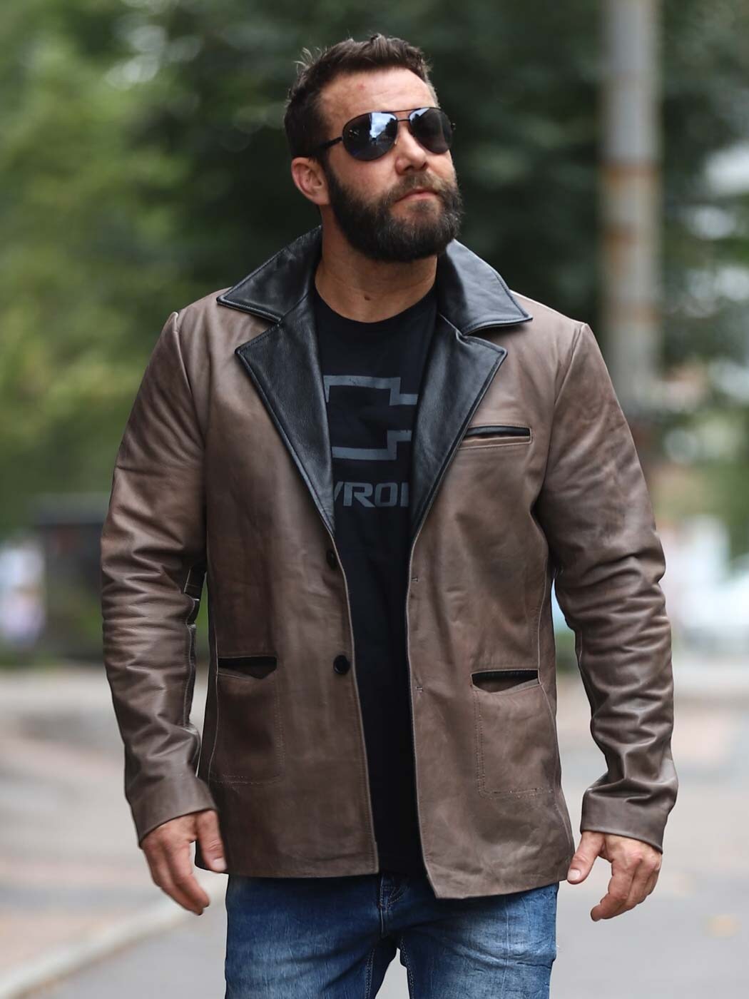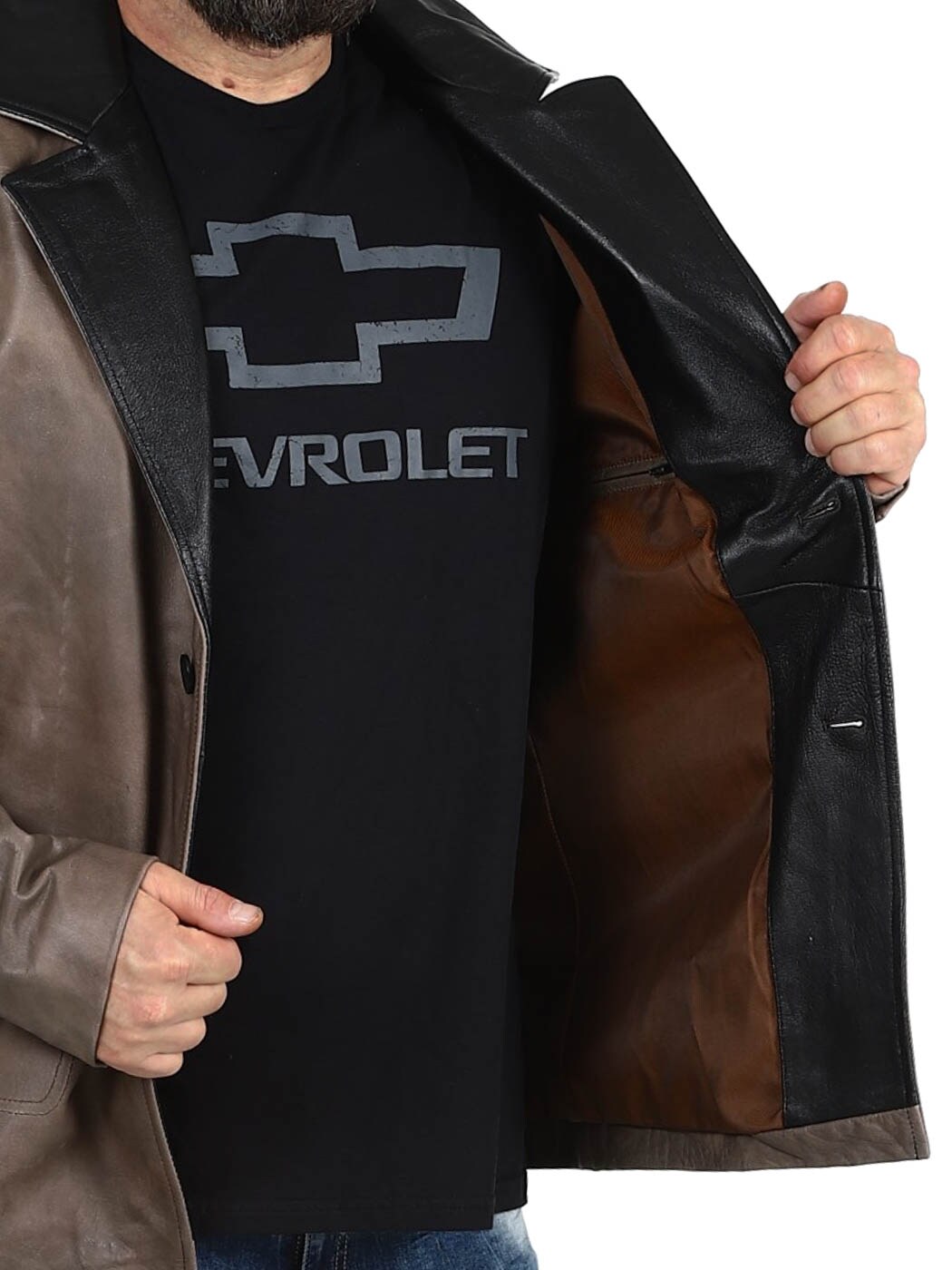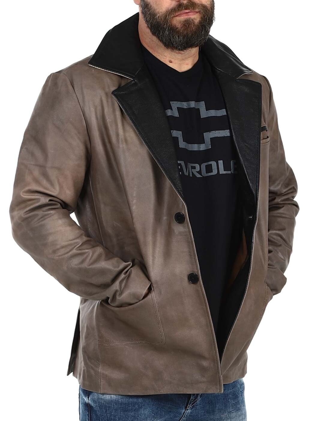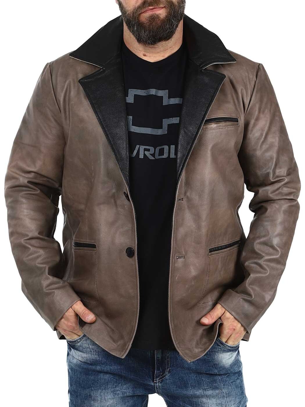 Brązowa marynarka ze skóry o wysokiej wytrzymałości, w stylu vintage, z czarnymi kontrastowymi detalami. Model jednorzędowy z klasycznym kołnierzem, trzema kieszeniami z przodu i dwiema wewnętrznymi. Dostępna tylko w RockDenim!