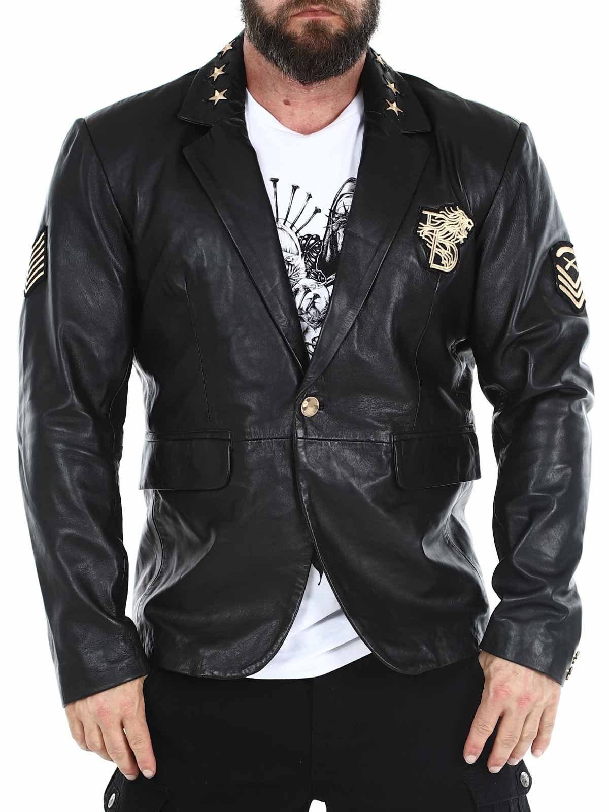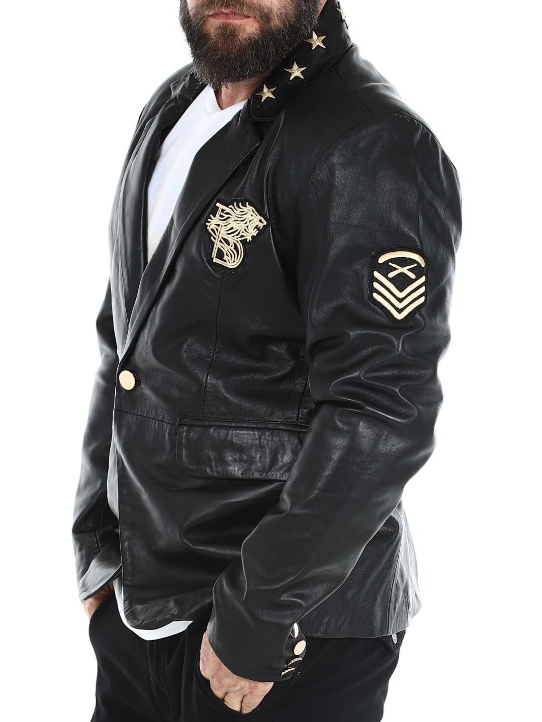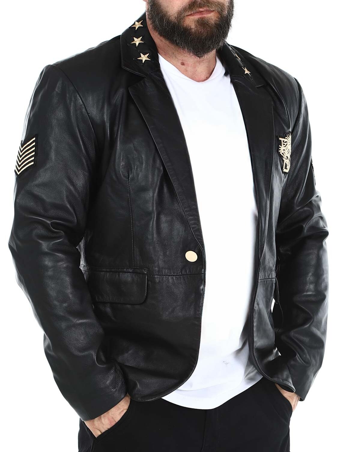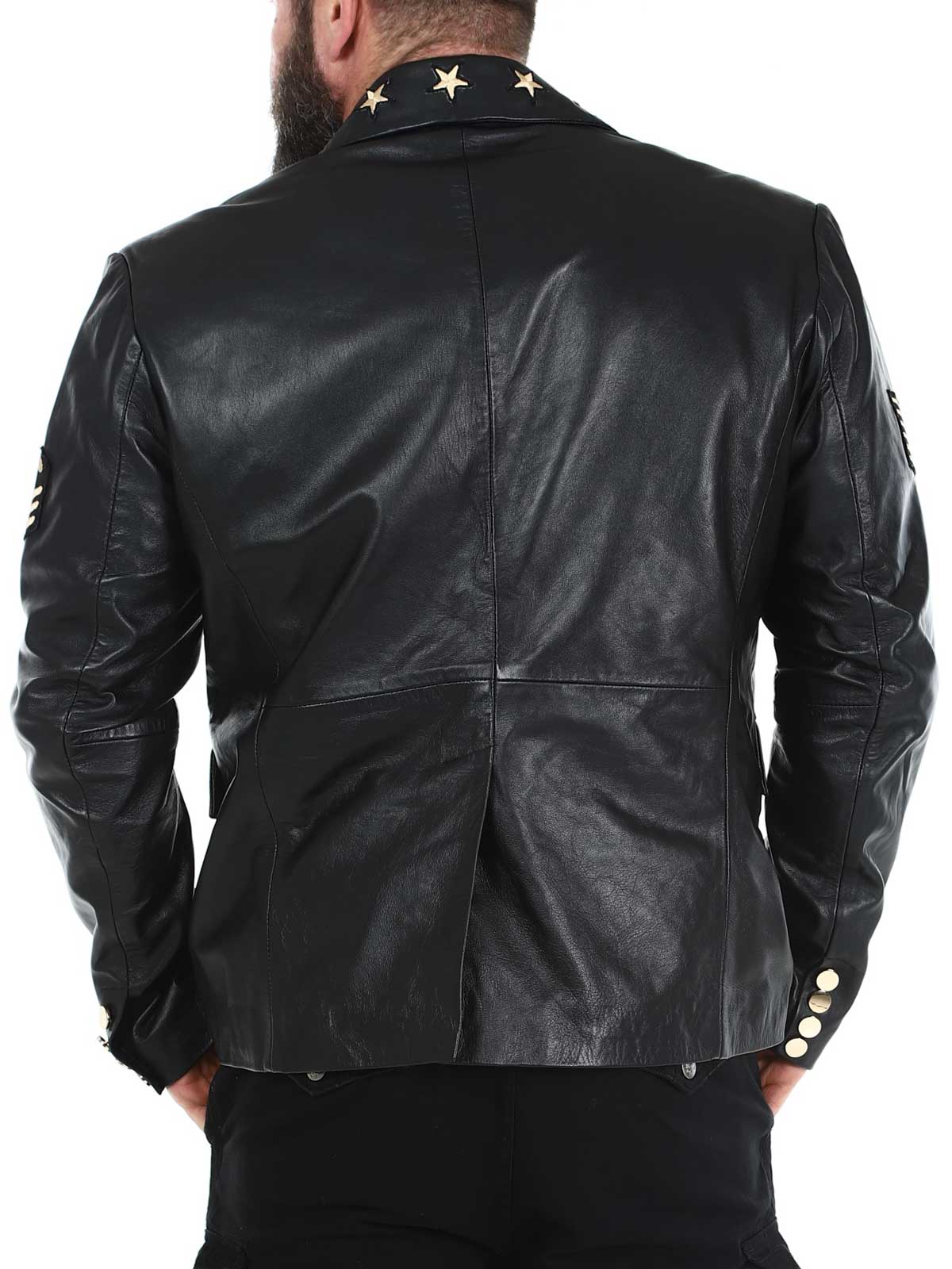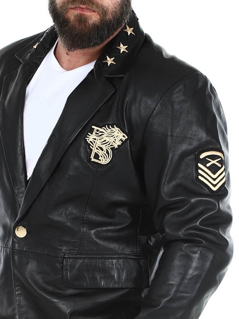 Czarna marynarka z naszywkami, wykonanymi z materiału w kolorze złotym. Jest to model zapinany na jeden guzik, z kołnierzykiem i dwiema kieszeniami z przodu oraz dwiema kieszeniami wewnątrz. Ta kurtka jest wykonana z miękkiej skóry zapewniającej najwyższy komfort i jest dostępna tylko w RockDenim!