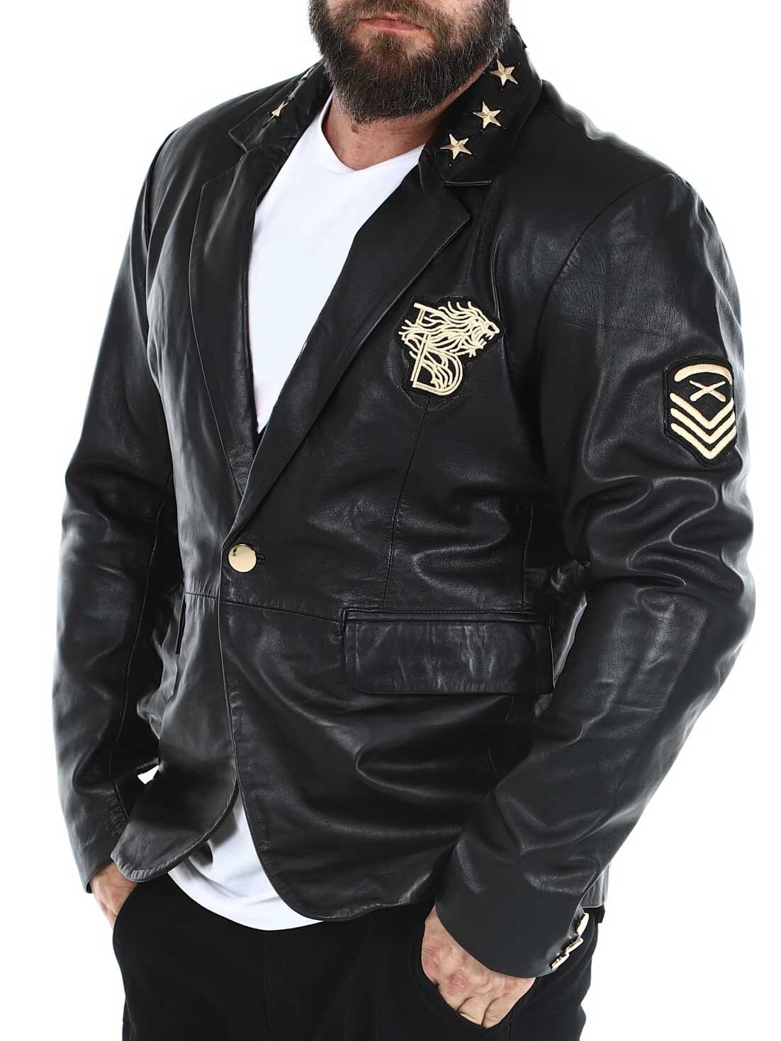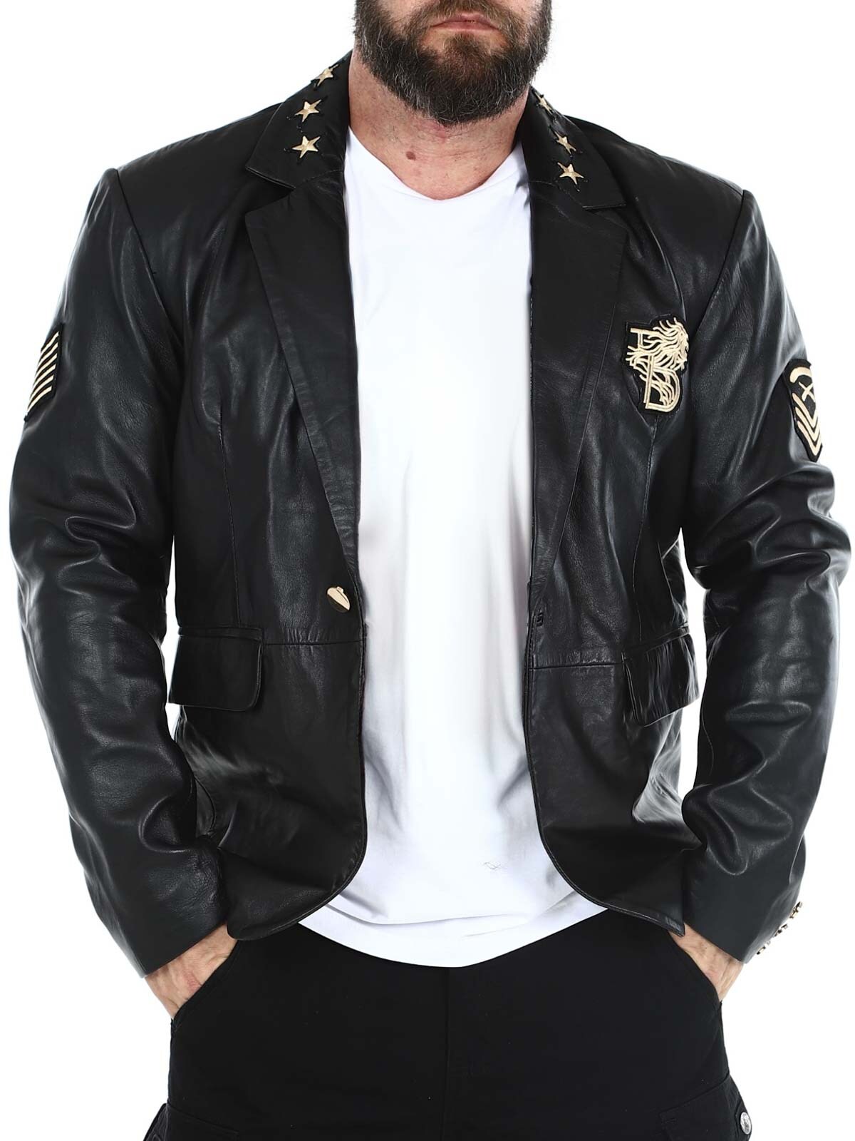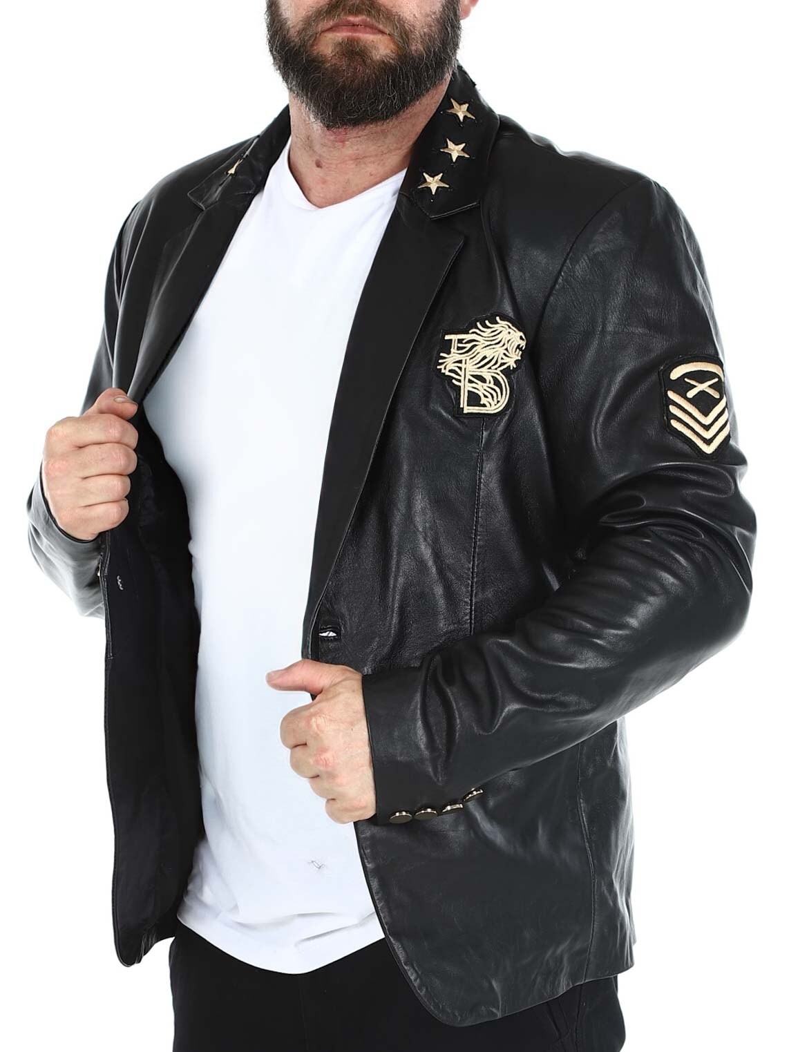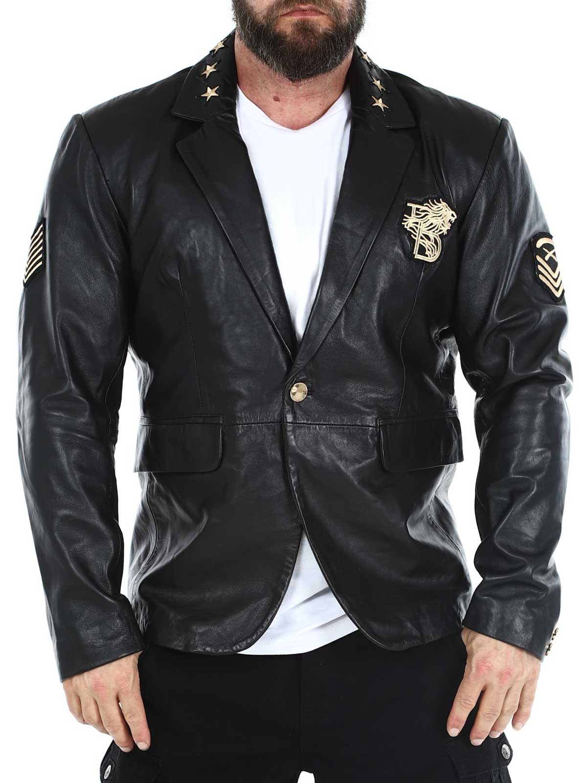 Czarna marynarka z naszywkami, wykonanymi z materiału w kolorze złotym. Jest to model zapinany na jeden guzik, z kołnierzykiem i dwiema kieszeniami z przodu oraz dwiema kieszeniami wewnątrz. Ta kurtka jest wykonana z miękkiej skóry zapewniającej najwyższy komfort i jest dostępna tylko w RockDenim!