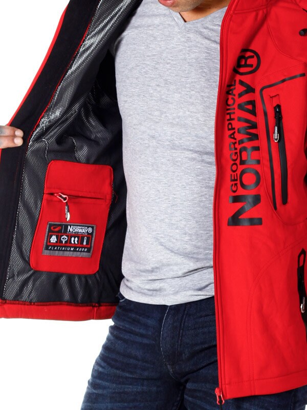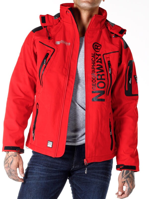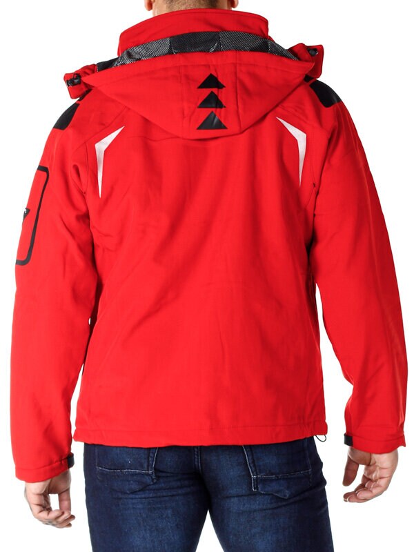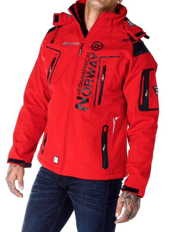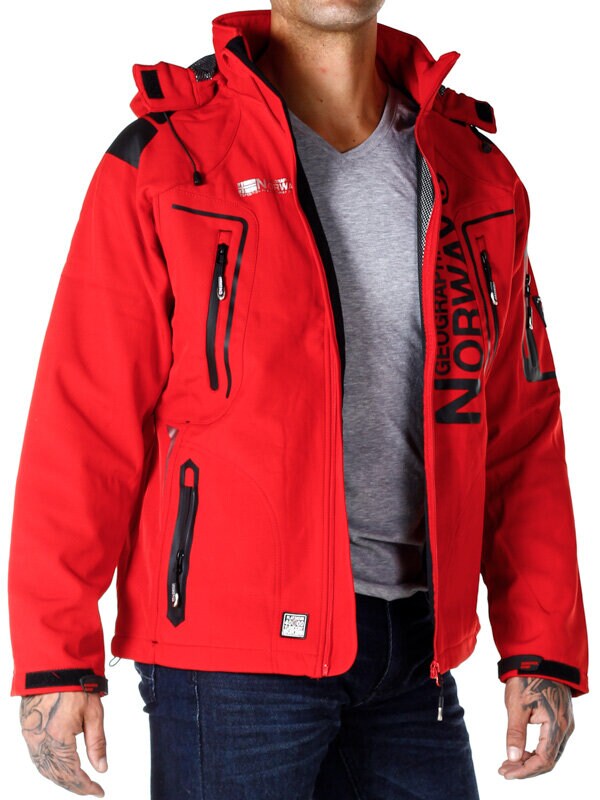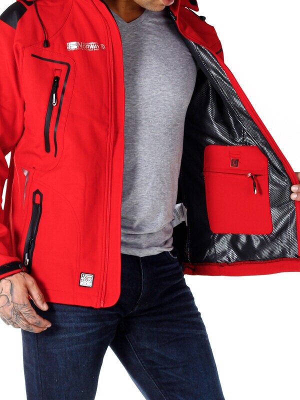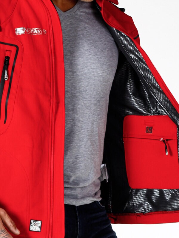 Kurtka z wiatroszczelnego i wodoodpornego materiału. Cienka podszewka z polaru, klejone szwy i dużo kieszeni sprawiają, że kurtka jest praktyczna i idealna na sezon wiosna/lato/jesień. Ma czerwony design z naszywkami i nadrukiem tekstowym w kontrastowym kolorze. Posiada cztery zamykane przednie kieszenie, dwie wewnętrzne kieszenie zapinane na zamek oraz odpinany kaptur.