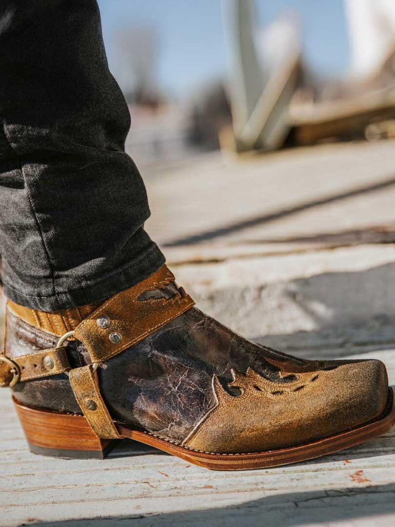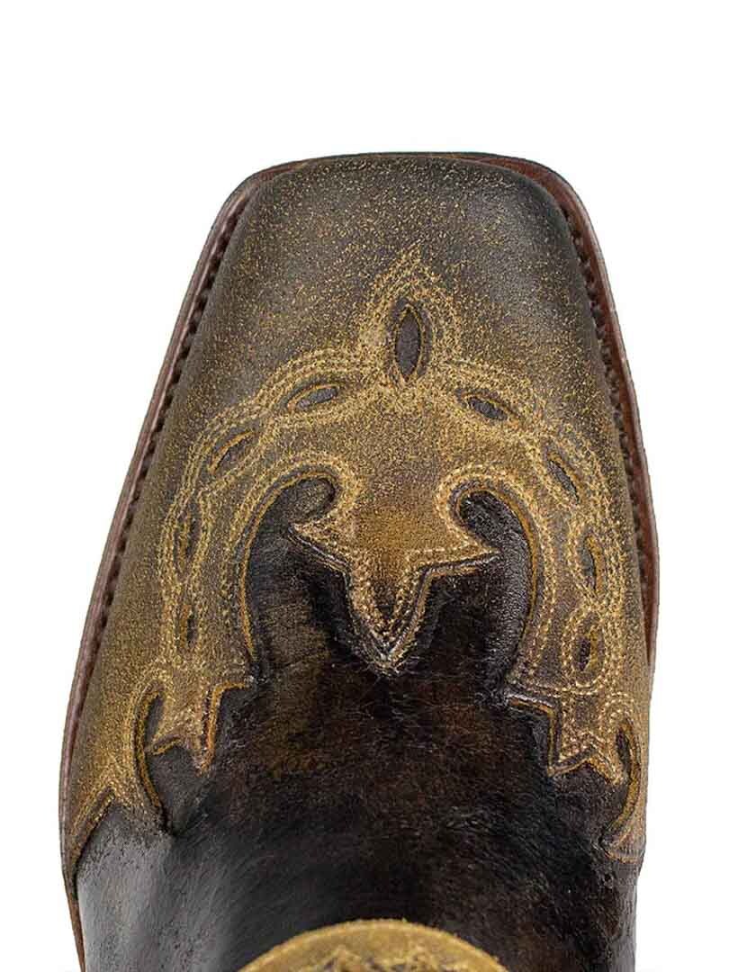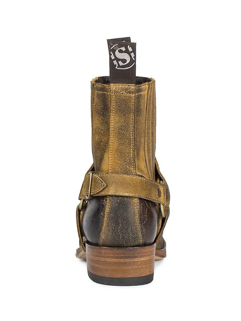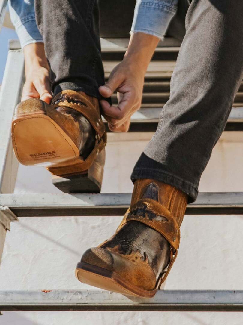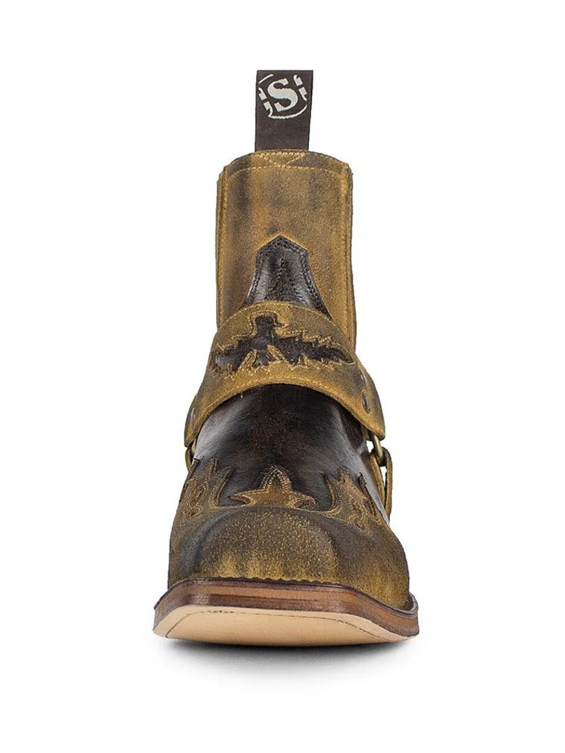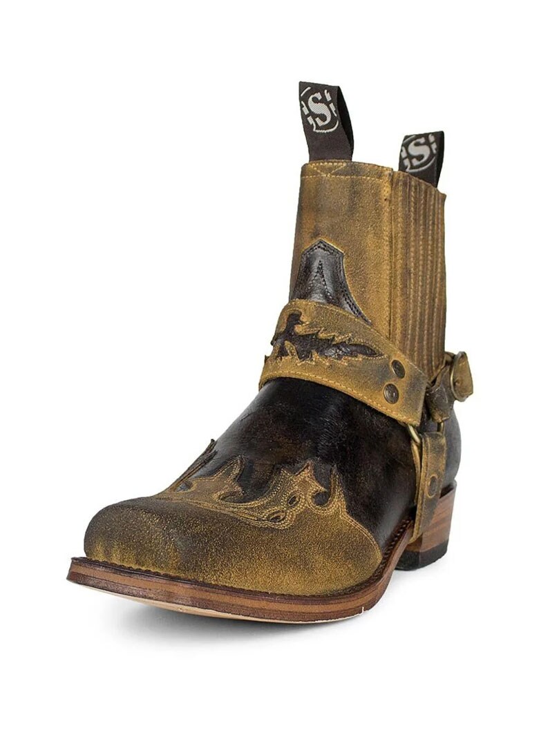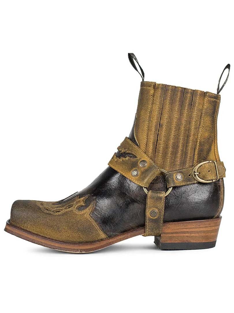 Model 7811 to kultowe botki Sendra Boots, które łączą ducha westernu z surową estetyką stylu biker. Wersja Barbados Quercia Cepillado / Camello USA Negro wyróżnia się postarzanym wykończeniem w brązowo-czarnych tonacjach, ręcznym wykonaniem i detalami w klimacie Dzikiego Zachodu. Ozdobny pasek z haftem i metalowymi nitami nadaje im unikalnego charakteru, a elastyczne wstawki zapewniają wygodę noszenia.