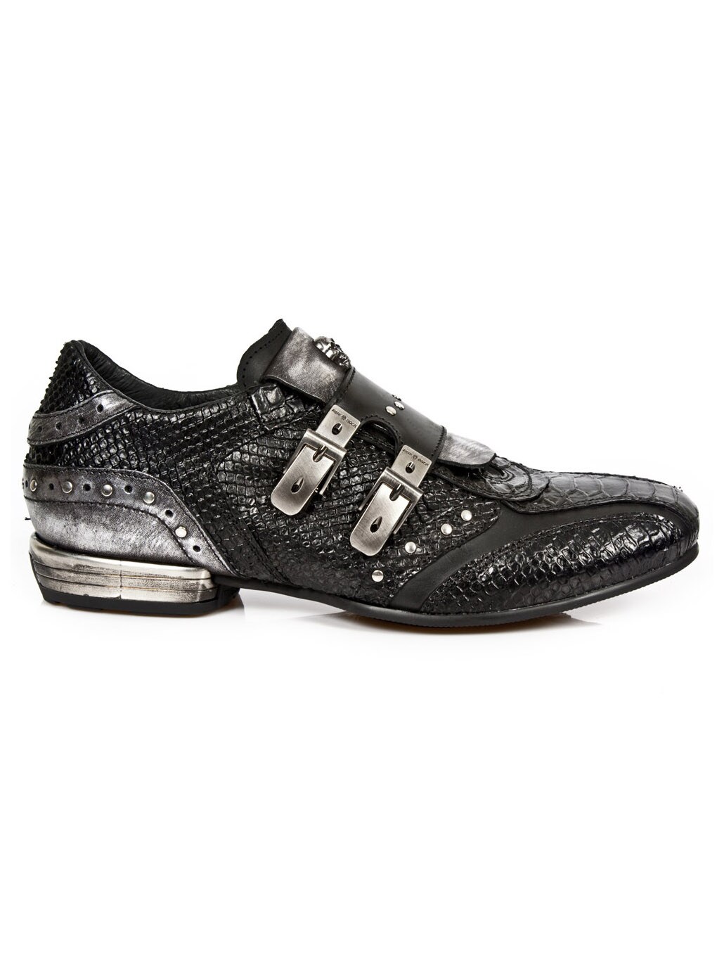Ręcznie robione, czarne buty z prawdziwej skóry ze wzorem i niską cholewką. Są ozdobione czerwonymi wstawkami, nitami i skórzanym paskiem z dwiema metalowymi klamrami. Z przodu butów naszywka z czaszkami. Ten but jest dostępny w limitowanej edycji!