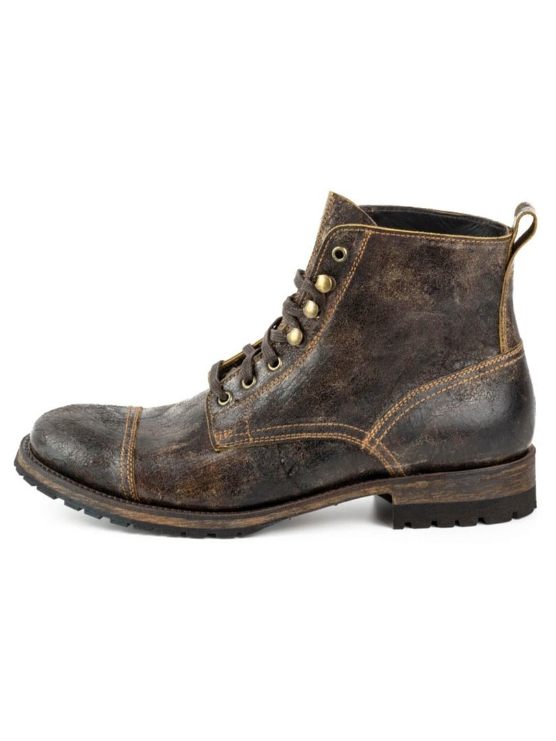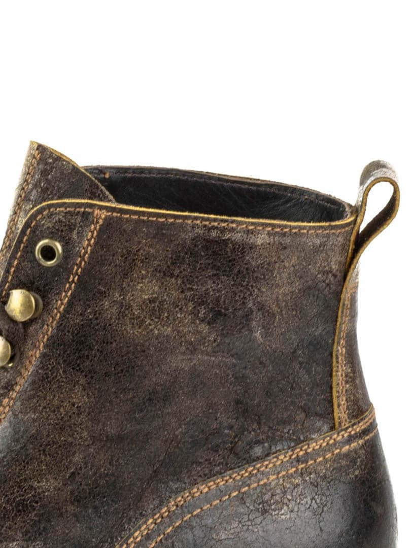 Mocne i pełne charakteru botki wykonane z ręcznie postarzanej skóry, która nadaje im autentyczny, zużyty wygląd. Model łączy klasyczny klimat vintage z nowoczesnymi, militarnymi akcentami. But został stworzony na lata: skórzano-gumowa podeszwa szyta w prestiżowym systemie Goodyear Welted zapewnia wyjątkową trwałość i stabilność. Uniwersalne botki o ponadczasowym charakterze – świetnie prezentują się zarówno z jeansami, jak i bardziej eleganckimi stylizacjami.