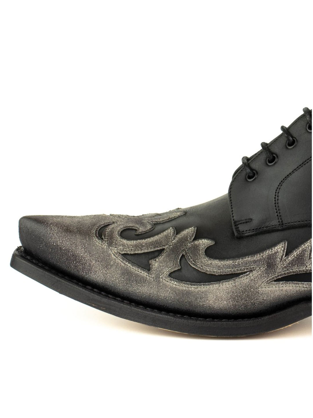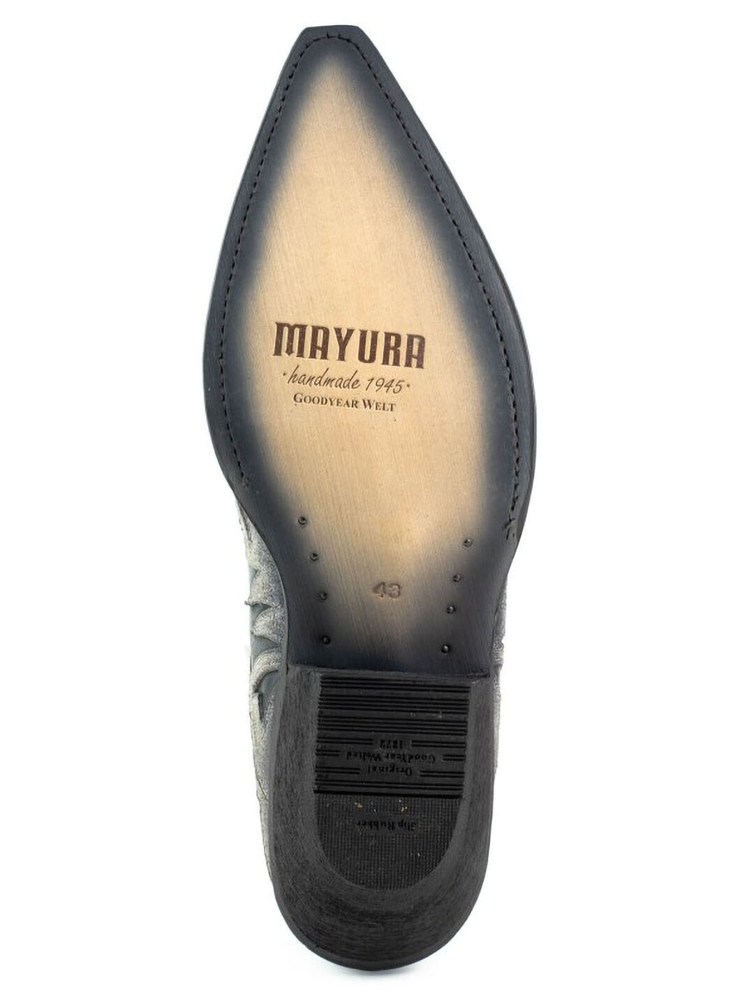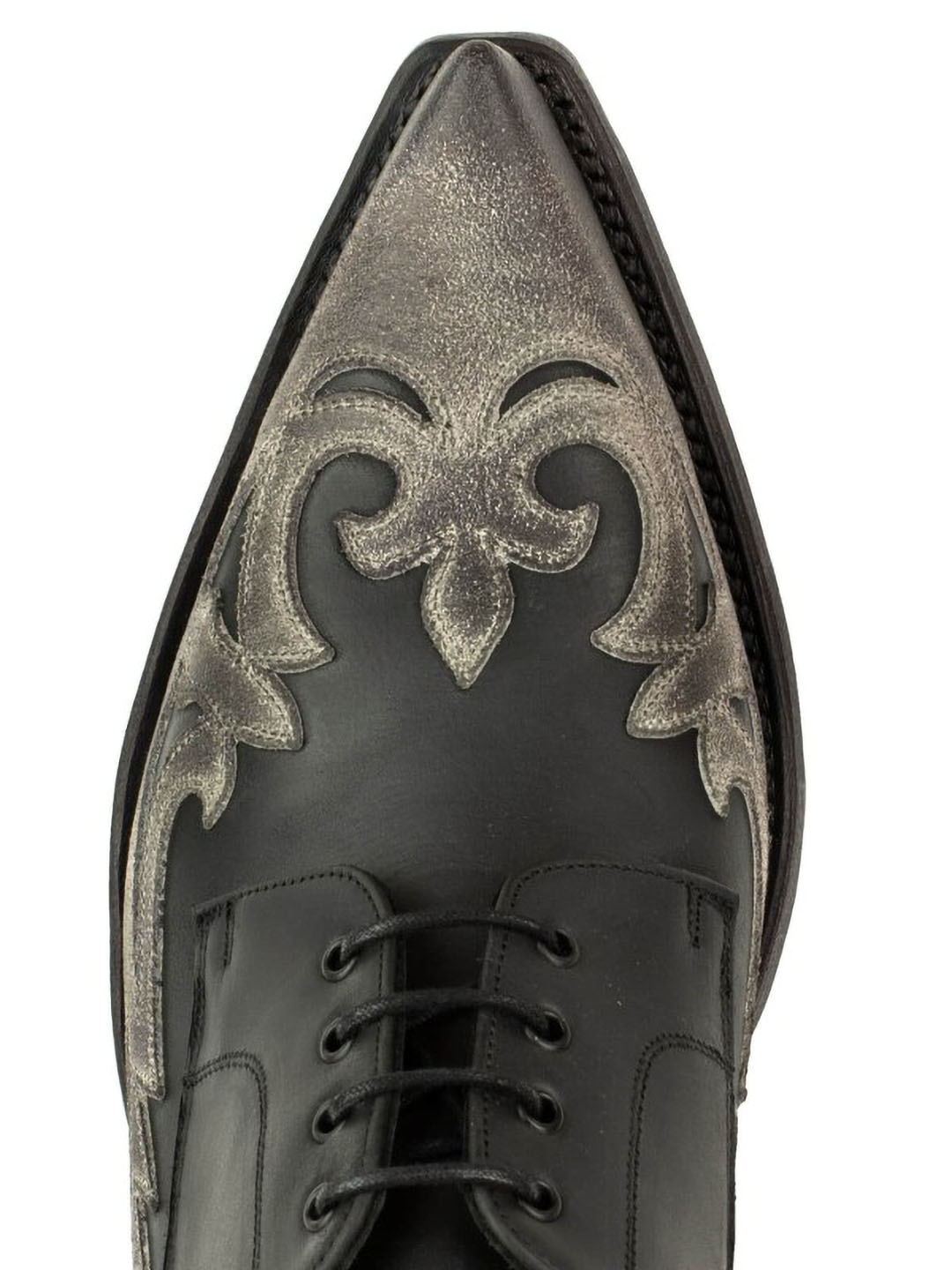 Unikatowe obuwie wykonane z rustykalnej, postarzanej skóry w odcieniach czerni i szarości, tworzących naturalny efekt vintage. Profilowany kształt oraz wycięte detale nadają im wyraźny, westernowy charakter. Podeszwa wykonana z hiszpańskiej skóry cielęcej, a konstrukcja ręcznie wykonana w systemie Goodyear Welt – jednej z najbardziej trwałych i prestiżowych metod produkcji obuwia. Efekt to but o imponującej trwałości, stabilności i komforcie, dopasowujący się do stopy z czasem. Idealny wybór dla osób ceniących solidność, elegancję i charakter!