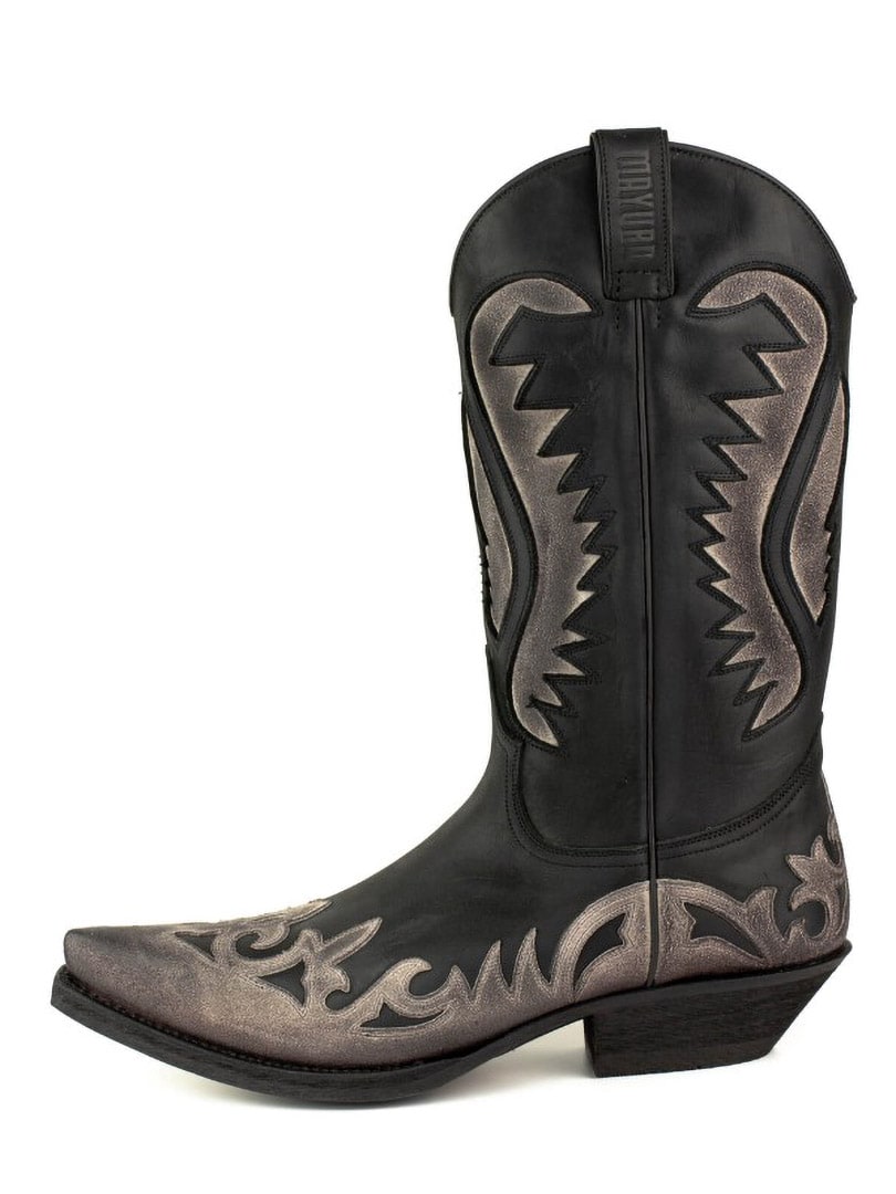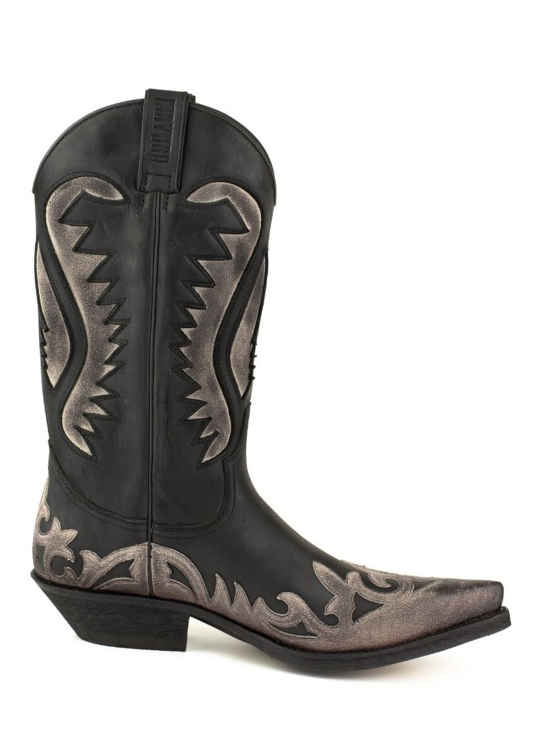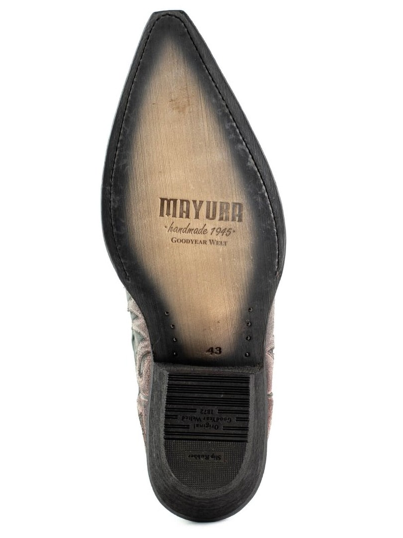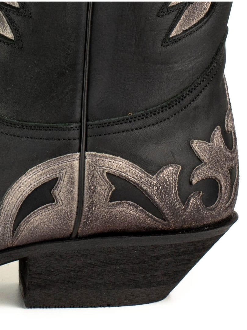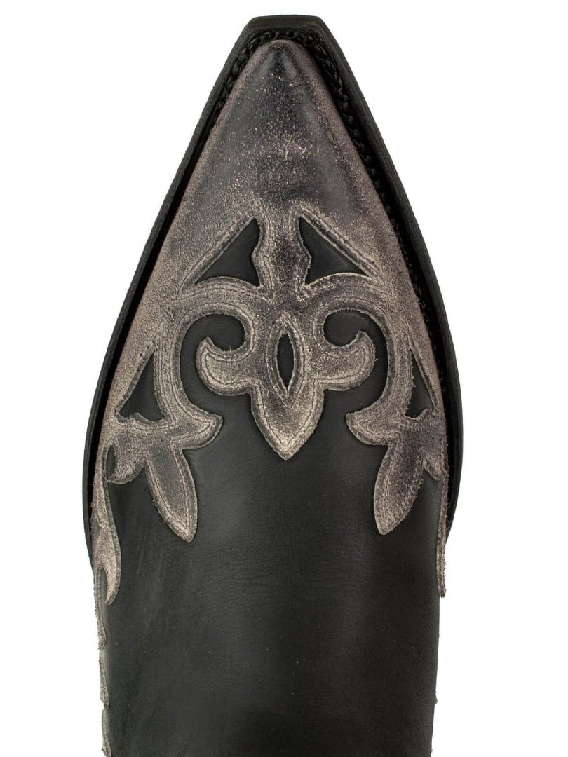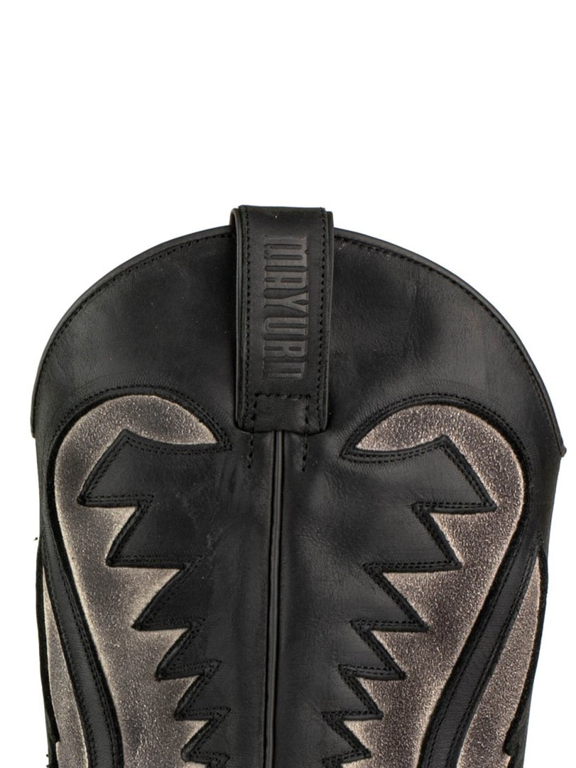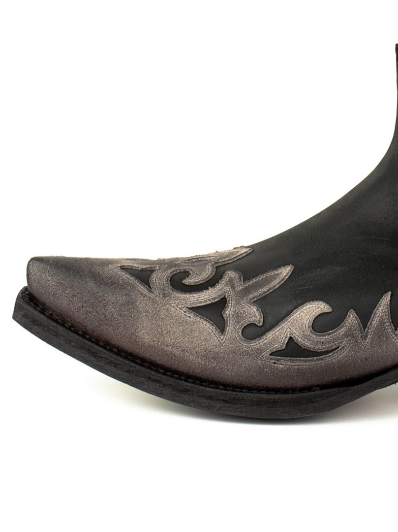 Buty wykonano z naturalnej, postarzonej skóry krowiej, ręcznie olejowanej, aby uzyskać unikalny kontrast kolorów i autentyczny efekt vintage. Zdobione są klasycznymi haftami westernowymi i posiadają elegancki, spiczasty nosek. Skórzana podeszwa z hiszpańskiej cielęcej skóry oraz konstrukcja Goodyear Welt gwarantują doskonałą trwałość, stabilność i najwyższy komfort.