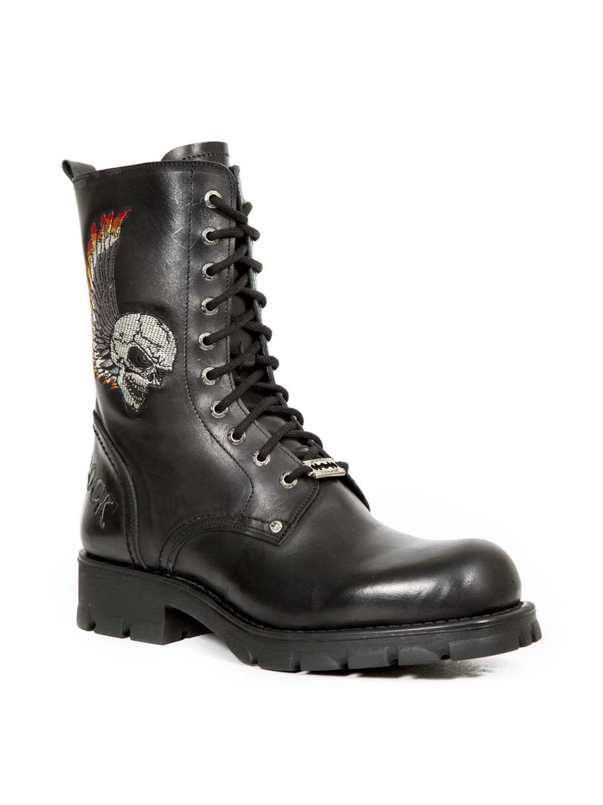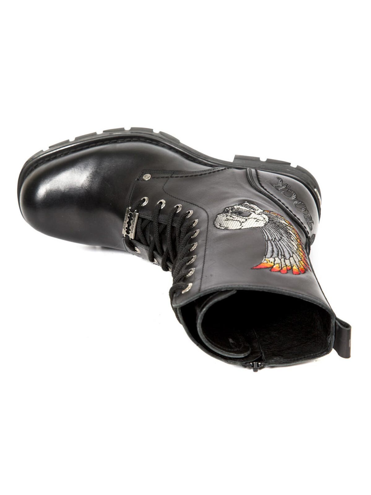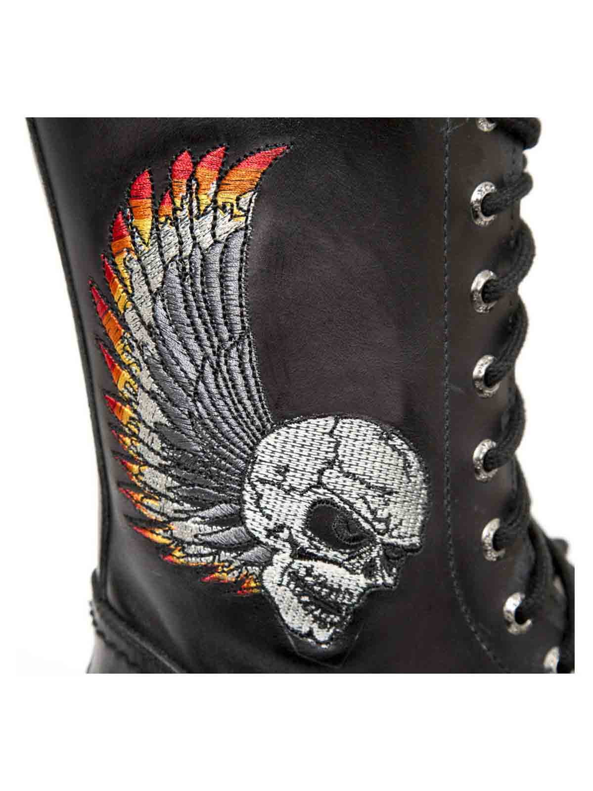 Czarne buty z haftowanym wzorem uskrzydlonej czaszki. Posiadają wysoką cholewkę ze sznurowadłami oraz zamek błyskawiczny po wewnętrznej stronie, który ułatwia ich zakładanie i zdejmowanie. Wykonane ręcznie z prawdziwej skóry i dostępne w limitowanych edycjach, dzięki czemu każdy but jest wyjątkowy.