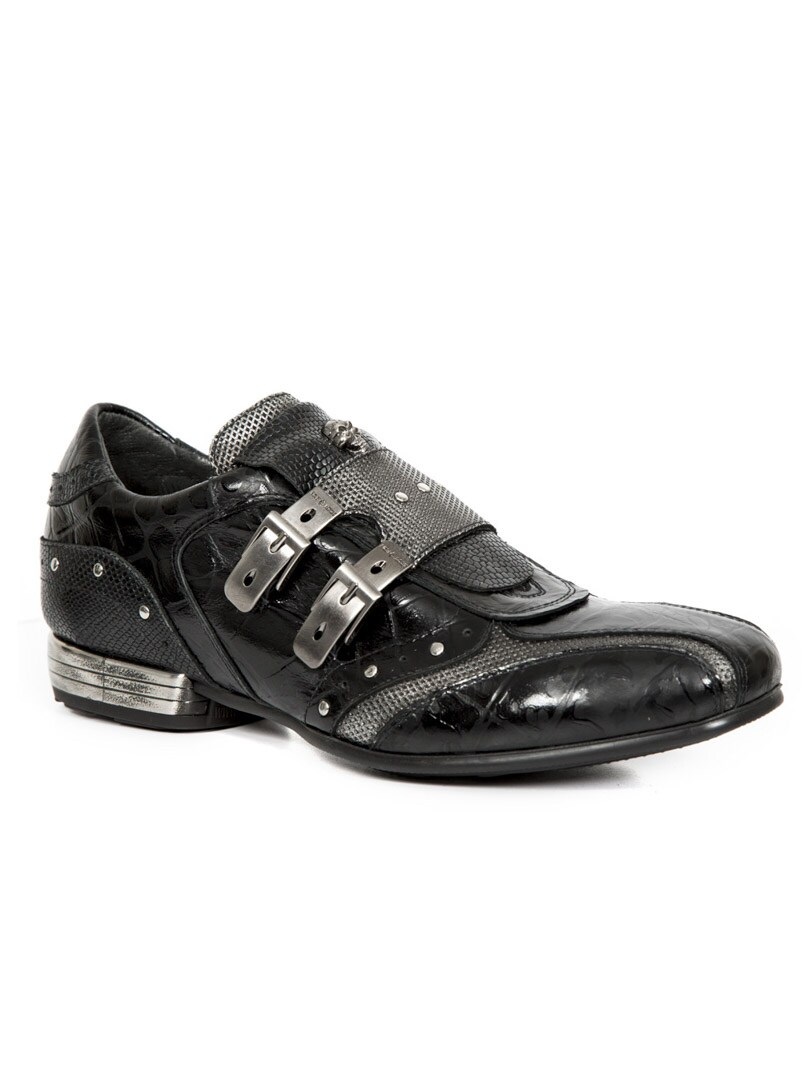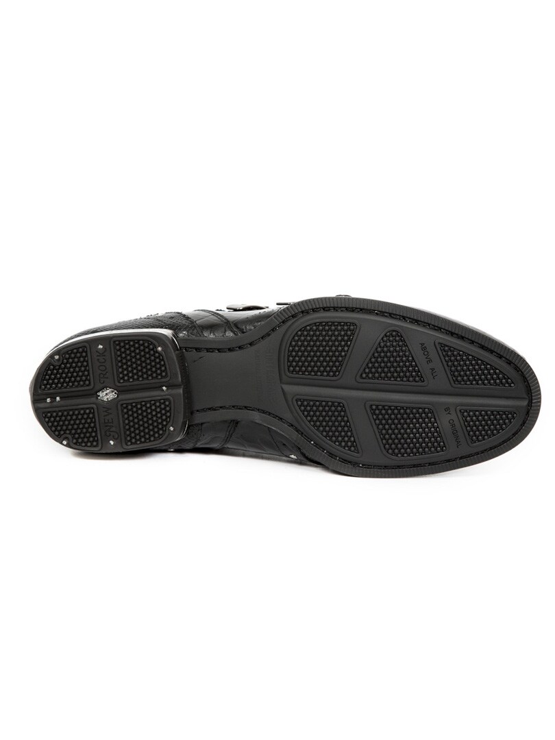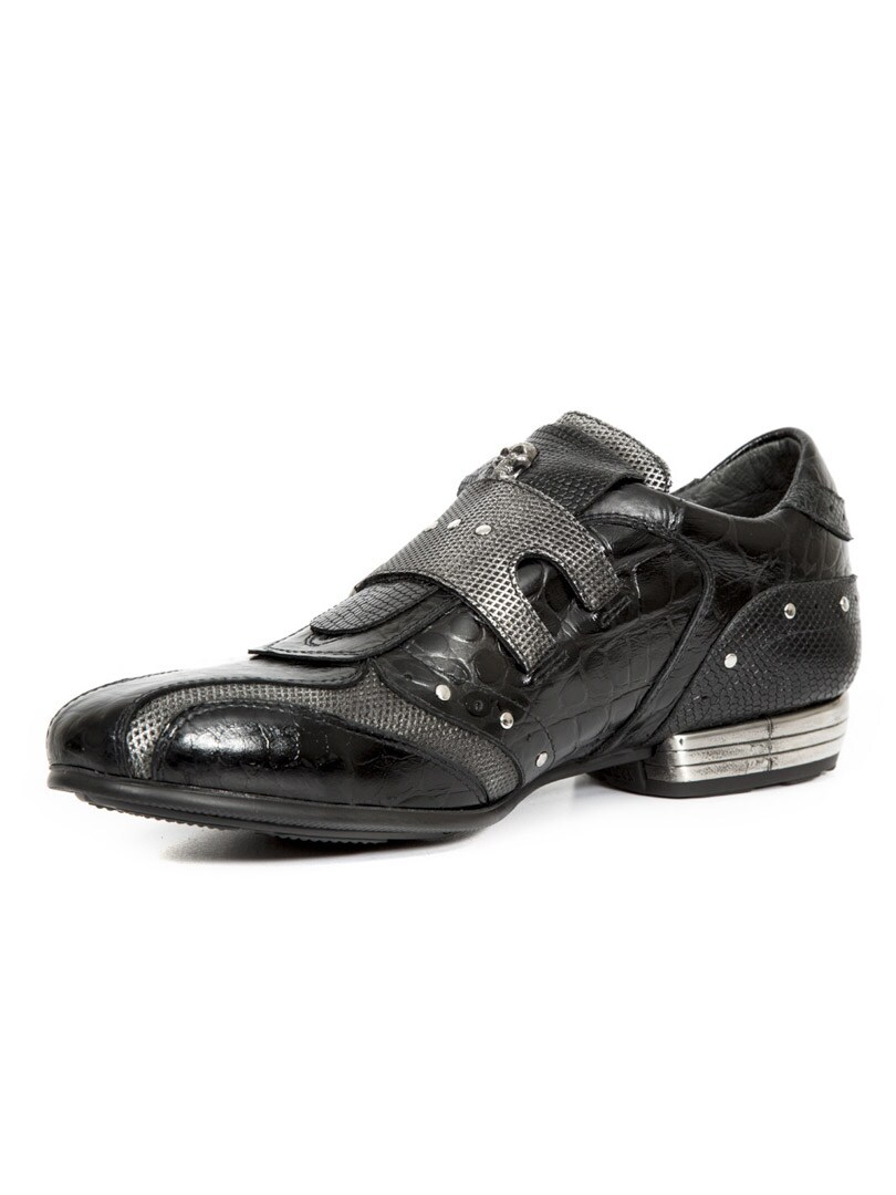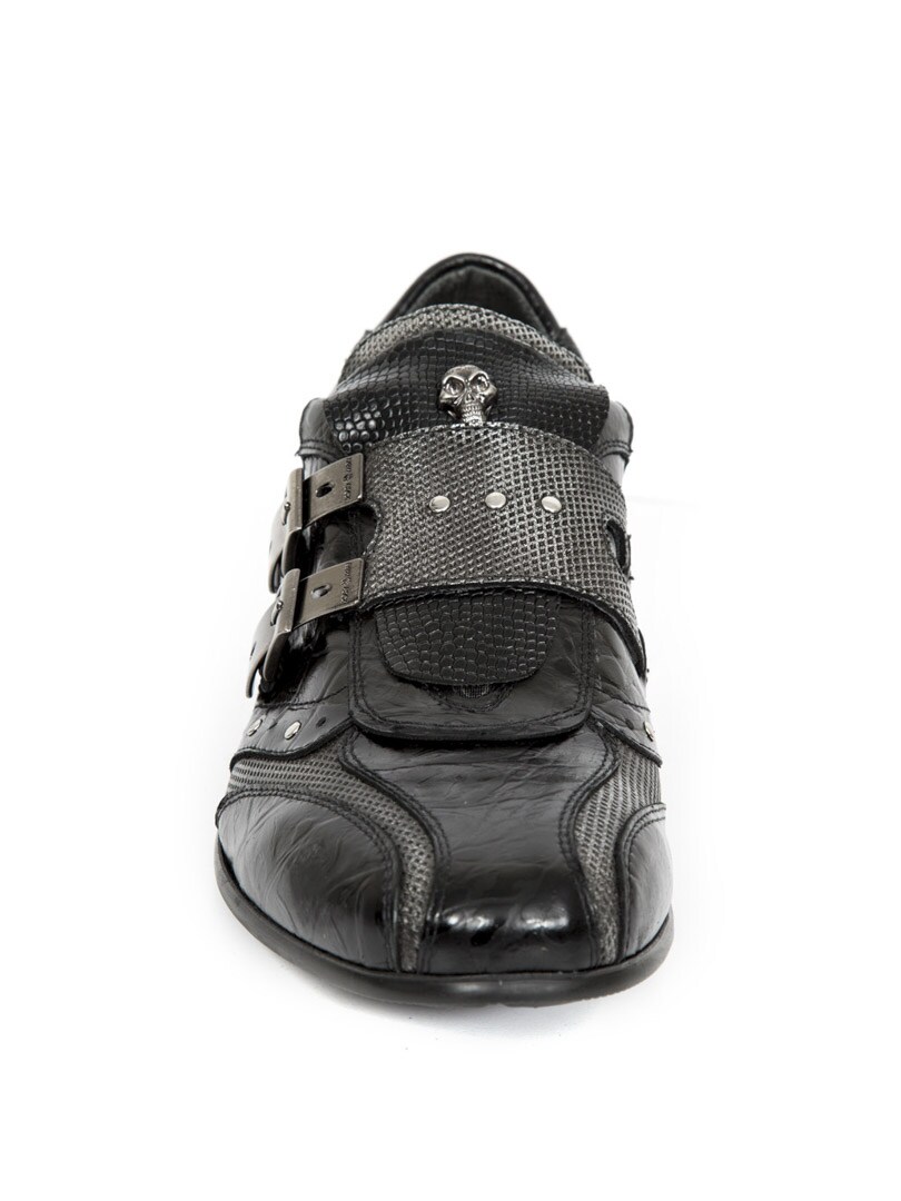 Ręcznie robione, czarne buty z prawdziwej skóry ze wzorem i niską cholewką. Są ozdobione szarymi wstawkami, nitami i skórzanym paskiem z dwiema metalowymi klamrami. Z przodu butów naszywka z czaszkami. Ten but jest dostępny w limitowanej edycji!