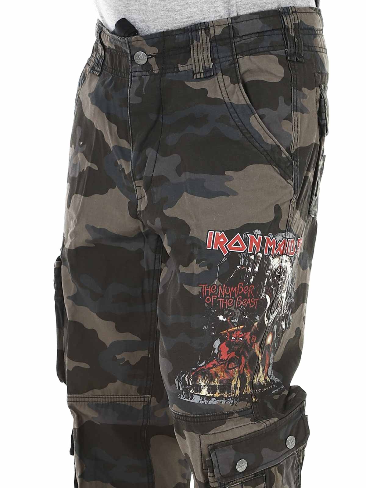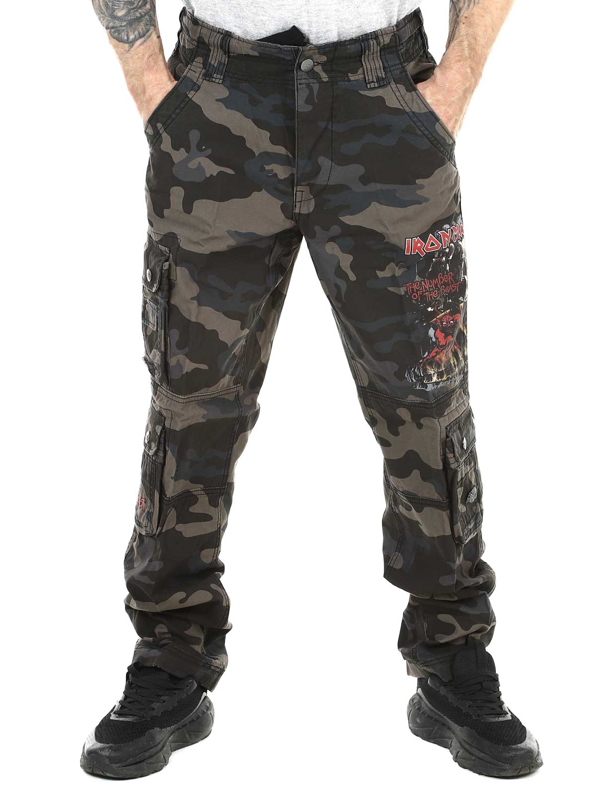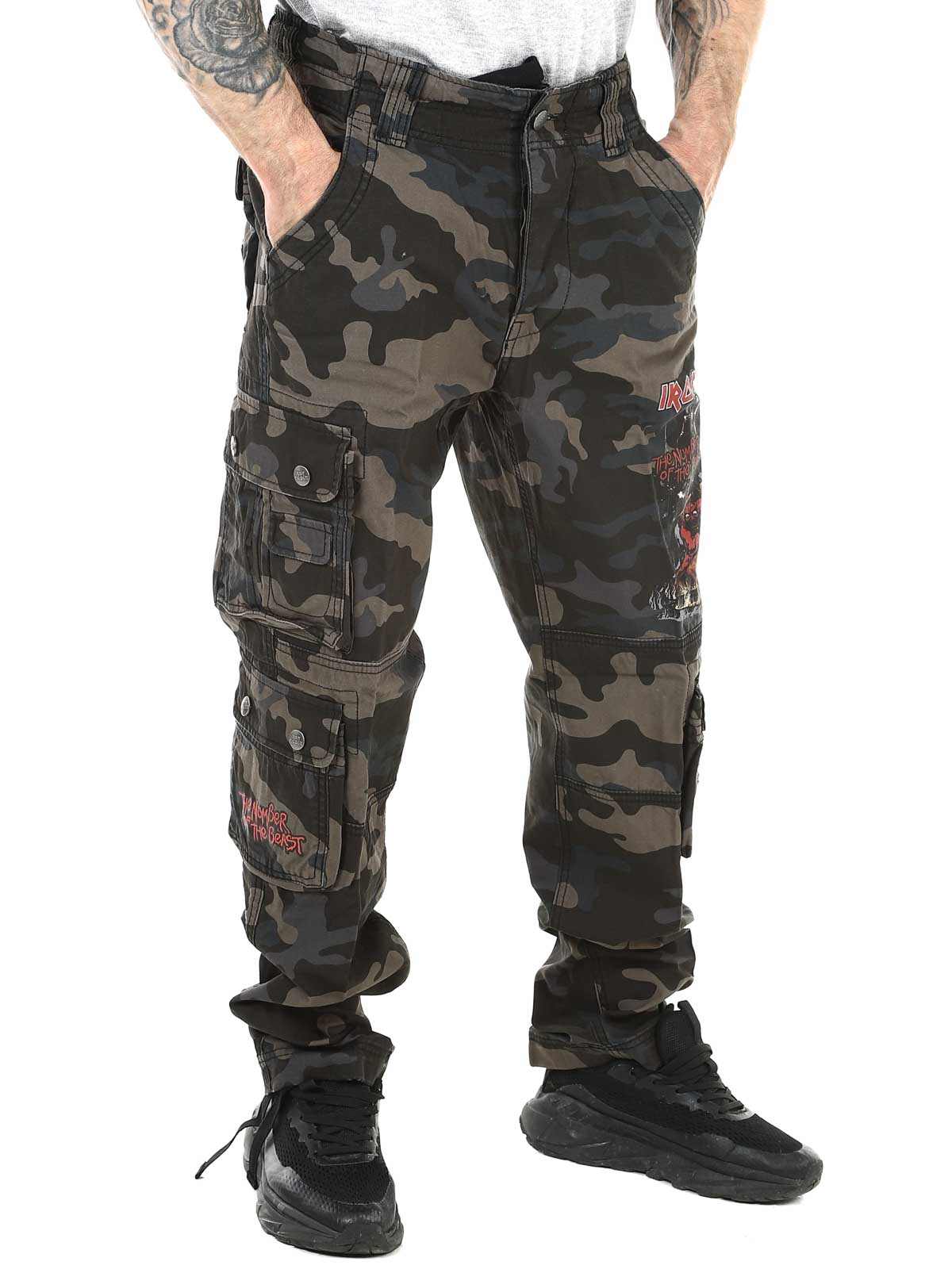 Ciemne spodnie o kroju slim fit, wykonane z wytrzymałej i przyjaznej dla skóry bawełny, zapewniającej zarówno komfort, jak i trwałość. Regulowane paski w pasie i nogawkach pozwalają łatwo dopasować rozmiar. Wyposażone w duży nadruk Iron Maiden na lewej nogawce oraz nadruk „Number of the Beast” na prawej kieszeni. Wyraźny hołd dla legendarnego zespołu heavy metalowego Iron Maiden.