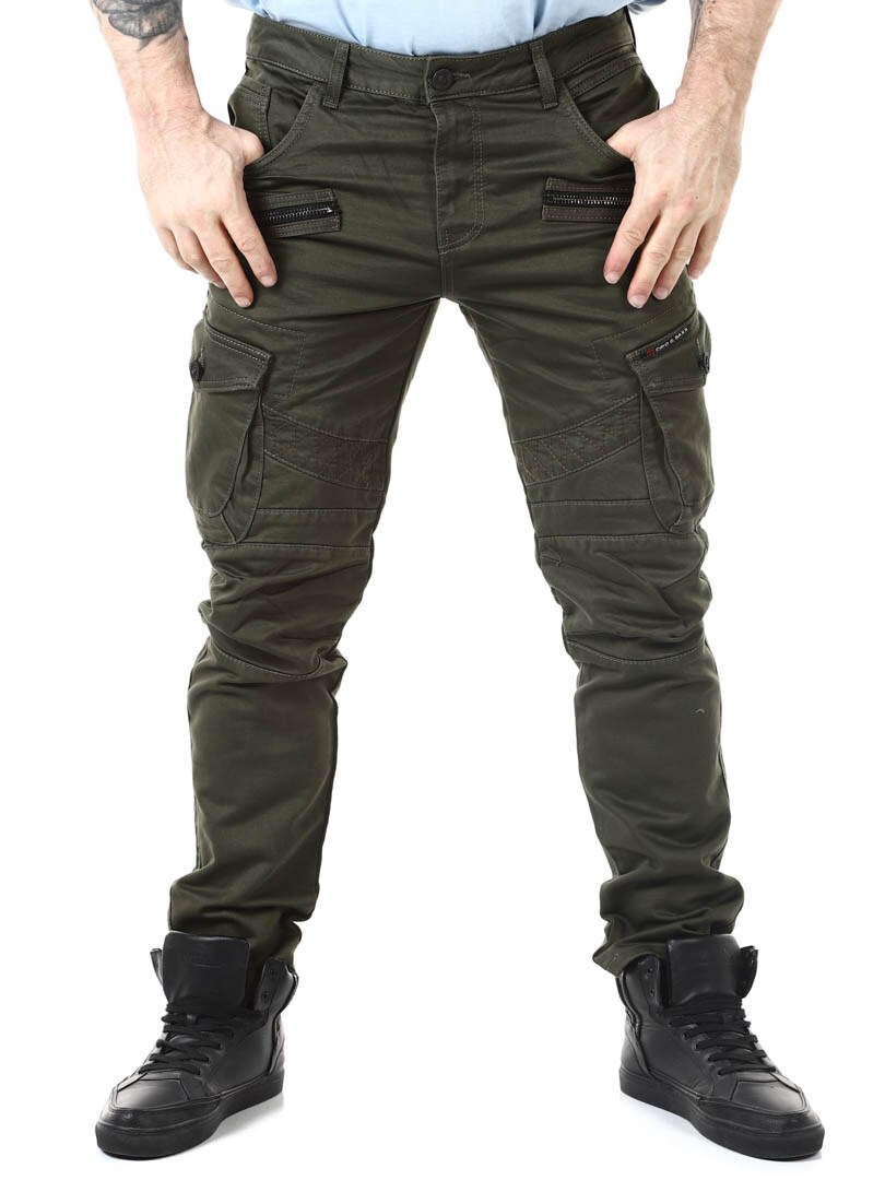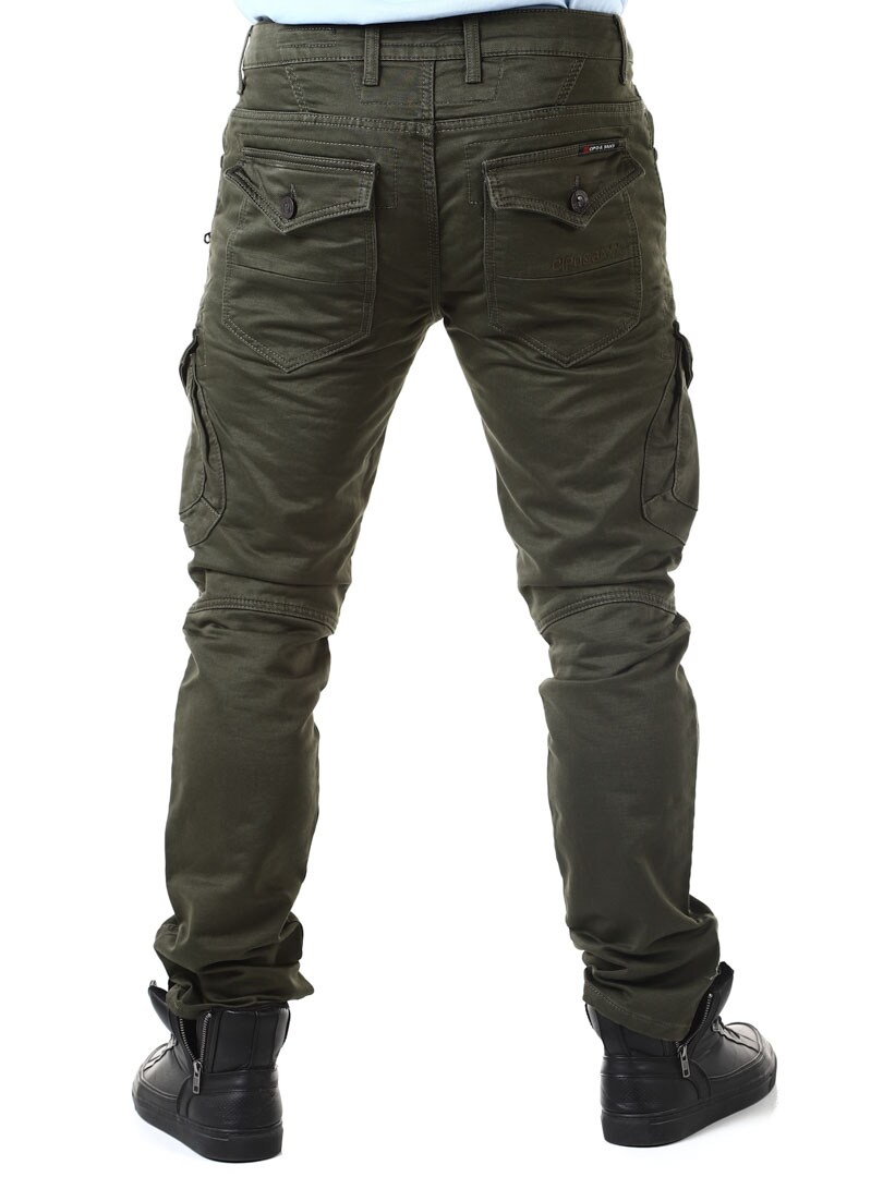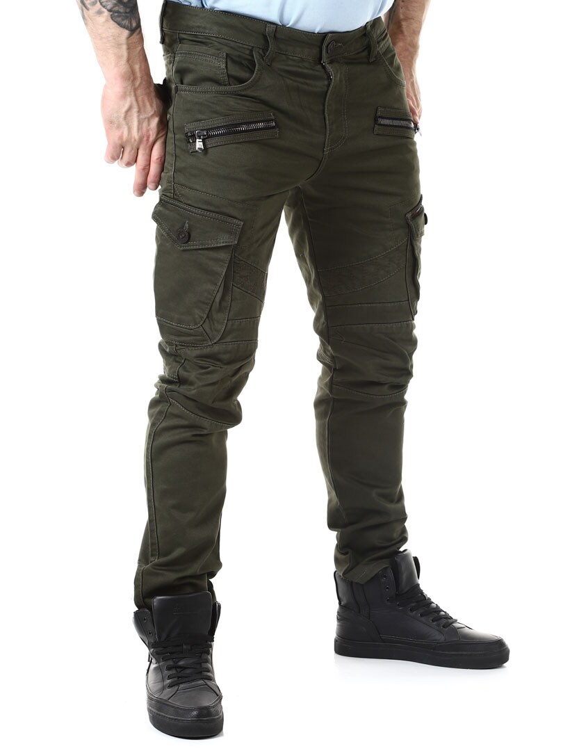 Kolor khaki z kontrastowymi metalowymi guzikami. Spodnie posiadają ciekawe, symetryczne przeszycia na udach. Dwie kieszenie boczne, dwie kieszenie na udach i dwie kieszenie z tyłu pomieszczą podręczne przedmioty. Spodnie są dobrze dopasowane, a mieszanka bawełny z pozostałymi materiałami daje uczucie komfortu. Rozporek zamykany na zamek błyskawiczny.