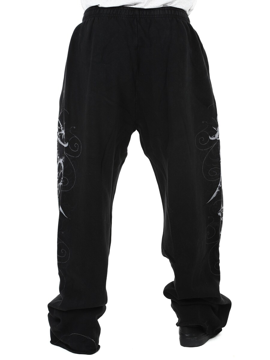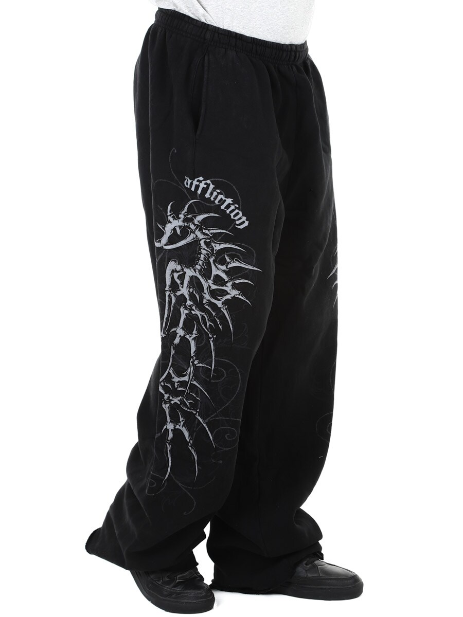 Miękkie i wygodne spodnie dresowe z wyraźnym charakterem. Czarna, sprana baza łączy się z dużymi nadrukami graficznymi wzdłuż nogawek, nadając im unikatowy wygląd. Elastyczny pas ozdobiony logo Affliction ma dodatkowo sznurek do regulacji. Szerokie nogawki tworzą swobodną sylwetkę, idealną na co dzień w rockowym stylu.